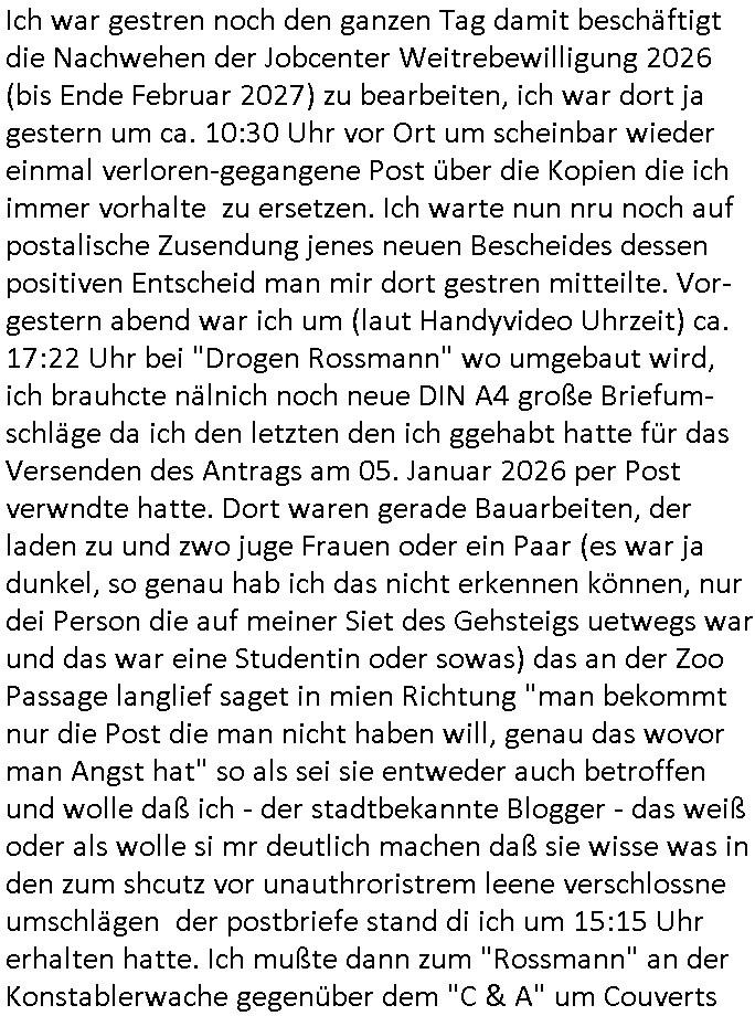 | Ich war gestren noch den ganzen Tag damit beschäftigt die Nachwehen der Jobcenter Weitrebewilligung 2026 (bis Ende Februar 2027) zu bearbeiten, ich war dort ja gestern um ca. 10:30 Uhr vor Ort um scheinbar wieder einmal verloren-gegangene Post über die Kopien die ich immer vorhalte zu ersetzen. Ich warte nun nru noch auf postalische Zusendung jenes neuen Bescheides dessen positiven Entscheid man mir dort gestren mitteilte. Vor-gestern abend war ich um (laut Handyvideo Uhrzeit) ca. 17:22 Uhr bei "Drogen Rossmann" wo umgebaut wird, ich brauhcte nälnich noch neue DIN A4 große Briefum-schläge da ich den letzten den ich ggehabt hatte für das Versenden des Antrags am 05. Januar 2026 per Post verwndte hatte. Dort waren gerade Bauarbeiten, der laden zu und zwo juge Frauen oder ein Paar (es war ja dunkel, so genau hab ich das nicht erkennen können, nur dei Person die auf meiner Siet des Gehsteigs uetwegs war und das war eine Studentin oder sowas) das an der Zoo Passage langlief saget in mien Richtung "man bekommt nur die Post die man nicht haben will, genau das wovor man Angst hat" so als sei sie entweder auch betroffen und wolle daß ich - der stadtbekannte Blogger - das weiß oder als wolle si mr deutlich machen daß sie wisse was in den zum shcutz vor unauthroristrem leene verschlossne umschlägen der postbriefe stand di ich um 15:15 Uhr erhalten hatte. Ich mußte dann zum "Rossmann" an der Konstablerwache gegenüber dem "C & A" um Couverts