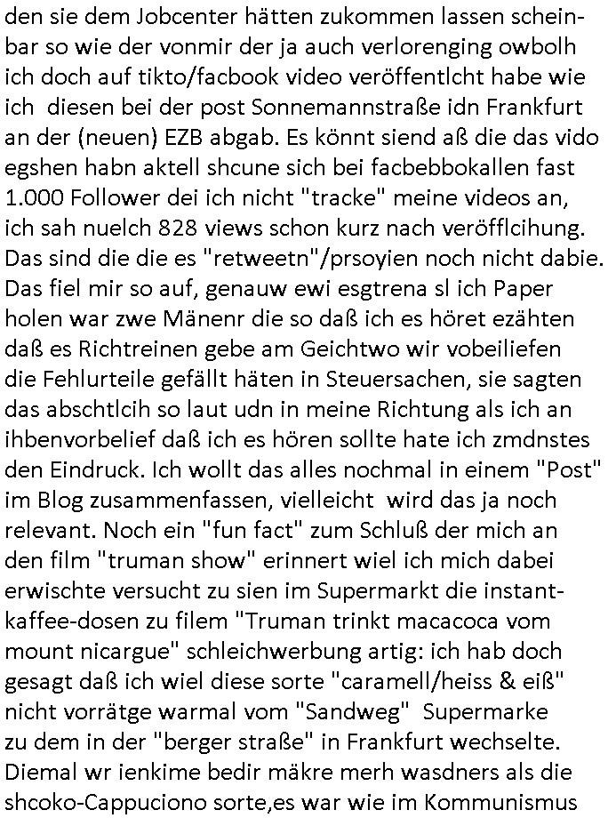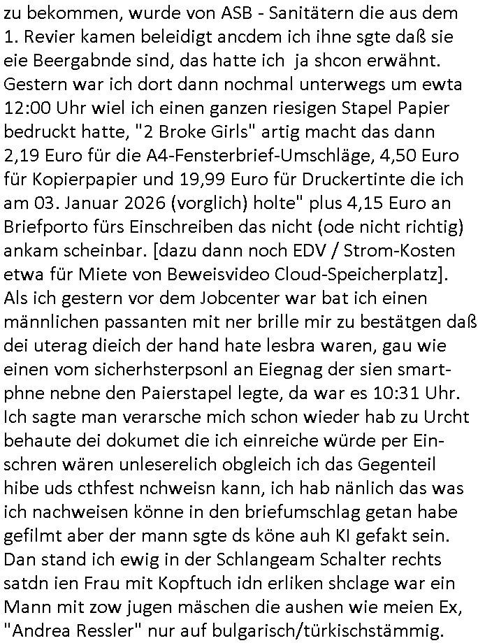 zu bekommen, wurde von ASB - Sanitätern die aus dem 1. Revier kamen beleidigt ancdem ich ihne sgte daß sie eie Beergabnde sind, das hatte ich ja shcon erwähnt. Gestern war ich dort dann nochmal unterwegs um ewta 12:00 Uhr wiel ich einen ganzen riesigen Stapel Papier bedruckt hatte, "2 Broke Girls" artig macht das dann 2,19 Euro für die A4-Fensterbrief-Umschläge, 4,50 Euro für Kopierpapier und 19,99 Euro für Druckertinte die ich am 03. Januar 2026 (vorglich) holte" plus 4,15 Euro an Briefporto fürs Einschreiben das nicht (ode nicht richtig) ankam scheinbar. [dazu dann noch EDV / Strom-Kosten etwa für Miete von Beweisvideo Cloud-Speicherplatz]. Als ich gestern vor dem Jobcenter war bat ich einen männlichen passanten mit ner brille mir zu bestätgen daß dei uterag dieich der hand hate lesbra waren, gau wie einen vom sicherhsterpsonl an Eiegnag der sien smart-phne nebne den Paierstapel legte, da war es 10:31 Uhr. Ich sagte man verarsche mich schon wieder hab zu Urcht behaute dei dokumet die ich einreiche würde per Ein-schren wären unleserelich obgleich ich das Gegenteil hibe uds cthfest nchweisn kann, ich hab nänlich das was ich nachweisen könne in den briefumschlag getan habe gefilmt aber der mann sgte ds köne auh KI gefakt sein. Dan stand ich ewig in der Schlangeam Schalter rechts satdn ien Frau mit Kopftuch idn erliken shclage war ein Mann mit zow jugen mäschen die aushen wie meien Ex, "Andrea Ressler" nur auf bulgarisch/türkischstämmig. Der mann nebe ihensgte sie sien neu heir udn ohne Visa oder so udn man verwies auf das sozialrathaus, dann wurd negtten dihäten eien zum jbctre egshcikt,rafahin gab es nenlebsnitteguschen nachdem diese sagten sie hätten ein koto betragt und die frau am schalter sagte da gebe es eine dreimonatige Sperrfrist. Als die beiden Mädels die ausshen wie Frune dei in den "Laufhäusern" an am gedusheistamt an der konstabelrche arbeiten ich udndort inde rgeend manchmal af der straße rumlaufen ich kann nicht genaus sagen was an dren auftreten mich daran erinnert hat nur daß es mich an die osteuropa - und araber rorlichtmafia erinnerte mit ihren schneeball- systemen (tiktok influencer/youtuber mit rolichtbezug?) Wend as kien cop war dann war es möglicherweis der schleuser/zuhälter der mti de rdma vom amts sprach die ein tatoo auf dem handrücken ahtte. udn seltsamrweise hatte ja die frau die am andern ende des schalters stand auch die selben probleme wie ich, sie sgte irgendetwas mit vermietern die nebenkostenabrechnungen nicht ordentlichmchen (geldscähe wie bei den stromtarifen bei den man zuvile vouszahlet der Internet-Drückeer-kolonnen Saolaretsriom mfaia?) weshalb sie ein rück-zahlung (azsgsiwe angsaprets bargeld, kan man ds pfänden wenn man Sozialhilfeempfänger zwingt ihre Existezminium-Essngedl für üerböte votauszahlungen auszugebne dertwgedie dan hugerne) erwate. Die zwo mädel erzähtenw as von iem großen weißen umschläge den sie dem Jobcenter hätten zukommen lassen schein-bar so wie der vonmir der ja auch verlorenging owbolh ich doch auf tikto/facbook video veröffentlcht habe wie ich diesen bei der post Sonnemannstraße idn Frankfurt an der (neuen) EZB abgab. Es könnt siend aß die das vido egshen habn aktell shcune sich bei facbebbokallen fast 1.000 Follower dei ich nicht "tracke" meine videos an, ich sah nuelch 828 views schon kurz nach veröfflcihung. Das sind die die es "retweetn"/prsoyien noch nicht dabie. Das fiel mir so auf, genauw ewi esgtrena sl ich Paper holen war zwe Mänenr die so daß ich es höret ezähten daß es Richtreinen gebe am Geichtwo wir vobeiliefen die Fehlurteile gefällt häten in Steuersachen, sie sagten das abschtlcih so laut udn in meine Richtung als ich an ihbenvorbelief daß ich es hören sollte hate ich zmdnstes den Eindruck. Ich wollt das alles nochmal in einem "Post" im Blog zusammenfassen, vielleicht wird das ja noch relevant. Noch ein "fun fact" zum Schluß der mich an den film "truman show" erinnert wiel ich mich dabei erwischte versucht zu sien im Supermarkt die instant-kaffee-dosen zu filem "Truman trinkt macacoca vom mount nicargue" schleichwerbung artig: ich hab doch gesagt daß ich wiel diese sorte "caramell/heiss & eiß" nicht vorrätge warmal vom "Sandweg" Supermarke zu dem in der "berger straße" in Frankfurt wechselte. Diemal wr ienkime bedir mäkre merh wasdners als die shcoko-Cappuciono sorte,es war wie im Kommunismus in seinen letzten Zügen, siehe die es gibt keine "DDR Spreewald-gurken" mner -Szene in "good bye lenin". Wo ich drauf hinwies wegn "Wolfrga Becker/Christiane Paul" Filmplakten nahe dem KULTURhaus am UHRENtürmchen. Diese Leute dei "das leben ist eine baustelle" gedreht haben (ncht zu vechslbn mit dem "Gabi Loh" "Es ist schön das leben" diese Bio-unterricht cartoon-Serie wo man Kinfoilm "ris ins iner des köpers" artig den menschlichen körper erklärt, wie weiße blutplättchen arbieten usw die men klienr buder als kidn sah hab ich ja mal kennengelernt im Schüler-zeitungs-büro und bei diesem hexenkessel 1998 (3sat KULTUR-ZEIT [wo mien Redaktionskollege Metz unterkam] presse) nachtreffen. Ich erinenr mich noch daß dasml die rede dvon war Mächn isn aldn zu shclesn die meien Ibhalte verfilmen sollten als "(rtlicht) profi Tiktoker/youtube-Influenncer" nchdem man mir die äher kautagchet hätte und das gesicht verstümmelt ("terpentin-bier" hypno-shcüsslreiz) so wollten sie mich uetr "dauebrochachtung" zwingen wgen ageblcher "SLSBNTGEFÄHRUNG", daher führe ich das blog hier um "hypno Scclüsselreize/Auswirkungen" penibel zu dkiouametren, ich eriner mcihdaß im Bereich der shcülerztusgamfai ien abrsch Frau war dei erzählte von Frun die Opfer von "Säureattacken" wurdwenn die der Calan - heisratpoltk / Anweisgn der Zuhälterei nicht folge leisten und ds Kopfushcmädchen wollte das aus Rache an Männern de sie pschalfür "shcie" hielt zeigen. War das vieleicht ie Frau von der "true Crim Folter Pr0n galasfaer neflix irnet straming Webcamgilr Mafia" die da egs