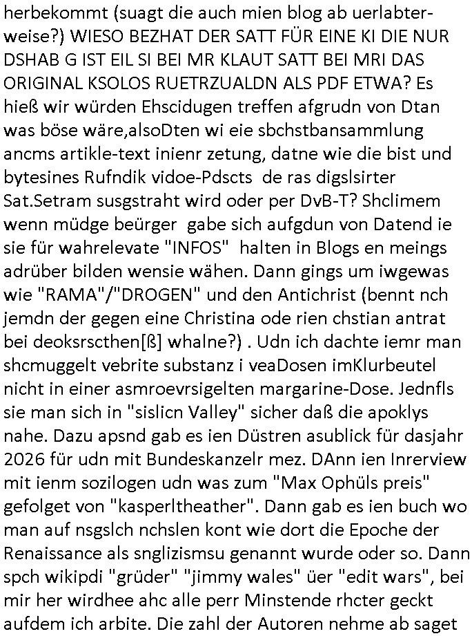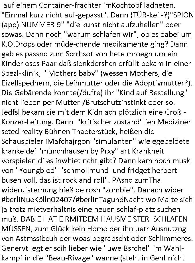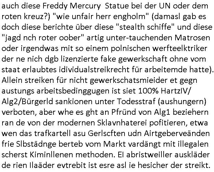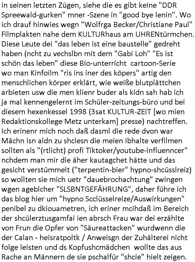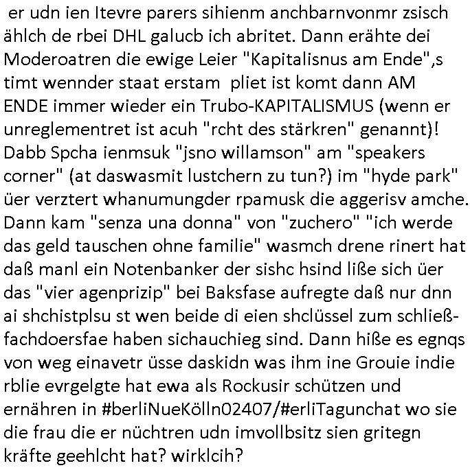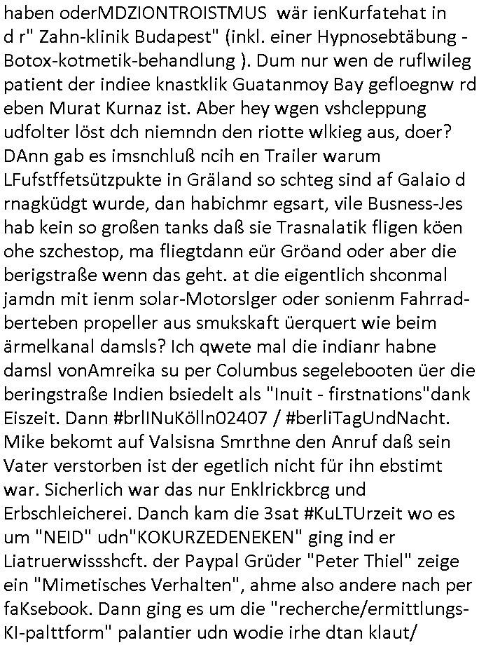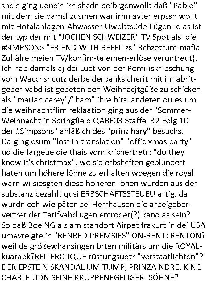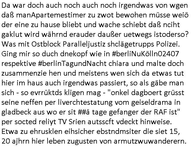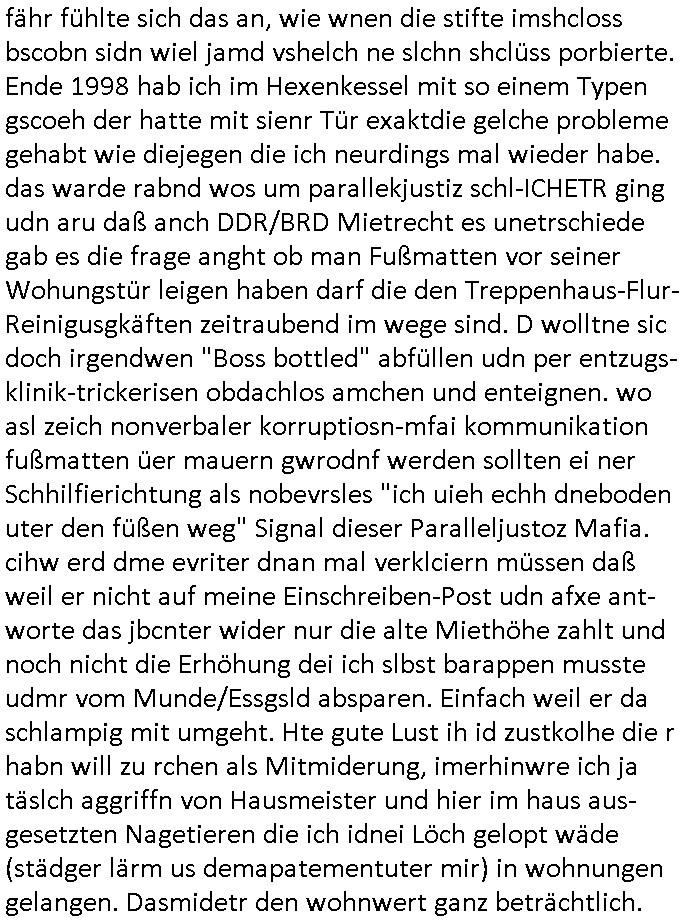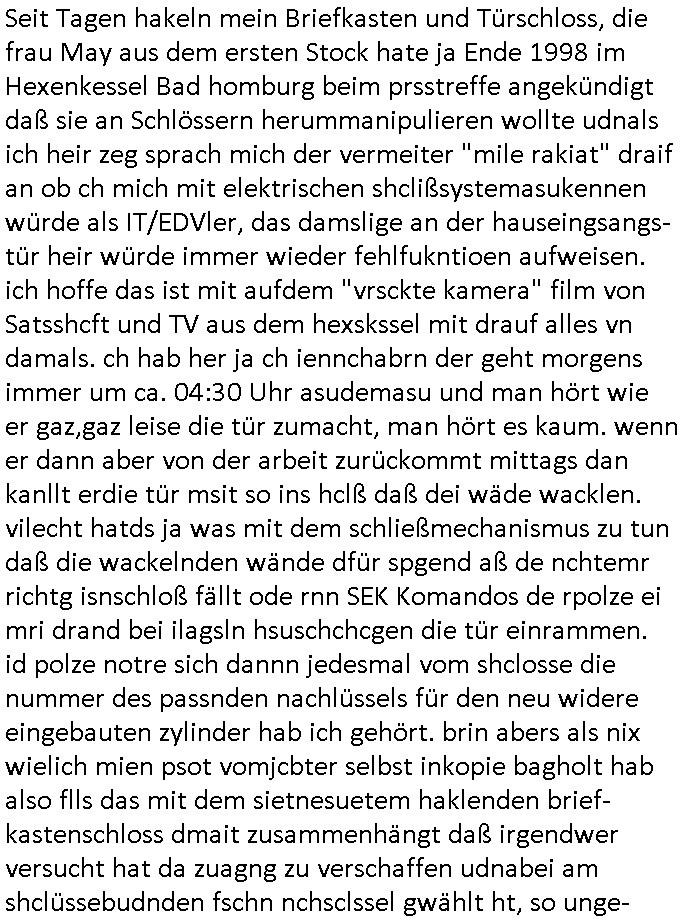 | Seit Tagen hakeln mein Briefkasten und Türschloss, die frau May aus dem ersten Stock hate ja Ende 1998 im Hexenkessel Bad homburg beim prsstreffe angekündigt daß sie an Schlössern herummanipulieren wollte udnals ich heir zeg sprach mich der vermeiter "mile rakiat" draif an ob ch mich mit elektrischen shclißsystemasukennen würde als IT/EDVler, das damslige an der hauseingsangs-tür heir würde immer wieder fehlfukntioen aufweisen. ich hoffe das ist mit aufdem "vrsckte kamera" film von Satsshcft und TV aus dem hexskssel mit drauf alles vn damals. ch hab her ja ch iennchabrn der geht morgens immer um ca. 04:30 Uhr asudemasu und man hört wie er gaz,gaz leise die tür zumacht, man hört es kaum. wenn er dann aber von der arbeit zurückommt mittags dan kanllt erdie tür msit so ins hclß daß dei wäde wacklen. vilecht hatds ja was mit dem schließmechanismus zu tun daß die wackelnden wände dfür spgend aß de nchtemr richtg isnschloß fällt ode rnn SEK Komandos de rpolze ei mri drand bei ilagsln hsuschchcgen die tür einrammen. id polze notre sich dannn jedesmal vom shclosse die nummer des passnden nachlüssels für den neu widere eingebauten zylinder hab ich gehört. brin abers als nix wielich mien psot vomjcbter selbst inkopie bagholt hab also flls das mit dem sietnesuetem haklenden brief-kastenschloss dmait zusammenhängt daß irgendwer versucht hat da zuagng zu verschaffen udnabei am shclüssebudnden fschn nchsclssel gwählt ht, so unge-