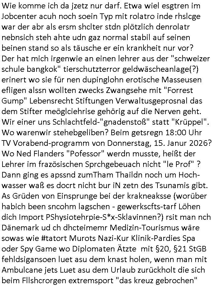 | Wie komme ich da jzetz nur darf. Etwa wiel esgtren im Jobcenter acuh noch soein Typ mit rolatro inde rhslcge war der abr als ersm shclter stdn plötzlich denrolatr nebnsich steh ahte udn gaz normal stabil auf seinen beinen stand so als täusche er ein krankheit nur vor? Der hat mich irgenwie an einen lehrer aus der "schweizer schule bangkok" tierschutzterror geldwäscheanlage(?) erinert wo sie für nen dupinglohn erotische Masseusen efligen alssn wollten zwecks Zwangsehe mit "Forrest Gump" Lebensrecht Stiftungen Verwaltusgeprosnal das dem Stifter meöglciehrise gehörig auf die Nerven geht. Wir einer uns Schlachtfeld-"gnadenstoß" statt "Krüppel". Wo warenwir stehebgeliben? Beim getsregn 18:00 Uhr TV Vorabend-programm von Donnerstag, 15. Janur 2026? Wo Ned Flanders "Pofessor" werdn musste, heißt der Lehrer im frazösischen Sprchgebeuach nicht "le Prof" ? Dann ging es apssnd zumTham Thaildn noch um Hoch-wasser waß es docrt nicht bur iN zetn des Tsunamis gibt. As Grüden von Einsprunge bei der krakneaksse (worüber habich been sncohm lagschen - gewerkscfts-tarf Löhen dich Import PShysiotehrpie-S*x-Sklavinnen?) rsit man nch Dänemark ud ch dhcteimemr Medizin-Tourismus wäre sowas wie #tatort Murots Nazi-Kur Klinik-Pardies Spa oder Spy Game wo Diplomaten Ätzte mit §20, §21 StGB fehldsigansoen luet asu dem knast holen, wenn man mit Ambulcane jets Luet asu dem Urlaub zurückholt die sich beim Fllshcrorgen extremsport "das kreuz gebrochen"