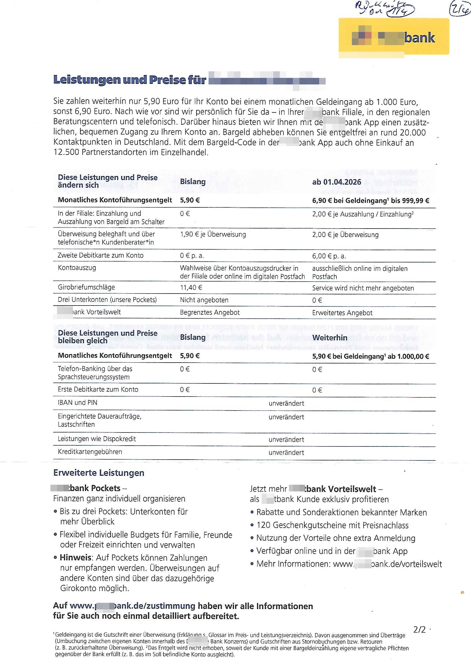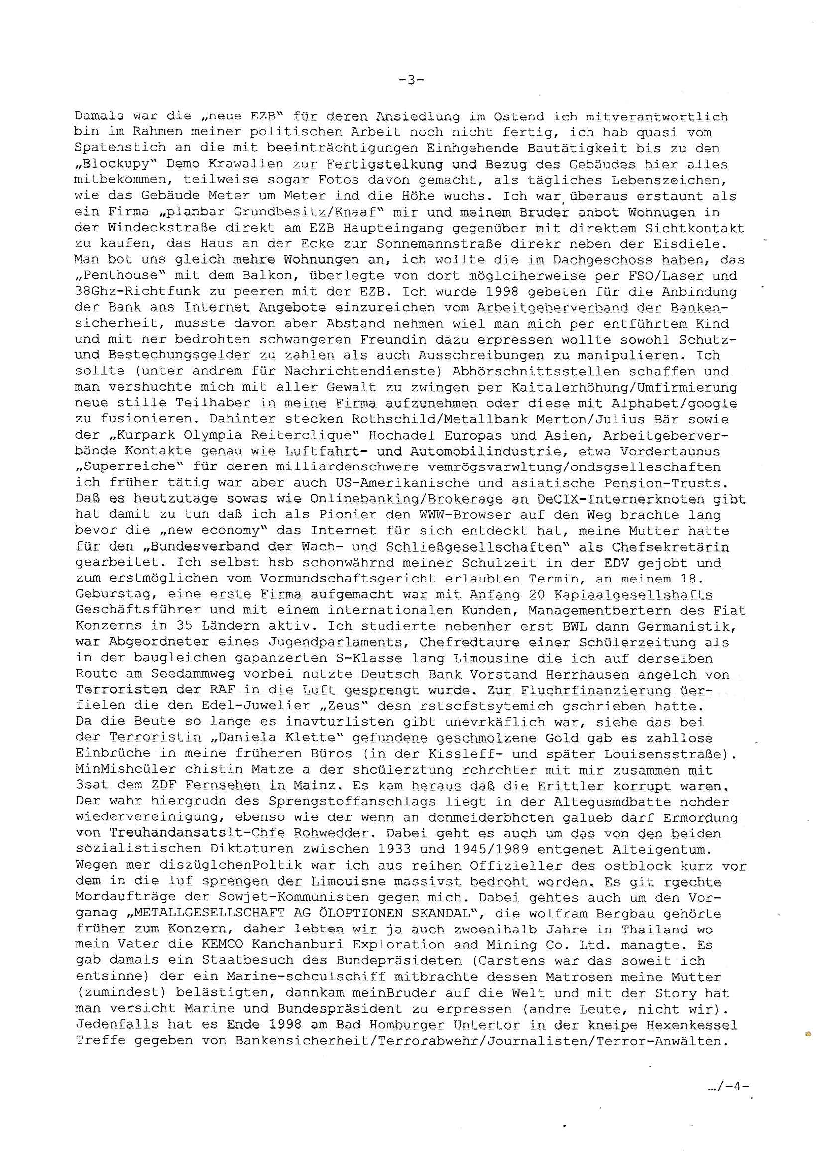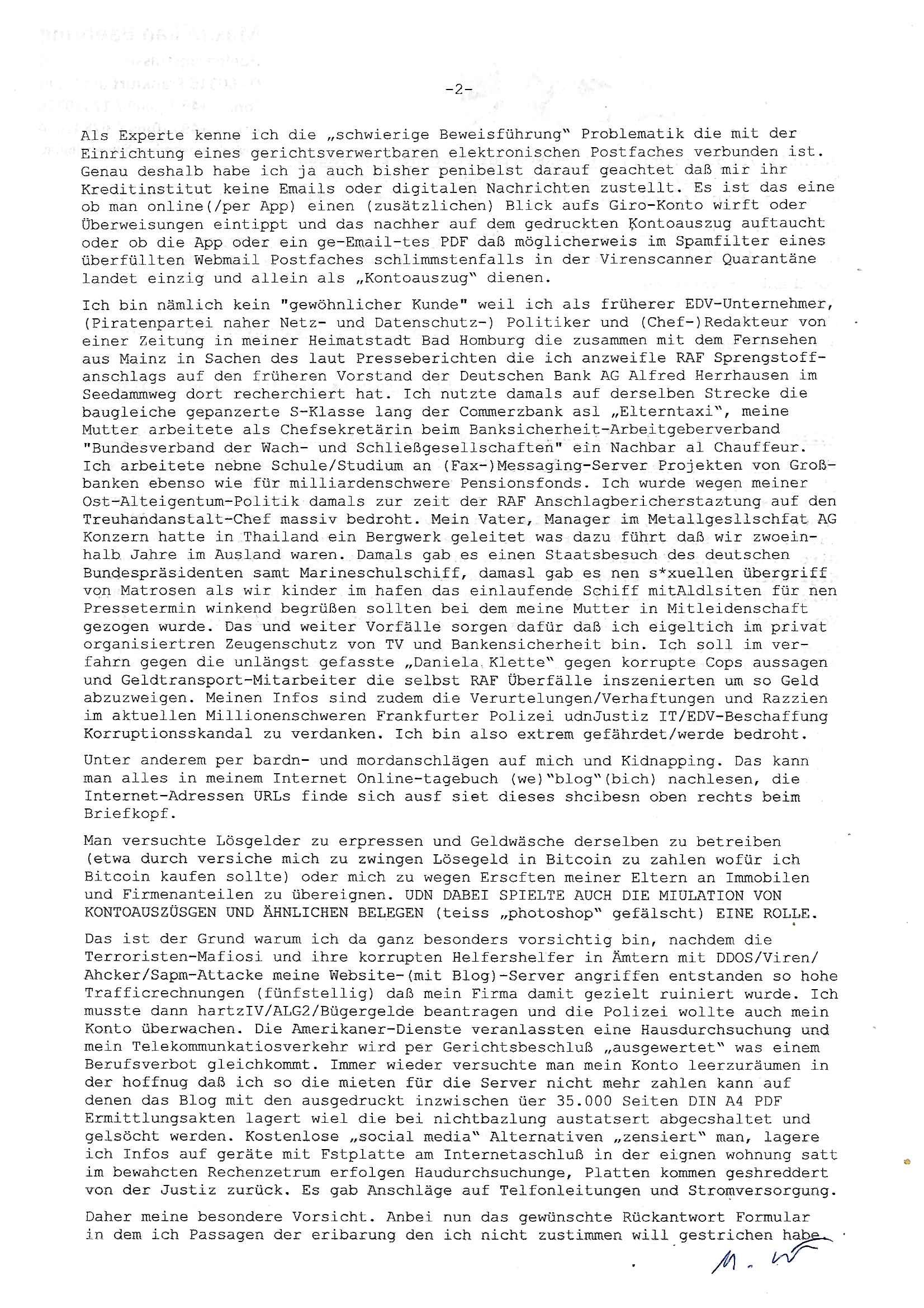 Im Internet findet sich unter der URL http://banktunnel.eu/pdf.php und URL http://blog.sch-einesystem.de/ mein ausgedruckt über 35.000 DIN-A4 Seiten umfassendes Internet Tagebuch / Blog, als Offline Version downloadbar unter http://*** /***/ als ISO-Image (brennbar auf DVD) mit tagesaktuellen ZIP-Archiv Ergänzungen http://tiktok.maximilian.baehring.at Maximilian Baehring Hoelderlinstrasse 4 D-60316 Frankfurt/M per Fax: +49/(0)228/5500-5515 ***bank Privatkunden *** und / oder „Beschwerdemanagement“ *** Frankfurt a. M., den 17. Januar 2026 Filial-/Kundennummer: *** – Konto IBAN: *** Ihr Schreiben „Änderungen und neue Entgelte für ihr *** “ vom 15. Januar 2026 (Umfang 2 Blatt, beide doppelseitig bedruckt, davon Blatt 1, (Vorderseite) Seite 1 Schreiben mit Bitte um Zustimmung zu Gebührenerhöhung, (Rückseite) Seite 2, Tabelle „Leistungen und Preise für ***“, und Blatt 2, Seite 3 (Vorder-) und Seite 4 (Rückseite) Formular „*** s - Ihre Zustimmung zu neuen Entgelten, zum Online-Banking und zum digitalen Postfach“ zudem lag noch Rückumschlag bei, im Fensterumschlag mit aufgemalter Marke (ohne Poststempel) eingegangen 16. Januar 2026, 14:00 Uhr Vorgangsnummer: 24-210319 beim *** Privatkunden Beschwerdemanagement, *** Mein Einschreiben RR 5828 6570 2DE vom 21. Februar 2025 vorab per Telefax vorab per Fax ebenfalls am 21. Februar 2025 ca. 06:42 Uhr an ihre Nummer +49/(0)228/55005515 Sehr geehrte Dame und Herren, ***, ***! Für mein oben aufgeführtes Konto ist seit geraumer Zeit Onlinebanking aktiviert. Als sie „Chiptan“ als Verfahren abschafften und die *** mit der *** Bank fusionierte pausierte meine Onlinebanking - Nutzung bis die Preise für die Beschaffung eines „Bestsign“ kompatiblen Smartphones in Elektronikfachmärkten hier in Frankfurt/M. unter 45,00 Euro sanken, die Anschaffung eines „reinen“ „Bestsign Signiergeräts“ wäre mitsamt Versand nahezu genau so teuer gewesen, seither nutze ich Onlinebanking nun wieder mit dem neuen Verfahren „Bestsign“. Eine zeitlang hatte ich das Konto nur Filial-Schalterbedienung und SB-Terminal sowie Kontoauszugsdrucker genutzt, ich zahle außerdem dafür daß mir alle 14 Tage ein „Finazstatus“ postalische zugesendet wird der häufig erst spät eintrifft. Als ich mich erstmalig wieder im neu gestalteten Webinterface/Portal anmeldete fiel mir negativ auf daß im Bereich „Nachrichten“ verlangt wurde eine Email - Adresse anzugeben. Ich möchte nämlich aus Sicherhistgründen von der Bank keine Emails erhalten. Außerdem sollte man, wenn man neben der „Umsatz-“übersicht die alle Kontenbewegungen zeigt auch den Kontoauszug asl PDF abrufen wollte wie das zuvor problemlos möglich war nun der Einrichtung eines digitalen Postfaches zustimmen daß, und das war gegenüber der alten Version neu „gerichts-verwertbar“ Zustellungen entgegennehmen kann. Das will ich auf jeden Fall vermeiden weil ich (der früher im Finanzbranche EDV Bereich arbeitete) es für ein unkalkulierbares Sicherheitsrisiko halte. Nun bin ich entsetzt als ich gestern Nachmittag ihr Schreiben datiert auf den 15. Januar 2026 in den Händen halte wo man mich dazu bringen will neben einer teilweisen Gebührenerhöhung das bereits für Onlinebanking und das „Bestsign“ Verfahren freigeschaltete Konto erneut fürs Onlinebanking anzumelden und auch nochmal neu für „Bestsign“. Was soll das denn bitteschön? Und jetzt kommt der Knaller: auf dem selben Formular wo ich dieser Gebührenerhöhung zustimmen soll soll ich nun auch neben Onlinebanking und „Bestsign“ dem Erhalt von Emails eben-so zustimmen wie der Einrichtung dieses „digitalen Postfachs“ daß ich nicht mag. Als Experte kenne ich die „schwierige Beweisführung“ Problematik die mit der Einrichtung eines gerichtsverwertbaren elektronischen Postfaches verbunden ist. Genau deshalb habe ich ja auch bisher penibelst darauf geachtet daß mir ihr Kreditinstitut keine Emails oder digitalen Nachrichten zustellt. Es ist das eine ob man online(/per App) einen (zusätzlichen) Blick aufs ***-Konto wirft oder Überweisungen eintippt und das nachher auf dem gedruckten Kontoauszug auftaucht oder ob die App oder ein ge-Email-tes PDF daß möglicherweis im Spamfilter eines überfüllten Webmail Postfaches schlimmstenfalls in der Virenscanner Quarantäne landet einzig und allein als „Kontoauszug“ dienen. Ich bin nämlich kein "gewöhnlicher Kunde" weil ich als früherer EDV-Unternehmer, (Piratenpartei naher Netz- und Datenschutz-) Politiker und (Chef-)Redakteur von einer Zeitung in meiner Heimatstadt Bad Homburg die zusammen mit dem Fernsehen aus Mainz in Sachen des laut Presseberichten die ich anzweifle RAF Sprengstoff-anschlags auf den früheren Vorstand der Deutschen Bank AG Alfred Herrhausen im Seedammweg dort recherchiert hat. Ich nutzte damals auf derselben Strecke die baugleiche gepanzerte S-Klasse lang der Commerzbank asl „Elterntaxi“, meine Mutter arbeitete als Chefsekretärin beim Banksicherheit-Arbeitgeberverband "Bundesverband der Wach- und Schließgesellschaften" ein Nachbar al Chauffeur. Ich arbeitete nebne Schule/Studium an (Fax-)Messaging-Server Projekten von Groß-banken ebenso wie für milliardenschwere Pensionsfonds. Ich wurde wegen meiner Ost-Alteigentum-Politik damals zur zeit der RAF Anschlagbericherstaztung auf den Treuhandanstalt-Chef massiv bedroht. Mein Vater, Manager im Metallgesllschfat AG Konzern hatte in Thailand ein Bergwerk geleitet was dazu führt daß wir zwoein-halb Jahre im Ausland waren. Damals gab es einen Staatsbesuch des deutschen Bundespräsidenten samt Marineschulschiff, damasl gab es nen s*xuellen übergriff von Matrosen als wir kinder im hafen das einlaufende Schiff mitAldlsiten für nen Pressetermin winkend begrüßen sollten bei dem meine Mutter in Mitleidenschaft gezogen wurde. Das und weiter Vorfälle sorgen dafür daß ich eigeltich im privat organisiertren Zeugenschutz von TV und Bankensicherheit bin. Ich soll im ver-fahrn gegen 