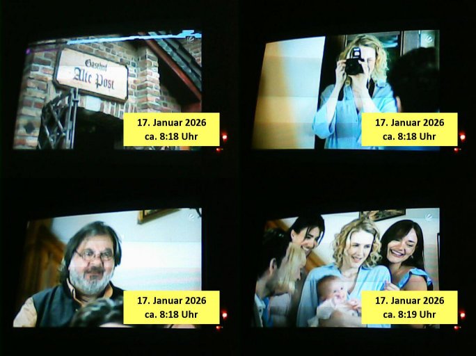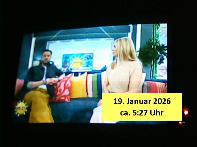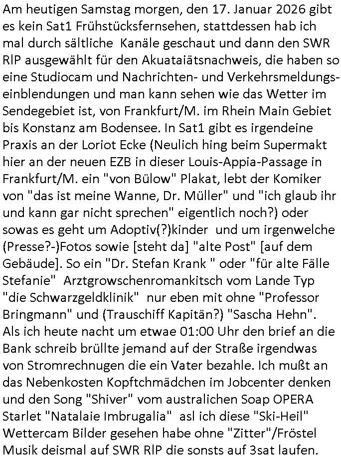 | Am heutigen Samstag morgen, den 17. Januar 2026 gibt es kein Sat1 Frühstücksfernsehen, stattdessen hab ich mal durch sältliche Kanäle geschaut und dann den SWR RlP ausgewählt für den Akuataiätsnachweis, die haben so eine Studiocam und Nachrichten- und Verkehrsmeldungs-einblendungen und man kann sehen wie das Wetter im Sendegebiet ist, von Frankfurt/M. im Rhein Main Gebiet bis Konstanz am Bodensee. In Sat1 gibt es irgendeine Praxis an der Loriot Ecke (Neulich hing beim Supermakt hier an der neuen EZB in dieser Louis-Appia-Passage in Frankfurt/M. ein "von Bülow" Plakat, lebt der Komiker von "das ist meine Wanne, Dr. Müller" und "ich glaub ihr und kann gar nicht sprechen" eigentlich noch?) oder sowas es geht um Adoptiv(?)kinder und um irgenwelche (Presse?-)Fotos sowie [steht da] "alte Post" [auf dem Gebäude]. So ein "Dr. Stefan Krank " oder "für alte Fälle Stefanie" Arztgrowschenromankitsch vom Lande Typ "die Schwarzgeldklinik" nur eben mit ohne "Professor Bringmann" und (Trauschiff Kapitän?) "Sascha Hehn".
