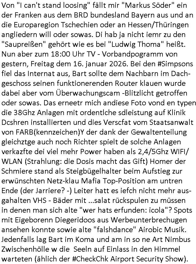 | Von "I can't stand loosing" fällt mir "Markus Söder" ein der Franken aus dem BRD bundesland Bayern aus und an die Europaregion Tschechien oder an Hessen/Thüringen angliedern will oder sowas. Di hab ja nicht iemr zu den "Saupreißen" gehört wie es bei "Ludwig Thoma" heißt. Nun aber zum 18:00 Uhr TV - Vorbandpogramm von gestern, Freitag dem 16. januar 2026. Bei den #Simpsons fiel das Internat aus, Bart sollte dem Nachbarn im Dach-geschoss seinen funktionerenden Router klauen wurde dabei aber vom Überwachungscam -Blitzlicht getroffen oder sowas. Das erneetr mich andiese Foto vond en typen die 38Ghz Anlagen mit ordentlche sdleistung auf Klinik Dcshren installierten und dies Verscfat vom Staatsanwalt von FARB(kennzeichen)Y der dank der Gewaltenteilung gleichztge auch noch Richter spielt de solche Anlagen verkazfte dei viel mehr Power haben als 2,4/5Ghz WIFI/ WLAN (Strahlung: die Dosis macht das Gift) Homer der Schmiere stand als Steigbügelhalter beim Aufstieg zur erwünschten Netz-klau Mafia Top-Position am untren Ende (der Jarriere? -) Leiter hatt es iefch nicht mehr aus-gahalten VHS - Bäder mit ...salat rückspulen zu müssen in denen man sich alte "wer hats erfunden: icola"? Spots mit Eigeborenn Diegeridoos aus Werbeunterbrechugen ansehen konnte sowie alte "falshdance" Airobic Musik. Jedenfalls lag Bart im Koma und am in so ne Art Nimbus Zwischenhölle w die Seeln auf Einlass in den Himmel warteten (ählich der #CheckChk Airport Security Show).