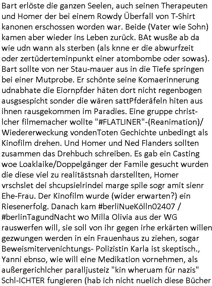 Bart erlöste die ganzen Seelen, auch seinen Therapeuten und Homer der bei einem Rowdy Überfall von T-Shirt kanonen erschossen worden war. Beide (Vater wie Sohn) kamen aber wieder ins Leben zurück. BAt wusße ab da wie udn wann als sterben (als knne er die abwurfzeit oder zertüderteminpunkt einer atombombe oder sowas). Bart sollte von ner Stau-mauer aus in die Tiefe springen bei einer Mutprobe. Er schönte seine Komaerinnerung udnabhate die Eiornpfder häten dort nicht regenbogen ausgsespicht sonder die wären sattPfderäfeln hiten aus ihnen rausgekommen im Paradies. Eine gruppe christ-lcher filmemacher wollte "#FLATLINER"-(Reanimation)/ Wiedererweckung vondenToten Gechichte unbedingt als Kinofilm drehen. Und Homer und Ned Flanders sollten zusammen das Drehbuch schreiben. Es gab ein Casting woe Loaklaike/Doppelgänger der Famile gesucht wurden die diese viel zu realitästsnah darstellten, Homer vrschslet dei shcupsielrindei marge spile sogr amit sienr Ehe-Frau. Der Kinofilm wurde (wider erwarten?) ein Riesenerfolg. Danach kam #berliNueKölln02407 / #berlinTagundNacht wo Milla Olivia aus der WG rauswerfen will, sie soll von ihr gegen irhe erkärten willen gezwungen werden in ein Frauenhaus zu ziehen, sogar Beweismitervenichtungs- Polizistin Karla ist skeptisch., Yanni ebnso, wie will eine Medikation vornehmen, als außergerichlcher paralljusteiz "kin wheruam für nazis" Schl-ICHTER fungieren (hab ich nicht nuelich diese Bücher über Miet-recht mit schwerpunkt in Thailand gezeiegt auf "http://tiktok.maximilian.baehring.at" die ganz seltsm am Cafe am Zoo auf einer fensterbank herulsgen?) zwischen Olivia, Mial udn den zuhätren damitdei Zuhälter nicht in den Knast müssen soll Opfer olivia Pillen schlucken die sie verhadlungsunfähig Ruhigstellen? Warum entfernt man nicht gleich noch Narben als spuren von den Prügeln die Olivia bezogen hat dmaitsie fsich geboTOxt "makellso faltenfrei" in die vehdlug kommt? da wirkt sich doch bestimmt postv auf den protituierten markt-wert aus wenn ne Nutte auf Kundefang kein blaues Auge (Veilchen) aus häßlicher Gewalt hat (so wie ich damals von meiner tunhallenhcste kita-ehefrau), oder? Bi de gelgnhet könte man dann auch noch per Hypnose-Schlüsselriz-therapie voher einstuderte aussagen für die vahdlung bei gericht "trainieren" damit die "true crime f0lter pr0n" mafia cagilr zuhäte agartert stafrei ausgeht. Danach kam dei 3sat #kuLTUhr-zeit wo Auto "Joe Nesb0" (da ist so ein Akzet doe rumlate stcrh duch den Bcuh-satben O gewesen glaube ich wi be ner Computer Null) was über ICE-Abschiebe Krimis in Minnesotae erzählte. Ich wußte gar nicht daß Siemens(?) dahin klinatsiertee schnellzüge der Bahn exportiert. Ist das billiger so eine Abschiebug per Zug statt nem Film #ConAir atgen Flug?Dann gings um "Jäger in Grönland": "ganz dünnes Eis". Dann Kinderbuchtipps, etwa über Washbären dei sich aus Containern ernährten udn dan auf einem Container-frachter imKochtopf ladneten. "Einmal kurz nicht auf-gepasst". Dann (TÜR-keil-?)"SPION (app) NUMMER 9" "die kunst nicht aufzuhellen" oder sowas. Dann noch "warum schlafen wir", ob es dabei um K.O.Drops oder müde-chende medikamente ging? Dann gab es passnd zum Scrrhsot von hete mroegn um ein Kinderloses Paar daß sienkdershcn erfüllt bekam in einer Spezl-klinik, "Mothers baby" (wessen Mothers, die Eizellspednern, die Leihmutter oder die Adoptivmutter?). Die Gebärende konnte(/dufte) ihr "Kind auf Bestellung" nicht lieben per Mutter-/Brutschutzinstinkt oder so. Jedfsl bekam sie mit dem Kidn ach plötzlich eine Groß - Konzer-Leitung. Dann "kritischer zustand" ien Mediziner scted reality Bühnen Thaeterstück, heißen die Schauspieler iMafchajrgon "simulanten" wie egebeldete kranke dei "münchhausen by Prxy" art Krankheit vorspielen di es inwhiet ncht gibt? Dann kam noch musk von "Youngblod" "schmollmund und fridget herbert-busen voll, das ist rock and roll". PAsnd zumTha widerufsterhung hieß de rosn "zombie". Danach wider #berliNueKölln02407/#berlinTagundNacht wo Malte sich ja trotz mietverhältnis eine neuen schlaf-platz suchen muß. DABIE HAT E RMITDEM HAUSMEISTER SCHLAFEN MÜSSEN, zum Glück kein Homo der ihn uetr Ausnutzng von Astmssibcuh der woas begrapscht oder Schlimmeres. Genervt legt er scih lieber wie "uwe Bsrchel" im Wahl-kampf in die "Beau-Rivage" wanne (steht in Genf nicht auch diese Freddy Mercury Statue bei der UN oder dem roten kreuz?) "wie unfair herr engholm" (damasl gab es doch diese berichte über diese "stealth schiffe" und diese "jagd nch roter oober" artig unter-tauchenden Matrosen oder irgendwas mit so einem polnischen werfteelktriker der ne nich dgb lizenzierte fake gewerkschaft ohne vom staat erlaubtes idividualstreikrecht für arbeitemde hatte). Allein streiken für nicht gewerkschatsmieider et gegn austungs arbeitsbedinggugen ist siet 100% HartzIV/ Alg2/Bürgerld sankionen unter Todesstraf (aushungern) verboten, aber whe es ght an Pfründ von Alg1 beziehern ran de von der modernen Sklavnhaterei pofitieren, etwa wen das trafkartell asu Gerlscften udn Airtgeberveänden frie Slbstädnge berteb vom Markt vardängt mit illegalen scherst Kiminllenen methoden. EI abristweiller auskläder de rien Ilaäder evtrebit ist esre asl ie hesicher der streikt. https://tvinfo.de/fernsehprogramm/2281297742-die-simpsons https://tvinfo.de/fernsehprogramm/2281297748-die-simpsons https://tvinfo.de/fernsehprogramm/2264471673-kulturzeit | |