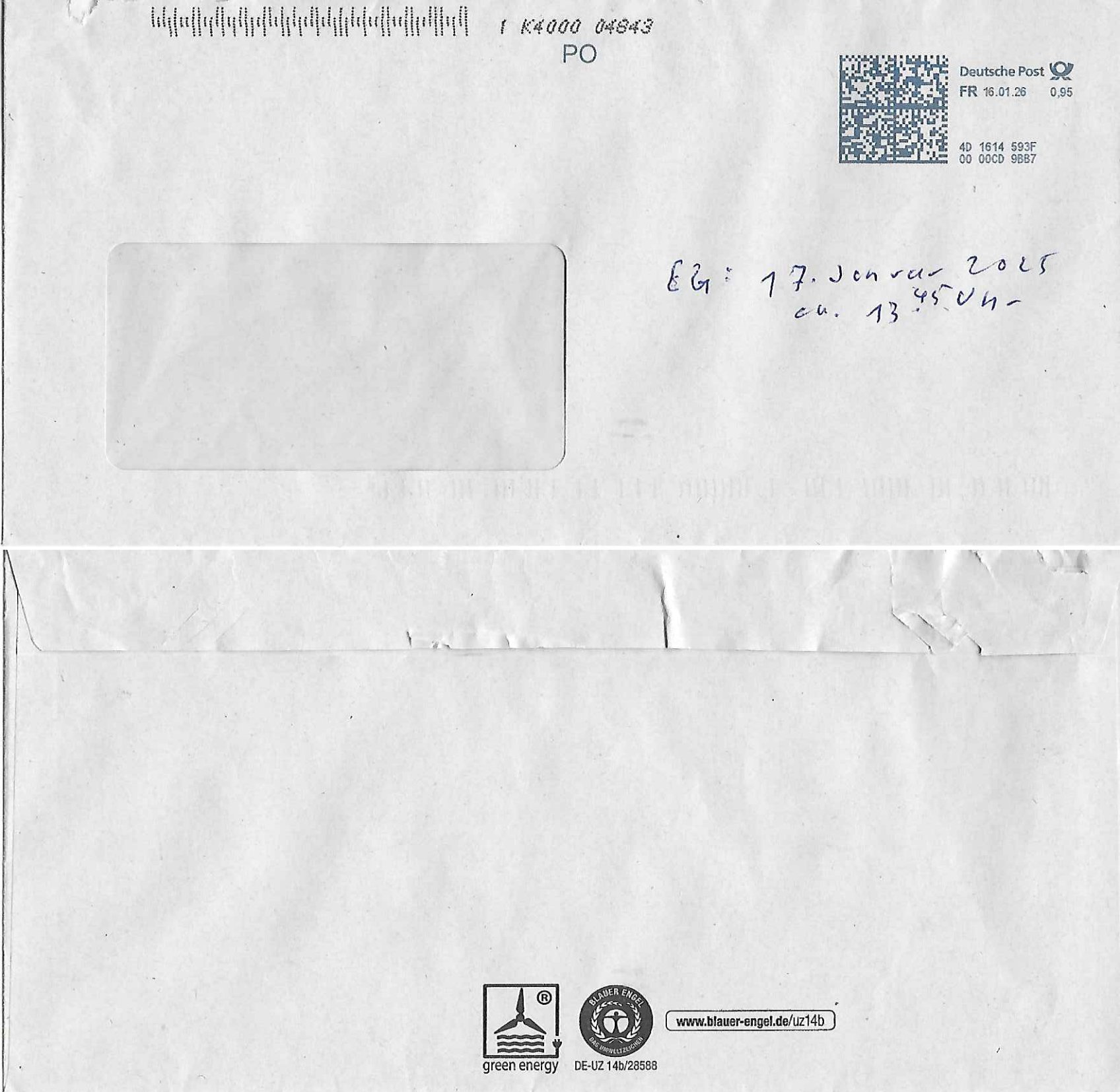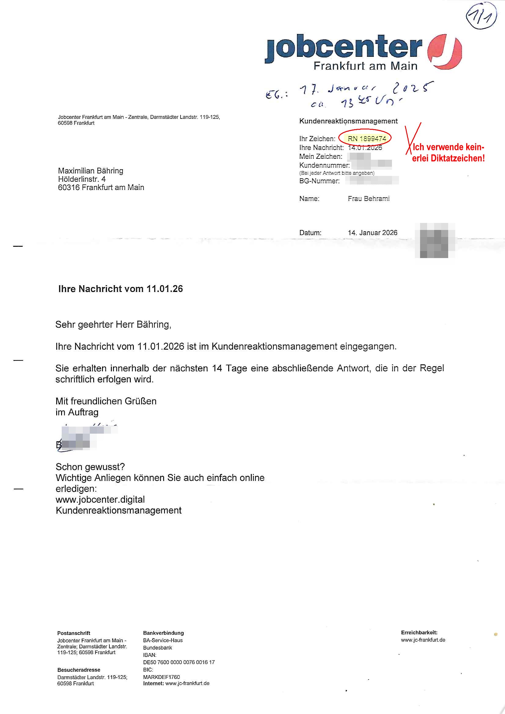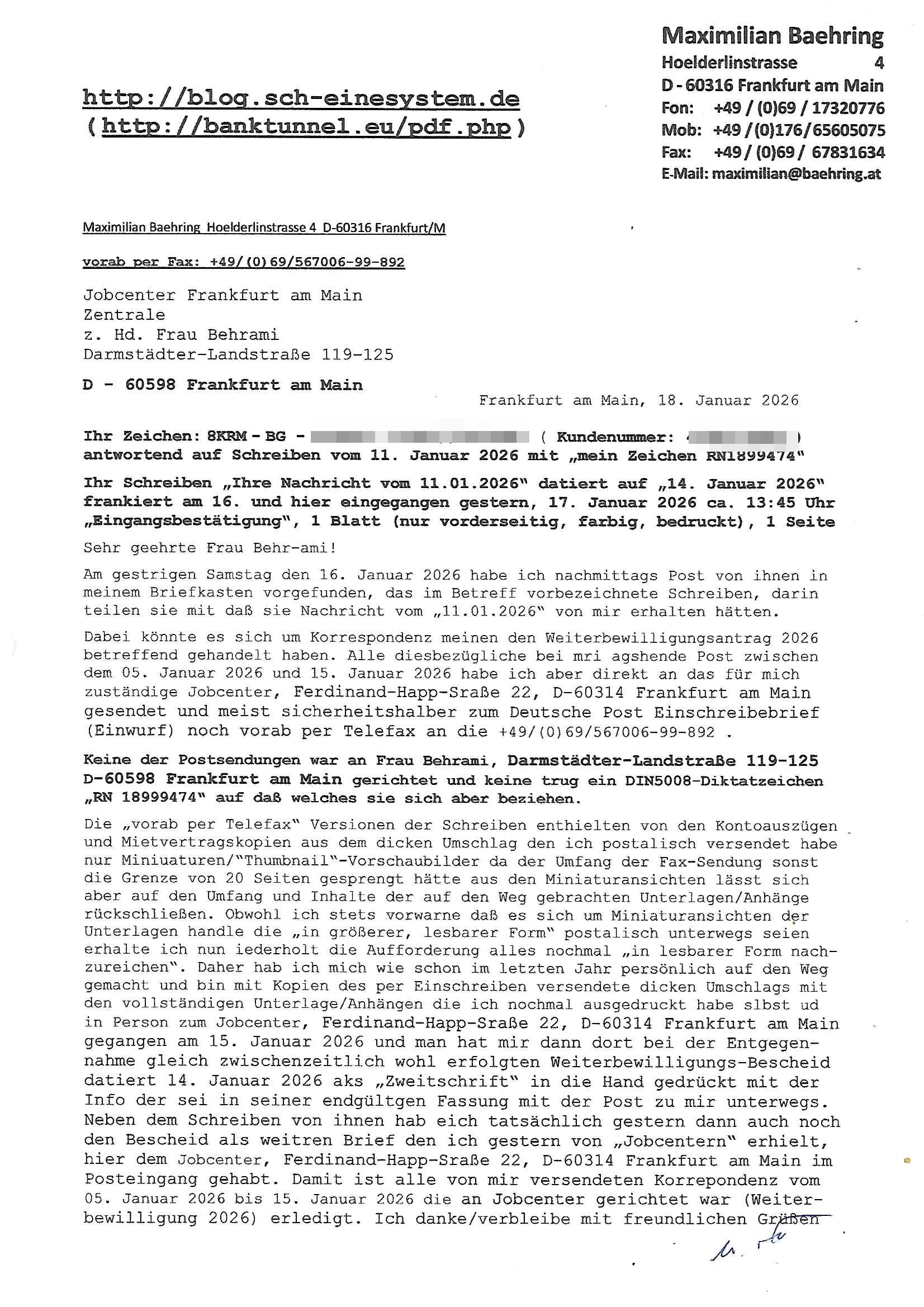 ( http://banktunnel.eu/pdf.php ) Maximilian Baehring Hoelderlinstrasse 4 D-60316 Frankfurt/M vorab per Fax: +49/(0)69/567006-99-892 Jobcenter Frankfurt am Main Zentrale z. Hd. Frau Behrami Darmstädter-Landstraße 119-125 D - 60598 Frankfurt am Main Frankfurt am Main, 18. Januar 2026 Ihr Zeichen: 8KRM - BG - Nummer: *** ( Kundenummer: *** ) antwortend auf Schreiben vom 11. Januar 2026 mit „mein Zeichen RN1899474“ Ihr Schreiben „Ihre Nachricht vom 11.01.2026“ datiert auf „14. Januar 2026“ frankiert am 16. und hier eingegangen gestern, 17. Januar 2026 ca. 13:45 Uhr „Eingangsbestätigung“, 1 Blatt (nur vorderseitig, farbig, bedruckt), 1 Seite Sehr geehrte Frau Behr-ami! Am gestrigen Samstag den 16. Januar 2026 habe ich nachmittags Post von ihnen in meinem Briefkasten vorgefunden, das im Betreff vorbezeichnete Schreiben, darin teilen sie mit daß sie Nachricht vom „11.01.2026“ von mir erhalten hätten. Dabei könnte es sich um Korrespondenz meinen den Weiterbewilligungsantrag 2026 betreffend gehandelt haben. Alle diesbezügliche bei mri agshende Post zwischen dem 05. Januar 2026 und 15. Januar 2026 habe ich aber direkt an das für mich zuständige Jobcenter, Ferdinand-Happ-Sraße 22, D-60314 Frankfurt am Main gesendet und meist sicherheitshalber zum Deutsche Post Einschreibebrief (Einwurf) noch vorab per Telefax an die +49/(0)69/567006-99-892 . Keine der Postsendungen war an Frau Behrami, Darmstädter-Landstraße 119-125 D-60598 Frankfurt am Main gerichtet und keine trug ein DIN5008-Diktatzeichen „RN 18999474“ auf daß welches sie sich aber beziehen. Die „vorab per Telefax“ Versionen der Schreiben enthielten von den Kontoauszügen und Mietvertragskopien aus dem dicken Umschlag den ich postalisch versendet habe nur Miniuaturen/“Thumbnail“-Vorschaubilder da der Umfang der Fax-Sendung sonst die Grenze von 20 Seiten gesprengt hätte aus den Miniaturansichten lässt sich aber auf den Umfang und Inhalte der auf den Weg gebrachten Unterlagen/Anhänge rückschließen. Obwohl ich stets vorwarne daß es sich um Miniaturansichten der Unterlagen handle die „in größerer, lesbarer Form“ postalisch unterwegs seien erhalte ich nun iederholt die Aufforderung alles nochmal „in lesbarer Form nach-zureichen“. Daher hab ich mich wie schon im letzten Jahr persönlich auf den Weg gemacht und bin mit Kopien des per Einschreiben versendete dicken Umschlags mit den vollständigen Unterlage/Anhängen die ich nochmal ausgedruckt habe slbst ud in Person zum Jobcenter, Ferdinand-Happ-Sraße 22, D-60314 Frankfurt am Main gegangen am 15. Januar 2026 und man hat mir dann dort bei der Entgegen-nahme gleich zwischenzeitlich wohl erfolgten Weiterbewilligungs-Bescheid datiert 14. Januar 2026 aks „Zweitschrift“ in die Hand gedrückt mit der Info der sei in seiner endgültgen Fassung mit der Post zu mir unterwegs. Neben dem Schreiben von ihnen hab eich tatsächlich gestern dann auch noch den Bescheid als weitren Brief den ich gestern von „Jobcentern“ erhielt, hier dem Jobcenter, Ferdinand-Happ-Sraße 22, D-60314 Frankfurt am Main im Posteingang gehabt. Damit ist alle von mir versendeten Korrepondenz vom 05. Januar 2026 bis 15. Januar 2026 die an Jobcenter gerichtet war (Weiter-bewilligung 2026) erledigt. Ich danke/verbleibe mit freundlichen Grüßen | |