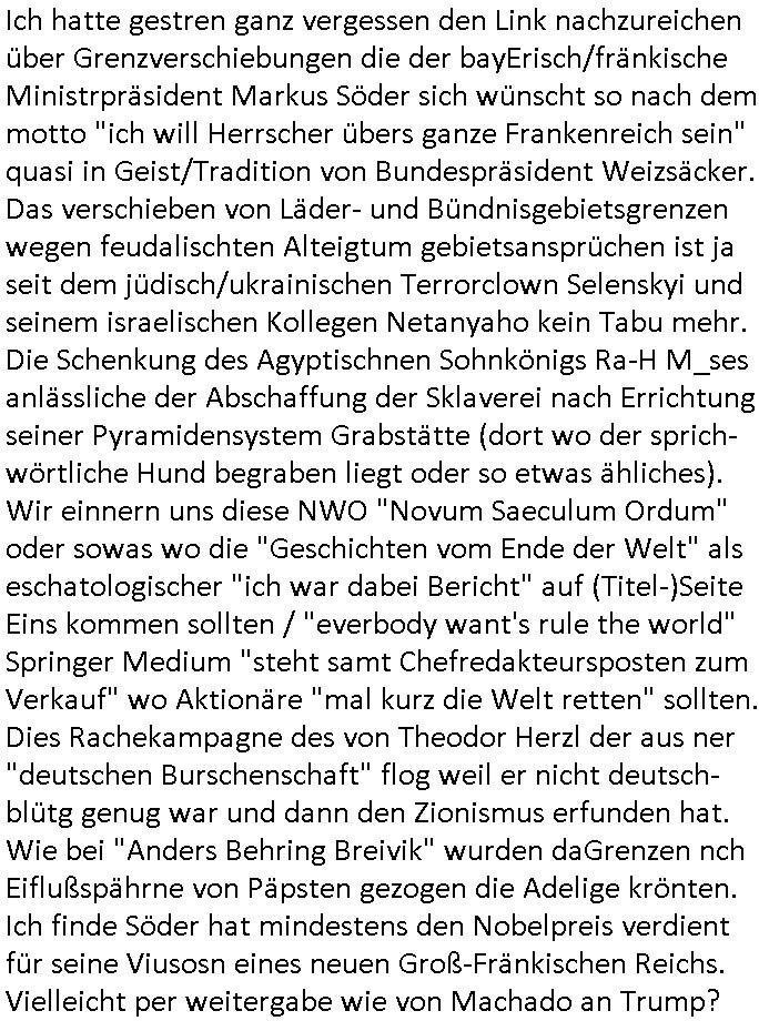 | Ich hatte gestren ganz vergessen den Link nachzureichen über Grenzverschiebungen die der bayErisch/fränkische Ministrpräsident Markus Söder sich wünscht so nach dem motto "ich will Herrscher übers ganze Frankenreich sein" quasi in Geist/Tradition von Bundespräsident Weizsäcker. Das verschieben von Läder- und Bündnisgebietsgrenzen wegen feudalischten Alteigtum gebietsansprüchen ist ja seit dem jüdisch/ukrainischen Terrorclown Selenskyi und seinem israelischen Kollegen Netanyaho kein Tabu mehr. Die Schenkung des Agyptischnen Sohnkönigs Ra-H M_ses anlässliche der Abschaffung der Sklaverei nach Errichtung seiner Pyramidensystem Grabstätte (dort wo der sprich-wörtliche Hund begraben liegt oder so etwas ähliches). Wir einnern uns diese NWO "Novum Saeculum Ordum" oder sowas wo die "Geschichten vom Ende der Welt" als eschatologischer "ich war dabei Bericht" auf (Titel-)Seite Eins kommen sollten / "everbody want's rule the world" Springer Medium "steht samt Chefredakteursposten zum Verkauf" wo Aktionäre "mal kurz die Welt retten" sollten. Dies Rachekampagne des von Theodor Herzl der aus ner "deutschen Burschenschaft" flog weil er nicht deutsch-blütg genug war und dann den Zionismus erfunden hat. Wie bei "Anders Behring Breivik" wurden daGrenzen nch Eiflußspährne von Päpsten gezogen die Adelige krönten. Ich finde Söder hat mindestens den Nobelpreis verdient für seine Viusosn eines neuen Groß-Fränkischen Reichs. Vielleicht per weitergabe wie von Machado an Trump?