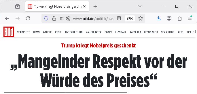 https://www.bild.de/politik/ausland-und-internationales/trump-kriegt-nobelpreis-geschenkt-mangelnder-respekt-vor-der-wuerde-des-preises-6969fbc38cfd1c6892ef700c https://www.bild.de/politik/inland/10-statt-16-bundeslaender-so-saehe-das-neue-soeder-deutschland-aus-69677e5d9f36d5bf769fb4e6 | |