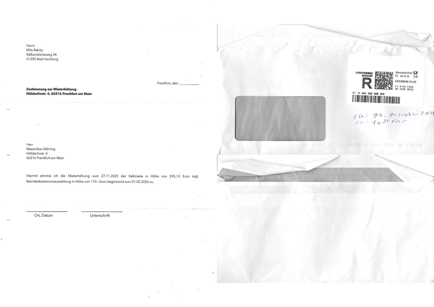Bin inzwischen nach Blutverlusten / Medikamentenvergiftung nach Polizei-brutalistätsexzessen (es gab Razzien gegen 17 Beamte) Rechrschteibinvalide trotz früheren Germanistik-Studiums. Maximilian Baehring Hoelderlinstrasse 4 D-60316 Frankfurt/M vorab per Fax: +49/(0)6172/2532220 Mile Rakita Kälberstücksweg 34 D-61350 Bad Homburg v.d. Höhe Frankfurt/M., den 18. Januar 2026 Mein Schreiben vom 04. Dezember 2025 (Einschreiben RT 0792 0777 2DE) vorab per Fax an die +49/(0)6172/2532220 am 04. Dezember 2025 um etwa 17:34 Uhr Ihr Schreiben hier soeben 04. Dezember 2025 ca. 14:15 Uhr eingegangen per Einschreiben Einwurf mit Post-Aufkleber Absendedatum des 28. November 2025 tragend mit Brief, insgesamt 3 Blatt je nur vorderseitig bedruckt, davon 2 Seiten Schreiben datiert auf den 27. November 2025 und 1 Rückantwort-Bogen Mein Schreiben vom 07. November 2025( Einschrieben RT 1019 3610 0DE vorab per Fax an die +49/(0)6172/2532220 am 07. November 2024, ca. 05:59 Uhr) Einschreiben RT 1019 3609 5DE vom 07. November 2025 an das LKA in Wiesbaden vorab per Fax an die +49/(0)611/327669122 am 06. November 2025 um 13:49 Uhr Onlinewache Strafanzeige Az.:2025-1106-1336-8161 Polizei Frankfurt 1257611/2025 „Whatsapp“ Nachrichten mit +49/(0)177/7777393, 13. Oktober 2025, 13:07–13:16 Uhr Mein Schreiben vom 05. Februar 2024( Einschrieben RR 9333 4210 4DE vorab per Fax an die +49/(0)6172/2532220 am 05. Februar 2024, ca 16:31 Uhr) An die Scheibe des im Hof parkendem schrzem Mercedes Gelädnewagen HG XX 9500 am 25. Mai 2022 nagebrchtes Schreiben sowei Mile Kovac persönlich mitgeteilt Mein Schreiben vom 23. März 2022( Einschrieben RR 9714 1735 5DE vorab per Fax an die +49/(0)6172/2532220 am 23. März 2022, ca 10:05 Uhr) Mein Schreiben vom 27. Februar 2022( Einschrieben RR 7963 6591 4DE vorab per Fax an die +49/(0)6172/2532220 am 27. Februar 2022, ca 11:23 Uhr) Mein Schreiben vom 20. Februar 2022( Einschrieben RR 7963 6517 1DE vorab per Fax an die +49/(0)6172/2532220 am 20. Februar 2022, ca 10:33 Uhr) Vermisstenanzeige vom 15. Februar 2022( Einschrieben RR 9215 9557 9DE vorab per Fax an die +49/(0)6172/120-189 am 15. Februar 2022, ca 12:09 Uhr und in Kopie per Fax an die +49/(0)6172/2532220 am 15. Februar, ca 12:13 Uhr) Schreiben an Nicola Rakita vom 31. Januar 2022( Einschrieben RR 7963 6224 6DE vorab per Fax an die +49/(0)6172/2532220 am 31. Januar 2022, ca 08:40 Uhr) Mein Schreiben vom 22. Januar 2022( Einschrieben RR 7963 6117 0DE vorab per Fax an die +49/(0)6172/2532220 am 12. Januar 2022, ca 17:58 Uhr) Telefonat von der +49/(0)174/3639226 auf die +49/(0)177/7777393 am 19. Januar 2022 von ca. 13:20 Uhr bis ca. 13:25 Uhr (Dauer 04:50 min) Mein Schreiben vom 14. Januar 2022( Einschrieben RR 9215 8587 7DE vorab per Fax an die +49/(0)6172/2532220 am 14. Jnauar 2022, ca 16:11 Uhr) Mein Schreiben vom 30. Dezember 2021( Einschrieben RR 9215 8099 9DE vorab per Fax an die +49/(0)6172/2532220 am 30. Dezember 2021, ca 11:58 Uhr) Mein Schreiben vom 10. Dezember 2021( Einschrieben RR 7963 5489 9DE vorab per Fax an die +49/(0)6172/2532220 am 10. Dezember 2021, ca 17:12 Uhr) Ihr Schreiben vom 08. hier eingegangen am 10. Dezemebr 2021 wegen eienr Mieterhöhung für meine Wohnung Hölderlinstraße 4, 60136 Frankfurt am Main Mile (Rakita), Herr Nicola Rakita, Mile Kovac, Familie Rakita! b.(itte) w.(enden) Am 04. Dezember 2025 habe ich im umseitigen Betreff zuerst aufgelistetes Antwort -Schreiben auf ihren Brief datiert auf den 28. November 2025 versendet und zwar vorab per Telefax, per Deutsch Post Einschreibebrief, per E-Mail / Blog-Internet und als PDF ausgehende „Whatsapp“ Messenger Nachricht an die +49/(0)177/7777393 [eingehende Nachrichten sind für den „Whatsapp“ Dienst sind bei mir aus formal- juristischen Gründen blockiert, genau wie Nachrichten andrer Messaging-Dienste]. In ihrem Brief vom 28. November 2026 erbitten sie meine Stellungnahme/Zustimmung für eine neue monatliche Zusatzzahlung, von Ihnen „Mietanpassung“ genannt. Dabei führen sie an daß die angestrebte Miete ortsüblich sei und die Kosten gestiegen. Um ostüblche Vergleichsmieten zu belegen führen sie drei andere Mietvertrags-Verhältnisse hier im Hause – alles Verträge mit Ihnen als dem Vermieter – auf von, wie sie behaupten, vergleichbaren Wohnungen. Ich stell hierzu folgend fest: Die anderen Wohnungen hier haben (anders als mein Dachgeschoss Appartement) oft-mals einen Balkon, keinerlei die qm-Zahl der Wohnfläche mindernden Dachschrägen und zudem eine Zustiegsmöglichkeit zum Fahrstuhl / Aufzug die „ebenerdig“ ohne zusätzliche Treppen zu steigen wie in meiner Etage erreicht werden kann. Man hat dort zudem überwiegende ein Tageslicht-Fenster in einer richtigen Küche anstatt wie bei mir nur eine extrem enge Kochniesche in die keine Stanrdgröße Einbau-geräte passen. Die Bäder in den anderen Wohnungen sind Wannenbäder und von der Fläche her vile üppiger bemessen, dort ist platz für Waschmaschinen, ich aber habe lediglich ein extrem eng bemessenes Duschbad, derart eng das am Heizkörper nicht mal ein richtiger Thermostat verbaut werden konnte. Von vergleichbar kann also nicht im geringsten die Rede sein. Die Mietsteigerung die sie begehren ist seit ich die Wohnung Mai 2006 anmietete (damals war hier noch überall Baustelle, ich mußte daher damals oft bei meiner damaligen Lebensgefährtin Manuela Nowatius, Edith-Stein-Straße, Heusenstamm das Bad in Anspruch nehmen und übernachten) die inzwischen Dritte, die erste Miet-erhöhung kam versteckt per Einbau einer Photovoltaikanlage als der vorher im Pauschal/Komplett-Mietpreis (Sie vermieteten die Appartemens als all-inclusive Rundum Sorglos Paket an „Computer-Inder“) enthalten Strom „ausgekoppelt“ wurde. Damals habe ich (die Korrespondenz dazu ist noch vorhanden) mehrfach anmahen müssn daß hier Gas und Wasser teils wochenlang abgestellt wurden da, wie die Stadtwerke „Mainova“ sagte Sie die Gasrechnung nicht bezaheln würden. Sie haben damals erwidert m