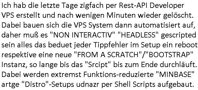 Ich hab die letzte Tage zigfach per Rest-API Developer VPS erstellt und nach wenigen Minuten wieder gelöscht. Dabei bauen sich die VPS System dann automatisiert auf, daher muß es "NON INTERACTIV" "HEADLESS" gescripted sein alles das beduet jeder Tippfehler im Setup ein reboot respektive eine neue "FROM A SCRATCH"/"BOOTSTRAP" Instanz, so lange bis das "Srcipt" bis zum Ende durchläuft. Dabei werden extremst Funktions-reduzierte "MINBASE" artge "Distro"-Setups udnazr per Shell Scripts aufgebaut.