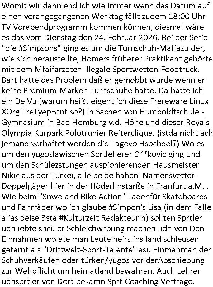 | Womit wir dann endlich wie immer wenn das Datum auf einen vorangegangenen Werktag fällt zudem 18:00 Uhr TV Vorabendprogramm kommen können, diesmal wäre es das vom Dienstag den 24. Februar 2026. Bei der Serie "die #Simpsons" ging es um die Turnschuh-Mafiazu der, wie sich heraustellte, Homers früherer Praktikant gehörte mit dem Mfaifarzeten Illegale Sportwetten-Foodtruck. Bart hatte das Problem daß er gemobbt wurde wenn er keine Premium-Marken Turnschuhe hatte. Da hatte ich ein DejVu (warum heißt eigentlich diese Frereware Linux XOrg TreTyepFont so?) in Sachen von Humboldtschule - Gymnasium in Bad Homburg v.d. Höhe und dieser Royals Olympia Kurpark Polotrunier Reiterclique. (istda nicht ach jemand verhaftet worden die Tagevo Hsochdel?) Wo es um den yugoslawischen Sprtleherer C**kovic ging und um den Schülezstungen auspionierenden Hausmeister Nikic aus der Türkei, alle beide haben Namensvetter-Doppelgäger hier in der Höderlinstarße in Franfurt a.M. . Wie beim "Snwo and Bike Action" Ladenfür Skateboards und Fahrräder wo ich glaube #Simpon's Lisa (in dem Falle alias deise 3sta #Kulturzeit Redakteurin) sollten Sprtler udn iebte shcüler Schleichwrbung machen udn von Den Einnahmen wolete man Leute heirs ins land schleusen getarnt als "Drittwelt-Sport-Talente" asu Einmahman der Schuhverkäufen oder türken/yugos vor derAbschiebung zur Wehpflicht um heimatland bewahren. Auch Lehrer udnsprtler von Dort bekamn Sprt-Coaching Verträge.