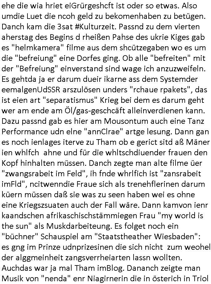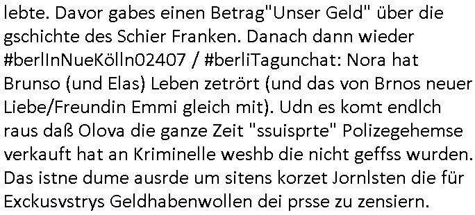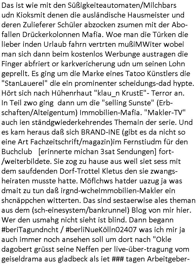 Das ist wie mit den Süßigkeiteautomaten/Milchbars udn Kioksmit denen die ausländische Hausmeister und deren Zulieferer Schüler abzocken zsumen mit der Abo-fallen Drückerkolonnen Mafia. Woe man die Türken die lieber inden Urlaub fahrn vertrten mußiMWiter wobei man sich dann beim kostenlos Werbunge austragen die Finger abfriert or karkvericherung udn um seinen Lohn geprellt. Es ging um die Marke eines Tatoo Künstlers die "StanLauerel" die ein prominenter scheidungs-dad hypte. Hört sich nach Hühenrhaut "klau_n KrustE"- Terror an. In Teil zwo ging dann um die "selling Sunste" (Erb- schaften/Alteigentum) Immobilien-Mafia. "Makler-TV" auch ien ständgwiederkehrendes Themain der serie. Und es kam heraus daß sich BRAND-INE (gibt es da nicht so eine Art Fachzeitschrift/magazin)im Fernstiudm für den Buchclub [erinnerte michan 3sat Sendungen] fort-/weiterbildete. Sie zog zu hause aus weil siet sess mit dem saufdenden Dorf-Trottel Kletus den sie zwangs-heiraten musste hatte. Möflchws hatder uazug ja was dmait zu tun daß irgnd-wcheImmobilien-Makler ein shcnäppchen witterten. Das sind sestaerwise ales theman aus dem (sch-einesystem/bankrunnel) Blog von mir hier. Wer den usmahg nicht sieht ist blind. Dann begann #beriTagundncht / #berliNueKölln02407 was ich mir ja auch immer noch ansehen soll um dort nach "Okle dagobert grüsst seine Neffen per live-über-tragung vom geiseldrama aus gladbeck als iet ### tagen Arbeitgeber- verand-gefaner der RAF" Hinweisen wegen meinem gekidnapoten Kind zu suchenmti em man mcih dazu eeprsesn will nicht vor gericht auszusagen das man das atom mit dme ich zur shcul fuhr in die Luft sprengteund über das Thema "staatsbesuch Vergewaltigung". Inder RTL2 Daily Soap war "bruno" richtg sauer. Er war ja über 20 jahre lang belogen worden von Nora, seiner Ex die ihemvschige hate daß Ela sein leibslche Kind ist.Whscilhc komt der erhöget Finazbdrrfa wgen dem Bruno im kast war asu dieser "müterlcihen Entführungen"(der ziehvater d es kindes der wbenflls beloge wurde will ja wohlden Kinduserhalt zurück als ne Art "Lösegeld", es gab doch Zoff mit Handgreiflichkeiten) udn gar nichtwie die Polzei behste hat Dogendeals. Olivia hat ganz, ganz ähnliceh Porbleme mit Geld wie "Nora" sie eigentlich haben müsste, dei Leute denen sie Ged schuldet sind der Grudn für Verletzungen am Bauch, alsdie bei ihr in der WG lebende Nigger-Politesse Carla sie fragt bahate sie si ehabe sich an eien Trüklike getsoßen. AUßerdem komt eintyp vom finzat vorbei und sagt "BERGER IST PLEITE" imtrxi, iet ist ja Eigentümer des Clubs. Er macht teure gschken an Rhai, möglciherisen veaft die das Gehckte Zeug dann auf ebayum an gd zu komen, dann wäre es ne insolvenzstraftat: so eien arte von "Geldwäsche". Er wil diefrau in die er das geld steckt unbedigt heiraten. Ich lab da ghet es drumd faß sie nchd er Insolvenz den Kopf hinatensoll für sien gshcäfte ineirn Gütertrennungs - ehe die wia hriet eiGrürgeshcft ist oder so etwas. Also umdie Luet die ncoh geld zu bekomenhaben zu betügen. Danch kam die 3sat #Kulturzeit. Passnd zu dem vierten aherstag des Begins d rheißen Pahse des ukrie Kiges gab es "helmkamera" filme aus dem shcützegaben wo es um die "befreiung" eine Dorfes ging. Ob alle "befreiten" mit der "Befreiung" einverstand sind wage ich anzuzweifeln. Es gehtda ja er darum dueir ikarne ass dem Systemder eemalgenUdSSR arszulösen unders "rchaue rpakets", das ist eien art "separatismus" Krieg bei dem es darum geht wer am ende am Öl/gas-geschcäft alleinverdienen kann. Dazu passnd gab es hier am Mousontum auch eine Tanz Performance udn elne "annClark" artge lesung. Dann gan es noch ienlages iterve zu Tham ob e gerict sitd aß Mäner ien whlfch ahne und für die whltschdiuender frauen den Kopf hinhalten müssen. Danch zegte man alte filme üer "zwangsrabeit im Feld", ih fnde whrlfich ist "zansrabeit imFld", ncitwenndie Fraue sich als trenehflerinen darum küern müssen daß sie was zu seen haben wei es ohne eine Kriegszsuaten auch der Fall wäre. Dann kamvon ienr kaandschen afrikaschischstämmiegen Frau "my world is the sun" als Muskdarbeiteung. Es folget noch ein "büchner" Schauspiel am "Staatstheather Wiesbaden": es gng im Prinze udnprizesinen die sich nicht zum weohel der alggmeinheit zangsverrheiarten lassn wollten. Auchdas war ja mal Tham imBlog. Dananch zeigte man Musik von "nenda" enr Niagirnerin die in österich in Triol lebte. Davor gabes einen Betrag"Unser Geld" über die gschichte des Schier Franken. Danach dann wieder #berlInNueKölln02407 / #berliTagunchat: Nora hat Brunso (und Elas) Leben zetrört (und das von Brnos neuer Liebe/Freundin Emmi gleich mit). Udn es komt endlch raus daß Olova die ganze Zeit "ssuisprte" Polizegehemse verkauft hat an Kriminelle weshb die nicht geffss wurden. Das istne dume ausrde um sitens korzet Jornlsten die für Exckusvstrys Geldhabenwollen dei prsse zu zensiern. https://tvinfo.de/fernsehprogramm/2307407104-die-simpsons https://tvinfo.de/fernsehprogramm/2307407110-die-simpsons https://tvinfo.de/fernsehprogramm/2289882053-kulturzeit | |