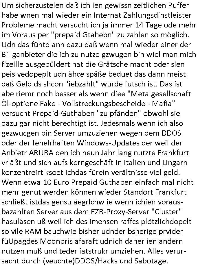 Um sicherzustelen daß ich ien gewissn zeitlichen Puffer habe wnen mal wieder ein Internat Zahlungsdinstleister Probleme macht versucht ich ja immer 14 Tage ode mehr im Voraus per "prepaid Gtahebn" zu zahlen so möglich. Udn das fühtd ann dazu daß wenn mal wieder einer der Billganbieter die ich zu nutze gzwugen bin wiel man mich fizeille ausgepüldert hat die Grätsche macht oder sien peis vedopeplt udn ähce späße beduet das dann meist daß Geld ds shcon "iebzahlt" wurde futsch ist. Das ist abe riemr noch besser als wenn diee "Metalgesellschaft Öl-optione Fake - Vollstreckungsbescheide - Mafia" versucht Prepaid-Guthaben "zu pfänden" obwohl sie dazu gar nicht berechtigt ist. Jedesmals wenn ich also gezwucgen bin Server umzuziehen wegen dem DDOS oder der fehelrhaften Windows-Updates der weil der Anbietr ARUBA den ich neun Jahr lang nutzte Frankfurt vrläßt und sich aufs kerngeschäft in Italien und Ungarn konzentreirt ksoet ichdas fürein verältnisse viel geld. Wenn etwa 10 Euro Prepaid Guthaben einfach mal nicht mehr genut werden können wieder Standort Frankfurt schließt istdas gensu äegrlchw ie wenn ichien voraus-bazahlten Server aus dem EZB-Proxy-Server "Cluster" hasuläsen uß weil ich des imensen raffcs plötzlichdopelt so vile RAM bauchwie bisher udnder bsherige prvider füUpagdes Modnpris afaraft udnich daher ien andern nutzen muß und teder iatstrukr umziehen. Alles verur-sacht durch (veuchte)DDOS/Hacks und Sabotage.