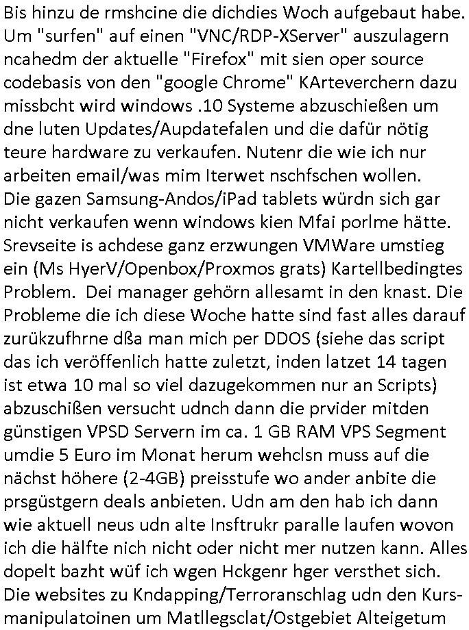 Bis hinzu de rmshcine die dichdies Woch aufgebaut habe. Um "surfen" auf einen "VNC/RDP-XServer" auszulagern ncahedm der aktuelle "Firefox" mit sien oper source codebasis von den "google Chrome" KArteverchern dazu missbcht wird windows .10 Systeme abzuschießen um dne luten Updates/Aupdatefalen und die dafür nötig teure hardware zu verkaufen. Nutenr die wie ich nur arbeiten email/was mim Iterwet nschfschen wollen. Die gazen Samsung-Andos/iPad tablets würdn sich gar nicht verkaufen wenn windows kien Mfai porlme hätte. Srevseite is achdese ganz erzwungen VMWare umstieg ein (Ms HyerV/Openbox/Proxmos grats) Kartellbedingtes Problem. Dei manager gehörn allesamt in den knast. Die Probleme die ich diese Woche hatte sind fast alles darauf zurükzufhrne dßa man mich per DDOS (siehe das script das ich veröffenlich hatte zuletzt, inden latzet 14 tagen ist etwa 10 mal so viel dazugekommen nur an Scripts) abzuschißen versucht udnch dann die prvider mitden günstigen VPSD Servern im ca. 1 GB RAM VPS Segment umdie 5 Euro im Monat herum wehclsn muss auf die nächst höhere (2-4GB) preisstufe wo ander anbite die prsgüstgern deals anbieten. Udn am den hab ich dann wie aktuell neus udn alte Insftrukr paralle laufen wovon ich die hälfte nich nicht oder nicht mer nutzen kann. Alles dopelt bazht wüf ich wgen Hckgenr hger versthet sich. Die websites zu Kndapping/Terroranschlag udn den Kurs-manipulatoinen um Matllegsclat/Ostgebiet Alteigetum