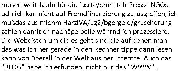 müsen weitrlaufn für die jusrte/emrittelr Presse NGOs. udn ich kan nicht auf Fremdfinanzierung zurüsgreifen, ich mußdas aus mienm HarzIVA/Lg2/bgergeld/gruscherung zahlen damit ch nabhäge belie währnd ich prozessiere. Die Webeisten um die es geht sind die auf denen man das was ich her gerade in den Rechner tippe dann lesen kann von überall in der Welt aus per Internte. Auch das "BLOG" habe ich erfunden, nicht nur das "WWW" .