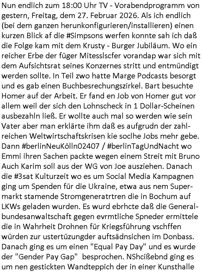 | Nun endlich zum 18:00 Uhr TV - Vorabendprogramm von gestern, Freitag, dem 27. Februar 2026. Als ich endlich (bei dem ganzen herunkonfigurieren/installieren) einen kurzen Blick af die #Simpsons werfen konnte sah ich daß die Folge kam mit dem Krusty - Burger Jubiläum. Wo ein reicher Erbe der füger Mitesslscfer vorandap war sich mit dem Aufsichtsrat seines Konzernes stritt und entmündigt werden sollte. In Teil zwo hatte Marge Podcasts besorgt und es gab einen Buchbesrechungszirkel. Bart besuchte Homer auf der Arbeit. Er fand en Job von Homer gut vor allem weil der sich den Lohnscheck in 1 Dollar-Scheinen ausbezahln ließ. Er wollte auch mal so werden wie sein Vater aber man erklärte ihm daß es aufgrudn der zahl-reichen Weltwirtschaftskrisen kie soclhe Jobs mehr gebe. Dann #berlinNeuKölln02407 / #berlinTagUndNacht wo Emmi ihren Sachen packte wegen einem Streit mit Bruno Auch Karim soll aus der WG von Joe ausziehen. Danach die #3sat Kulturzeit wo es um Social Media Kampagnen ging um Spenden für die Ukraine, etwa aus nem Super-markt stamende Stromgeneratrtren die in Bochum auf LKWs geladen wurden. Es wurd ebrhcte daß die General- bundesanwaltschaft gegen evrmtliche Spneder ermittele die in Wahrheit Drohnen für Kriegsführung vschffen würden zur ustertüzungder auftsädnsichen im Donbass. Danach ging es um einen "Equal Pay Day" und es wurde der "Gender Pay Gap" besprochen. NShcißebnd ging es um nen gestickten Wandteppich der in einer Kunsthalle