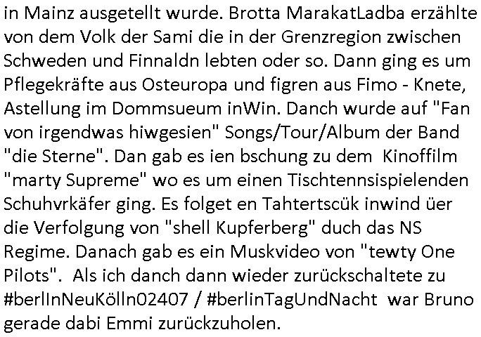 in Mainz ausgetellt wurde. Brotta MarakatLadba erzählte von dem Volk der Sami die in der Grenzregion zwischen Schweden und Finnaldn lebten oder so. Dann ging es um Pflegekräfte aus Osteuropa und figren aus Fimo - Knete, Astellung im Dommsueum inWin. Danch wurde auf "Fan von irgendwas hiwgesien" Songs/Tour/Album der Band "die Sterne". Dan gab es ien bschung zu dem Kinoffilm "marty Supreme" wo es um einen Tischtennsispielenden Schuhvrkäfer ging. Es folget en Tahtertscük inwind üer die Verfolgung von "shell Kupferberg" duch das NS Regime. Danach gab es ein Muskvideo von "tewty One Pilots". Als ich danch dann wieder zurückschaltete zu #berlInNeuKölln02407 / #berlinTagUndNacht war Bruno gerade dabi Emmi zurückzuholen. https://tvinfo.de/fernsehprogramm/2307407936-die-simpsons https://tvinfo.de/fernsehprogramm/2307407949-die-simpsons https://tvinfo.de/fernsehprogramm/2289882457-kulturzeit | |