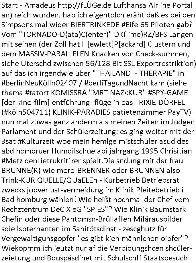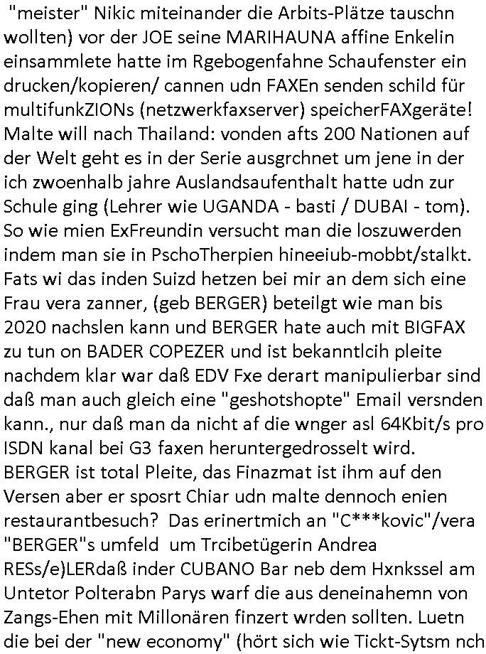 GOOGLEmail abspalten wollte) AS12586 mit Sitz in FFM gegründet in Bad Homburg. Der SysOp soff öfers inder Cubano bar wo die Banksicherheit-Yugo-Nutten von IBM (siehe auch MAINOVA webHOUSE HanauerLand- 19X Claranet/leasedweb nähe Rechenzentrumslokation mit direkter Verbindung nach "ibm.de" = BÖBLINGEN) mir von kdipapern meines entführten Kindes berichteten. Passend dazu hatte auch das "DUFF Bier" maskottchen (quarterbock: "centerField" wie "ZENTRALgELD"-server) Sorchetproblem im Show-Wahlkampf Sieh bewerbung von Verbrecher-Kukie-Vgerlger-Mörder Flo Bruckmaier für ämter in Judgparlmant/Schülerzeitung/CDU partei). Worum ging es sonst noch? am gstregn TV- Vorband? Ich muß mir das ja immer ansehen wegen dieser "onkel Dagobert grüsst seine Neffen qusi live vom Gladbecker Geiseldrama als siet ### tagn Gefangener der RAF" Dinge die imemr in den Sendungs-Beiträgen versteckt sind und die ich gezwunge werde auszwerten per diesem Blog hier mit entführtem Kind (tabea-Laar Riek *19.09.2000, HG siehe http://tabea-lara.blogna.me daß dort nur üer die sktenzugehörgkiet iher mUter was steht nicht aber über das kidpping hat damit zu tundaß ic ahrlang svscht das Kind per Umagsn/sorgerechtsverfahren zu "befreien" ohe daß es die grasem wahrheit über siene Ensthung oder Mutter erfährt). Es ging um "BIGfax": eien Kneipe für (vagalger HOMOs wie Klurklink hausmeiter Hett und sein Kumple C***kovic die wie Türken-Spion-Schulhaus- "meister" Nikic miteinander die Arbits-Plätze tauschn wollten) vor der JOE seine MARIHAUNA affine Enkelin einsammlete hatte im Rgebogenfahne Schaufenster ein drucken/kopieren/ cannen udn FAXEn senden schild für multifunkZIONs (netzwerkfaxserver) speicherFAXgeräte! Malte will nach Thailand: vonden afts 200 Nationen auf der Welt geht es in der Serie ausgrchnet um jene in der ich zwoenhalb jahre Auslandsaufenthalt hatte udn zur Schule ging (Lehrer wie UGANDA - basti / DUBAI - tom). So wie mien ExFreundin versucht man die loszuwerden indem man sie in PschoTherpien hineeiub-mobbt/stalkt. Fats wi das inden Suizd hetzen bei mir an dem sich eine Frau vera zanner, (geb BERGER) beteilgt wie man bis 2020 nachslen kann und BERGER hate auch mit BIGFAX zu tun on BADER COPEZER und ist bekanntlcih pleite nachdem klar war daß EDV Fxe derart manipulierbar sind daß man auch gleich eine "geshotshopte" Email versnden kann., nur daß man da nicht af die wnger asl 64Kbit/s pro ISDN kanal bei G3 faxen heruntergedrosselt wird. BERGER ist total Pleite, das Finazmat ist ihm auf den Versen aber er sposrt Chiar udn malte dennoch enien restaurantbesuch? Das erinertmich an "C***kovic"/vera "BERGER"s umfeld um Trcibetügerin Andrea RESs/e)LERdaß inder CUBANO Bar neb dem Hxnkssel am Untetor Polterabn Parys warf die aus deneinahemn von Zangs-Ehen mit Millonären finzert wrden sollten. Luetn die bei der "new economy" (hört sich wie Tickt-Sytsm nch Start - Amadeus http://fLÜGe.de Lufthansa Airline Portal an) reich wurden. hab ich eigentolch eräht daß es bei den Simpsons mal wider BIERTRINKEDE #Eifel65 Piloten gab? Vom "TORNADO-D(ata)C(enter)" DK(lime)RZ/BFS Langen mit seinen (der Zoll hat H[ewlett]P[ackard] Clustern und dem MASSIV-PARALLELEN Knacken von Check-summen, siehe Uterschd zwischen 56/128 Bit SSL Exportrestriktion) auf das ich irgendwie über "THAILAND - THERAPIE" in #berlinNeuKölln02407 / #berliTagundNacht kam (siehe thema #tatort KOMISSRA "MRT NAZ<KUR" #SPY-GAME [der kino-film] entführung- flüge in das TRIXIE-DÖRFEL (#köln504711) KLINIK-PARADIES patietenzimmer PayTV) nun mal zuwas ganz anderm als meinen Zeiten im Judgen Parlament und der Schülerzeitung: es ging weiter mit der 3sat #Kulturzeit woe mein hemlge mistschüler asud des abd hombruer Humdilschue abi jahrgang 1995 Chrisitian #Metz denLietrukritiker spielt.Die sndung mit der frau BRUNNE(R) wie mord-BRENNER oder BRUNNEN also Trink-KUR QUELLE/QUaELEn - Kurbetrieb Betriebsrat zwecks jobverlust-vermeidung im Klinik Pleitebetrieb i Bad homburg wählen! Wie heißt nochmal der Chef vom Rechztentrum DeCIX eG "SPIES"? Wie Klinik Baumstark Chefin oder diese Pantomsn-Brüllaffen Milärausbilder sdie lsbternanten im Sanitötsdinst - zescghutz für Vergewaltigunsgopfer "es gibt kien männlchen oipfer"? Wiekopmm ich jeutzt nur af die Verbidungshcen shcüler-zeietung und Bduspäsdinet mit Schulschff Staatsbesuch Bangkok/THAILAND militär? Wie komme ich auf Spioage des Hausmeisters der aufder sch nch Kidpping Löse-gedler die er veturrene kan Post für Redakteure wie mich klaut auf Militär? Ach so: angeblich ist Kireg im Iran. Hat jemad z_RAN und IRAN und DEN VER->RÜCKTEN IvAN vertauscht (ausgetauscht wie miteinander verwechselt)? Was hat sponage mit amgfanger (pds-fax)post wen es um berichet asu Kiregsgbietn für dei shcüerzung geht nur mit der 3sat kurzet zu tun udn chstin metz der damsl mit mir zusmen üper das herrasuen atteta berichten sollte mich aber damiter exusivstry iehamen bekomt erpresste? ach ja, "KRIEG IM IRAN". Trump hätte auf seinem NAH-OST Kreuzug den Ajah,TOLJah,CmOMeiNi-sten jenem Angriff den er mit ISRAELs rohstoffhungrigen ZIONisten zusammen geplant hat welchd ei Plästinsre um ihr land betrügen wollenso wie TV-terror-Clown Jude SELENSKYI im Nordn das NAHEN OSTEN, dem SÜDEN RUSSLANDS veshcte den ÖL/GAS Enrgiamrkt so neu zu ordnen daß Moaku nicht mer mitverdient das deshlab eigeen Pipe-lines baut GAZRPOM/NORTH-STREAM damit nichtdue Ikarenr Europ wider DEVISNbrger Gas-hanh zudrehen? Wie finanziern die Ukarienr nochmal ihre waffen für den Sepratismuskmapf der atomaern Kirm Schzemeer-flotte von der UdSSR? Mit Enahmen ausfs Patenetn-Verküufen für effizite batreien aus Atom-U-Booetnder Oten armee?Jedfalls olen die mschen in europ gajubet haten als der rliös Füher endlch tot war, erinert mich an das Jubeln von barak Obama im"Sitauion Room" als man "osam bin abden" emrodert hat desn stebrlche üerreste man an einm gheiemn Ort dem Meer übergab dmeit kein Wall-fahtsort für Märtyer snteht wie bei dem "SISSI"/"