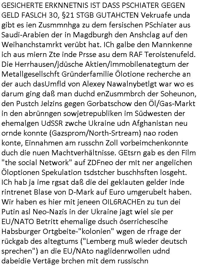 GESICHERTE ERKNNETNIS IST DASS PSCHIATER GEGEN GELD FASLCH 30, §21 STGB GUTAHCTEN Vekruafe unda gibt es ien Zusmmnhga zu dem fersischen PSchiater aus Saudi-Arabien der in Magdburgh den Anshclag auf den Weihanchstamrkt verübt hat. ICh galbe den Mannkenne ich aus miern Zte inde Prsse asu dem RAF Teroistenufeld. Die Herrhausen/jdüsche Aktien/immobilenategtum der Metallgesellschft Gründerfamilie Ölotione recherche an der auch dasUmfld von Alexey Nawalnybetlgt war wo es darum ging daß man duchd enZusmmbrch der Soheunon, den Pustch Jelzins gegen Gorbatschow den Öl/Gas-Markt in den abrünngen sowjetrepubliken im Südwesten der ehemalgen UdSSR zwche Ukraine udn Afghanistan neu ornde konnte (Gazsprom/North-Srtream) nao roden konte, Einnahmen am russchn Zoll vorbeimchenkonnte duch die nuen Machtverhältnisse. GEtsrn gab es den Film "the social Network" auf ZDFneo der mIt ner angelichen Öloptionen Spekulation tsdstcher buschhsften losgeht. ICh hab ja ime rgsat daß die dei geklauten gelder inde rintrenet Blase von D-Mark auf Euro umgerubelt haben. Wir haben es hier mit jeneen OIL6RACHEn zu tun dei Putin asl Neo-Nazis in der Ukraine jagt wiel sie per EU/NATO Betritt ehemalige dsuch öserrichescihe Habsburger Ortgbeite-"kolonien" wgen de rfrage der rückgab des altegtums ("Lemberg muß wieder deutsch sprechen") an die EU/NAto naglidenrwollen udnd dabeidie Vertäge brchen mit dem russischn