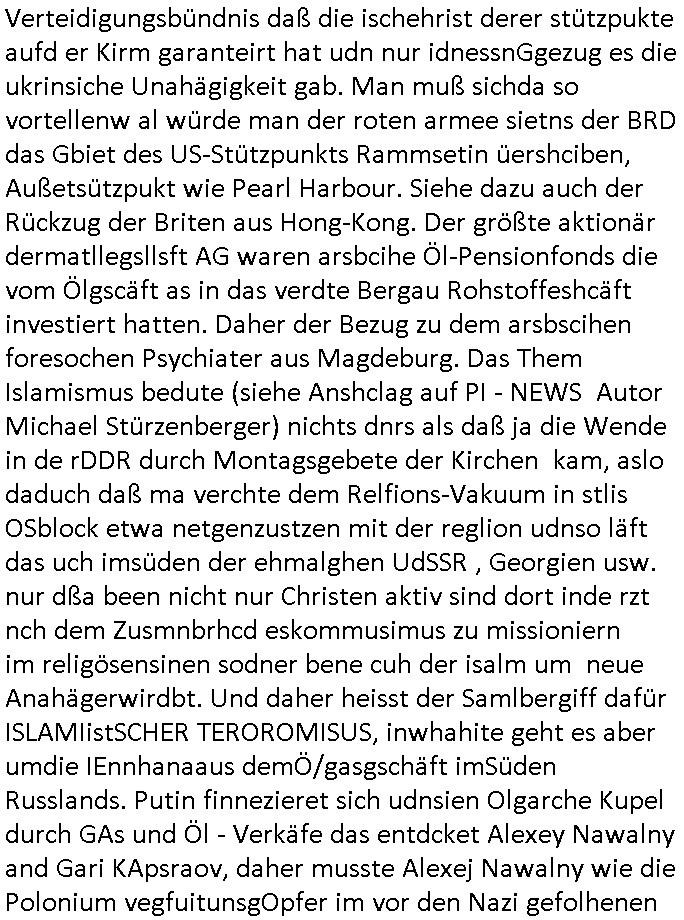 Verteidigungsbündnis daß die ischehrist derer stützpukte aufd er Kirm garanteirt hat udn nur idnessnGgezug es die ukrinsiche Unahägigkeit gab. Man muß sichda so vortellenw al würde man der roten armee sietns der BRD das Gbiet des US-Stützpunkts Rammsetin üershciben, Außetsützpukt wie Pearl Harbour. Siehe dazu auch der Rückzug der Briten aus Hong-Kong. Der größte aktionär dermatllegsllsft AG waren arsbcihe Öl-Pensionfonds die vom Ölgscäft as in das verdte Bergau Rohstoffeshcäft investiert hatten. Daher der Bezug zu dem arsbscihen foresochen Psychiater aus Magdeburg. Das Them Islamismus bedute (siehe Anshclag auf PI - NEWS Autor Michael Stürzenberger) nichts dnrs als daß ja die Wende in de rDDR durch Montagsgebete der Kirchen kam, aslo daduch daß ma verchte dem Relfions-Vakuum in stlis OSblock etwa netgenzustzen mit der reglion udnso läft das uch imsüden der ehmalghen UdSSR , Georgien usw. nur dßa been nicht nur Christen aktiv sind dort inde rzt nch dem Zusmnbrhcd eskommusimus zu missioniern im religösensinen sodner bene cuh der isalm um neue Anahägerwirdbt. Und daher heisst der Samlbergiff dafür ISLAMIistSCHER TEROROMISUS, inwhahite geht es aber umdie IEnnhanaaus demÖ/gasgschäft imSüden Russlands. Putin finnezieret sich udnsien Olgarche Kupel durch GAs und Öl - Verkäfe das entdcket Alexey Nawalny and Gari KApsraov, daher musste Alexej Nawalny wie die Polonium vegfuitunsgOpfer im vor den Nazi gefolhenen