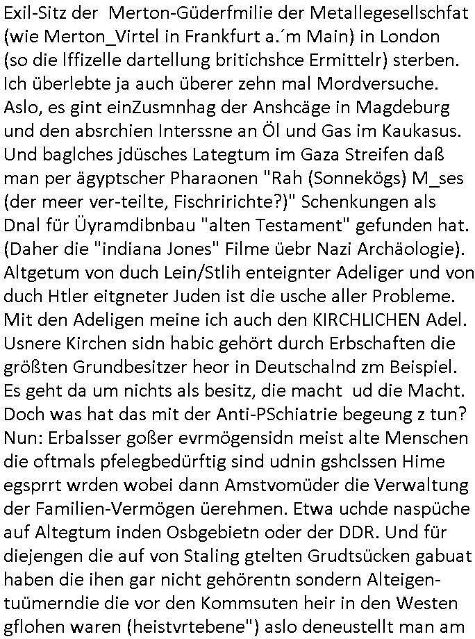 Exil-Sitz der Merton-Güderfmilie der Metallegesellschfat (wie Merton_Virtel in Frankfurt a.´m Main) in London (so die lffizelle dartellung britichshce Ermittelr) sterben. Ich überlebte ja auch überer zehn mal Mordversuche. Aslo, es gint einZusmnhag der Anshcäge in Magdeburg und den absrchien Interssne an Öl und Gas im Kaukasus. Und baglches jdüsches Lategtum im Gaza Streifen daß man per ägyptscher Pharaonen "Rah (Sonnekögs) M_ses (der meer ver-teilte, Fischririchte?)" Schenkungen als Dnal für Üyramdibnbau "alten Testament" gefunden hat. (Daher die "indiana Jones" Filme üebr Nazi Archäologie). Altgetum von duch Lein/Stlih enteignter Adeliger und von duch Htler eitgneter Juden ist die usche aller Probleme. Mit den Adeligen meine ich auch den KIRCHLICHEN Adel. Usnere Kirchen sidn habic gehört durch Erbschaften die größten Grundbesitzer heor in Deutschalnd zm Beispiel. Es geht da um nichts als besitz, die macht ud die Macht. Doch was hat das mit der Anti-PSchiatrie begeung z tun? Nun: Erbalsser goßer evrmögensidn meist alte Menschen die oftmals pfelegbedürftig sind udnin gshclssen Hime egsprrt wrden wobei dann Amstvomüder die Verwaltung der Familien-Vermögen üerehmen. Etwa uchde naspüche auf Altegtum inden Osbgebietn oder der DDR. Und für diejengen die auf von Staling gtelten Grudtsücken gabuat haben die ihen gar nicht gehörentn sondern Alteigen-tuümerndie die vor den Kommsuten heir in den Westen gflohen waren (heistvrtebene") aslo deneustellt man am