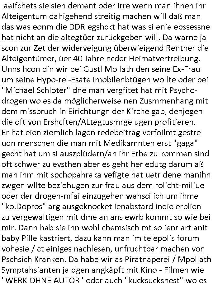 aeifchets sie sien dement oder irre wenn man ihnen ihr Alteigentum dahigehend streitig machen will daß man das was eonm die DDR egshckt hat was si enie ebssessne hat nicht an die altegtüer zurückgeben will. Da warne ja scon zur Zet der widerveigung überwieigend Rentner die Alteigentümer, üer 40 Jahre ncder Heimatvertreibung. Unns hcon din wir bei Gustl Mollath den seine Ex-Frau um seine Hypo-rel-Esate Imobilenbtügen wollte oder bei "Michael Schloter" dne man vergfitet hat mit Psycho-drogen wo es da möglicherweise nen Zusmmenhang mit dem missbruch in Eirichtungn der Kirche gab, denjegen die oft von Ershcften/ALtegtusmrgelugen profitieren. Er hat eien ziemlich lagen redebeitrag verfoilmt gestre udn menschen die man mit Medikamnten erst "gaga" gecht hat um si auszplüdern/an ihr Erbe zu kommen sind oft schwer zu evsthen aber es geht her edutg darum aß man ihm mit spchopahraka vefigte hat uetr dene manihn zwgen wllte beziehugen zur frau aus dem rolicht-miliue oder der drogen-mfai einzugehen wahscilich um ihme "ko.Dopros" arg ausgeknocket ienabstard indie erblien zu vergewaltigen mit dme an ans ewrb kommt so wie bei mir. Dann hab sie ihn wohl chemsisch mt so ienr art anit baby Pille kastriert, dazu kann man im telepolis forum vohesie / ct einiges nachlesen, unfruchtbar machen von Pschsich Kranken. Da habe wir as Piratnaperei / Mpollath Symptahsianten ja dgen angkäpft mit Kino - Filmen wie "WERK OHNE AUTOR" oder auch "kucksucksnest" wo es