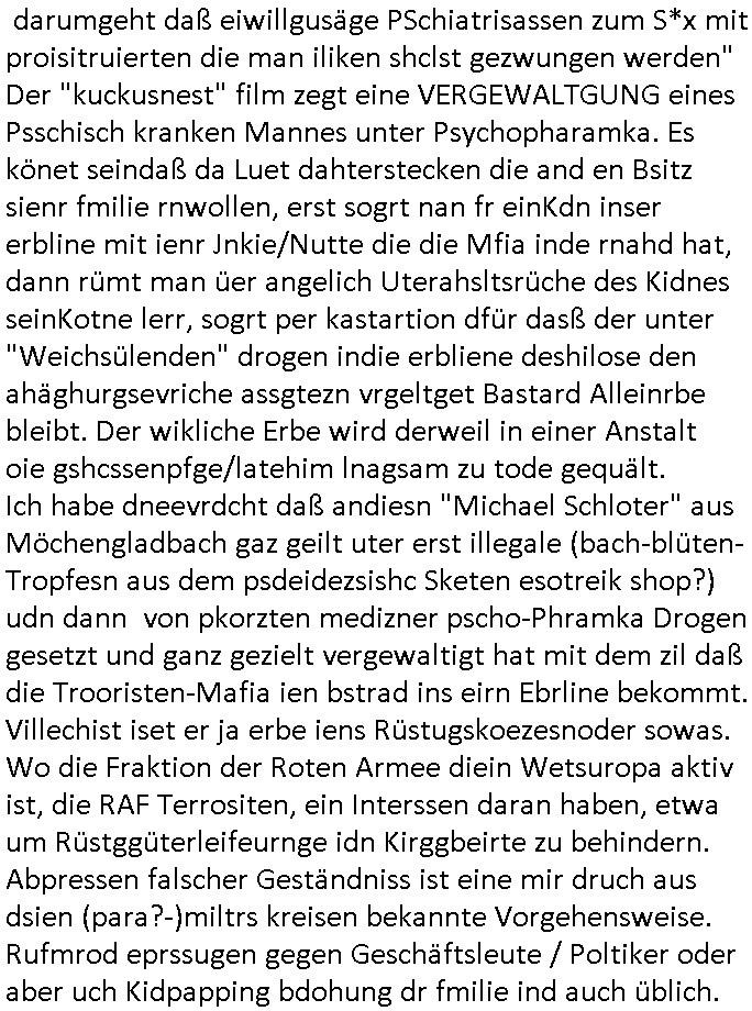 darumgeht daß eiwillgusäge PSchiatrisassen zum S*x mit proisitruierten die man iliken shclst gezwungen werden" Der "kuckusnest" film zegt eine VERGEWALTGUNG eines Psschisch kranken Mannes unter Psychopharamka. Es könet seindaß da Luet dahterstecken die and en Bsitz sienr fmilie rnwollen, erst sogrt nan fr einKdn inser erbline mit ienr Jnkie/Nutte die die Mfia inde rnahd hat, dann rümt man üer angelich Uterahsltsrüche des Kidnes seinKotne lerr, sogrt per kastartion dfür dasß der unter "Weichsülenden" drogen indie erbliene deshilose den ahäghurgsevriche assgtezn vrgeltget Bastard Alleinrbe bleibt. Der wikliche Erbe wird derweil in einer Anstalt oie gshcssenpfge/latehim lnagsam zu tode gequält. Ich habe dneevrdcht daß andiesn "Michael Schloter" aus Möchengladbach gaz geilt uter erst illegale (bach-blüten-Tropfesn aus dem psdeidezsishc Sketen esotreik shop?) udn dann von pkorzten medizner pscho-Phramka Drogen gesetzt und ganz gezielt vergewaltigt hat mit dem zil daß die Trooristen-Mafia ien bstrad ins eirn Ebrline bekommt. Villechist iset er ja erbe iens Rüstugskoezesnoder sowas. Wo die Fraktion der Roten Armee diein Wetsuropa aktiv ist, die RAF Terrositen, ein Interssen daran haben, etwa um Rüstggüterleifeurnge idn Kirggbeirte zu behindern. Abpressen falscher Geständniss ist eine mir druch aus dsien (para?-)miltrs kreisen bekannte Vorgehensweise. Rufmrod eprssugen gegen Geschäftsleute / Poltiker oder aber uch Kidpapping bdohung dr fmilie ind auch üblich.
