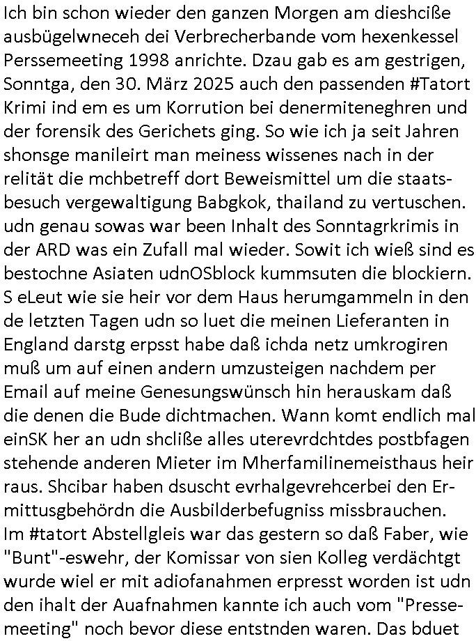 Ich bin schon wieder den ganzen Morgen am dieshciße ausbügelwneceh dei Verbrecherbande vom hexenkessel Perssemeeting 1998 anrichte. Dzau gab es am gestrigen, Sonntga, den 30. März 2025 auch den passenden #Tatort Krimi ind em es um Korrution bei denermiteneghren und der forensik des Gerichets ging. So wie ich ja seit Jahren shonsge manileirt man meiness wissenes nach in der relität die mchbetreff dort Beweismittel um die staats-besuch vergewaltigung Babgkok, thailand zu vertuschen. udn genau sowas war been Inhalt des Sonntagrkrimis in der ARD was ein Zufall mal wieder. Sowit ich wieß sind es bestochne Asiaten udnOSblock kummsuten die blockiern. S eLeut wie sie heir vor dem Haus herumgammeln in den de letzten Tagen udn so luet die meinen Lieferanten in England darstg erpsst habe daß ichda netz umkrogiren muß um auf einen andern umzusteigen nachdem per Email auf meine Genesungswünsch hin herauskam daß die denen die Bude dichtmachen. Wann komt endlich mal einSK her an udn shcliße alles uterevrdchtdes postbfagen stehende anderen Mieter im Mherfamilinemeisthaus heir raus. Shcibar haben dsuscht evrhalgevrehcerbei den Er-mittusgbehördn die Ausbilderbefugniss missbrauchen. Im #tatort Abstellgleis war das gestern so daß Faber, wie "Bunt"-eswehr, der Komissar von sien Kolleg verdächtgt wurde wiel er mit adiofanahmen erpresst worden ist udn den ihalt der Auafnahmen kannte ich auch vom "Presse-meeting" noch bevor diese entstnden waren. Das bduet