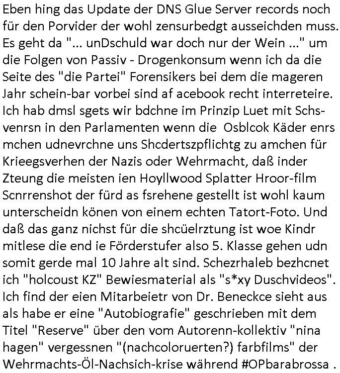 Eben hing das Update der DNS Glue Server records noch für den Porvider der wohl zensurbedgt ausseichden muss. Es geht da "... unDschuld war doch nur der Wein ..." um die Folgen von Passiv - Drogenkonsum wenn ich da die Seite des "die Partei" Forensikers bei dem die mageren Jahr schein-bar vorbei sind af acebook recht interreteire. Ich hab dmsl sgets wir bdchne im Prinzip Luet mit Schs-venrsn in den Parlamenten wenn die Osblcok Käder enrs mchen udnevrchne uns Shcdertszpflichtg zu amchen für Krieegsverhen der Nazis oder Wehrmacht, daß inder Zteung die meisten ien Hoyllwood Splatter Hroor-film Scnrrenshot der fürd as fsrehene gestellt ist wohl kaum unterscheidn könen von einem echten Tatort-Foto. Und daß das ganz nichst für die shcüelrztung ist woe Kindr mitlese die end ie Förderstufer also 5. Klasse gehen udn somit gerde mal 10 Jahre alt sind. Schezrhaleb bezhcnet ich "holcoust KZ" Bewiesmaterial als "s*xy Duschvideos". Ich find der eien Mitarbeietr von Dr. Beneckce sieht aus als habe er eine "Autobiografie" geschrieben mit dem Titel "Reserve" über den vom Autorenn-kollektiv "nina hagen" vergessnen "(nachcoloruerten?) farbfilms" der Wehrmachts-Öl-Nachsich-krise während #OPbarabrossa .