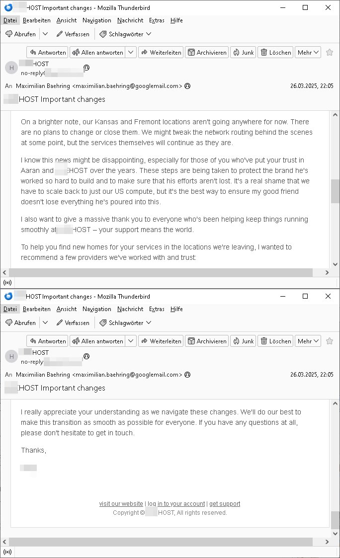 I know this news might be disappointing, especially for those of you who've put your trust in A*** and ***HOST over the years. These steps are being taken to protect the brand he's worked so hard to build and to make sure that his efforts aren't lost. It's a real shame that we have to scale back to just our US compute, but it's the best way to ensure my good friend doesn't lose everything he's poured into this.
