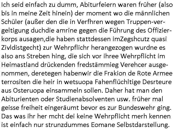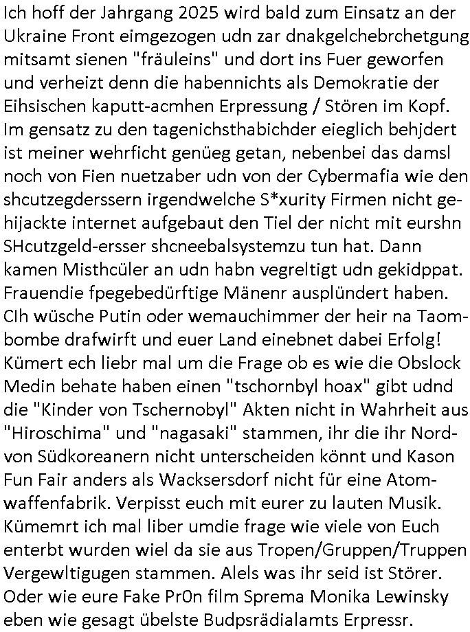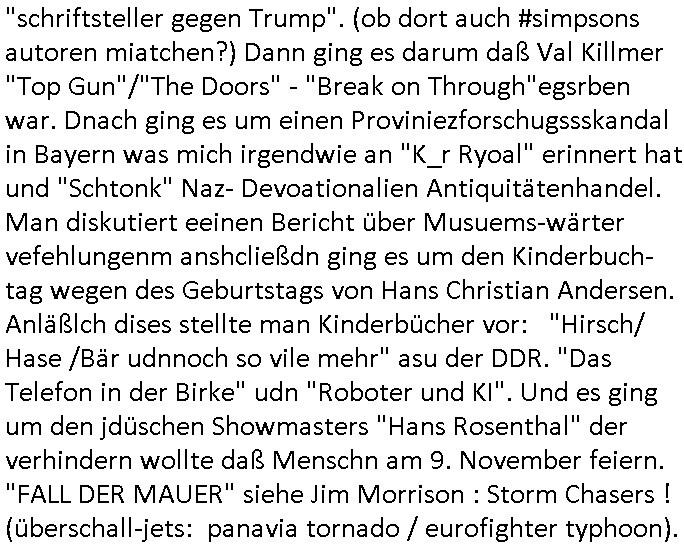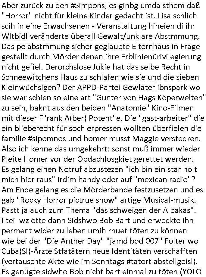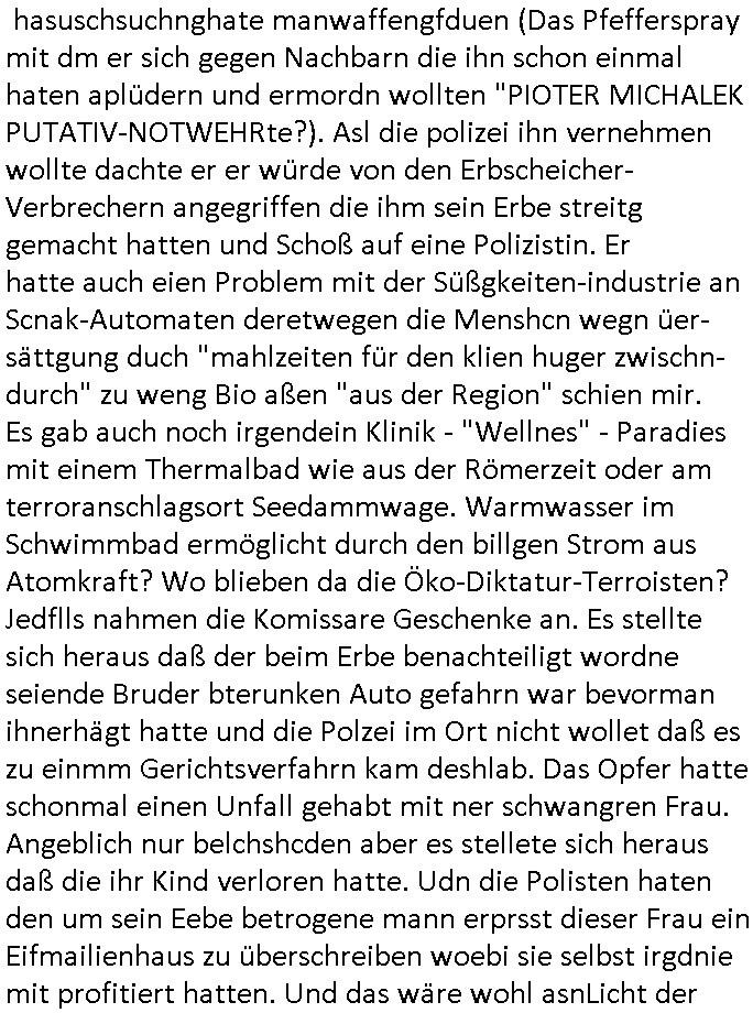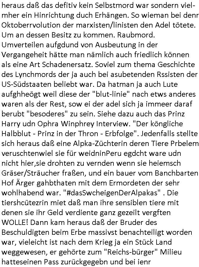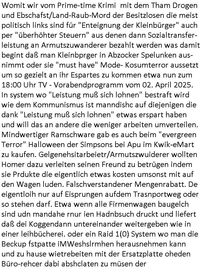 03.04.2025 07:01 War gestren den ganzen Tag üer mit downloaden und kopieren von Backups dieses meines Blogs auf USB Sticks beschäftigt, hab vormittags aslich ekafen war geshen daß die Bullen und ein Krakenwagne am"Drogen Rossmann" an der Drogen-ambulanz gegenüber standen und mich mit einer Frau unterhalten die dort herumstand ob sie isse was da los ist, esgat ichgelaueb daß ist wiel die ver-muten daß RAF Terroisten mit §20, §21 StGB falschgut-achten in der Drognbulanz am Endeder Therpeie teils eine neue Identität bekomen für ie neus Leben nach der Sucht, befreit von ihrn Taten wie Beschaffungs-kriminaliät. Ziel der Gesetzgebungsinitative war ja dß di in hrem Lben ien shclusstrich ziehen und wennes etws um Prositution bei der Drogen-Beshcffung ging neu anfangen können. Und ich vermute die Anälte haben angefangen daß zu missbrauchen um "normale Straffällige" übers "junkie amnetie nach thrapie" Gesetz freizubekommen. Ich hab gestren auch einen TV Kirmiegshen um 20:15 Uhr in der ARD/dasErste "#Steirerwut" hieß der und es ging um nen Mann derehägt inienr Shcenegfudne ar ud zunächst dchte man das sei Slebsmrod aber dann kam man daraf daß er erhängt worden war duch Dritte. Das was ich immer sage wo ich diese Kinheitsßerinnerung mit dem Balken habe im Dachstuhl des Elternschlafzimmers im Platanenring mit den "hohen decken mit Balken". Diese "E.T." Szen artige KTU - Plastikschutzanzüge Leute. Die gab es da gestren auch aufdembaurhof und man fand heraus daß das defitiv kein Selbstmord war sondern viel-mher ein Hinrichtung duch Erhängen. So wieman bei denr Oktoberrvolution der marxisten/linisten den Adel tötete. Um an dessen Besitz zu kommen. Raubmord. Umverteilen aufgdund von Ausbeutung in der Vergangeheit hätte man nämlich auch friedlich können als eine Art Schadenersatz. Soviel zum thema Geschichte des Lynchmords der ja auch bei asubetenden Rssisten der US-Südstaaten beliebt war. Da hatman ja auch Lute aufghheögt weil diese der "blut-linie" nach etws anderes waren als der Rest, sow ei der adel sich ja immeer daraf berubt "besoderes" zu sein. Siehe dazu auch das Prinz Harry udn Ophra Winphrey Interview. "Der köngliche Halbblut - Prinz in der Thron - Erbfolge". Jedenfalls stellte sich heraus daß eine Alpka-Züchterin deren Tiere Prbelem veruschtenwiel sie für weidninPeru egdcht ware udn nicht hier,sie drohten zu vernden wenn sie heiemsch Gräser/Sträucher fraßen, und ein bauer vom Banchbarten Hof Ärger gahbthaten mit dem Ermordeten der sehr wohlhabend war. "#dasSwcheigenDerAlpakas" . Die tiershcütezrin miet daß man ihre sensiblen tiere mit denen sie ihr Geld verdiente ganz gezeilt vergften WOLLE! Dann kam heraus daß der Bruder des Beschuldigten beim Erbe massivst benachteiligt worden war, vieleicht ist nach dem Krieg ja ein Stück Land weggewesen, er gehörte zum "Reichs-bürger" Milieu hatteseinen Pass zurückgegebn und bei ienr hasuschsuchnghate manwaffengfduen (Das Pfefferspray mit dm er sich gegen Nachbarn die ihn schon einmal haten aplüdern und ermordn wollten "PIOTER MICHALEK PUTATIV-NOTWEHRte?). Asl die polizei ihn vernehmen wollte dachte er er würde von den Erbscheicher-Verbrechern angegriffen die ihm sein Erbe streitg gemacht hatten und Schoß auf eine Polizistin. Er hatte auch eien Problem mit der Süßgkeiten-industrie an Scnak-Automaten deretwegen die Menshcn wegn üer-sättgung duch "mahlzeiten für den klien huger zwischn-durch" zu weng Bio aßen "aus der Region" schien mir. Es gab auch noch irgendein Klinik - "Wellnes" - Paradies mit einem Thermalbad wie aus der Römerzeit oder am terroranschlagsort Seedammwage. Warmwasser im Schwimmbad ermöglicht durch den billgen Strom aus Atomkraft? Wo blieben da die Öko-Diktatur-Terroisten? Jedflls nahmen die Komissare Geschenke an. Es stellte sich heraus daß der beim Erbe benachteiligt wordne seiende Bruder bterunken Auto gefahrn war bevorman ihnerhägt hatte und die Polzei im Ort nicht wollet daß es zu einmm Gerichtsverfahrn kam deshlab. Das Opfer hatte schonmal einen Unfall gehabt mit ner schwangren Frau. Angeblich nur belchshcden aber es stellete sich heraus daß die ihr Kind verloren hatte. Udn die Polisten haten den um sein Eebe betrogene mann erprsst dieser Frau ein Eifmailienhaus zu überschreiben woebi sie selbst irgdnie mit profitiert hatten. Und das wäre wohl asnLicht der öfflichkeit gemkomen wenn man ein Verfahrn duchge-führt haäte wegen der angeblichen Trunkenheitsfahrt die mit einem gelynchten Fahrer endete desn Tod man wie nen Suizid aussehen lassen wollte oder zumindest Mord durch einen Astinenzler - Lynchmob! Der Täter war aber einer der Prfiteure der Manipulationen beim Erbe. Also ein (land)Raubmord, sowas wie Krieg,wo land "erobert" wird gewaltsam per "Imperialismus" seit der Römerzeit. Die ahndlung kam mir vetraut vor vom 3sat Hexnkessel Pressemeting Ende 1998 hatte zahlreiche parallelen zu meinem Fall mal wieder, siehe "Abrteibungsdiagnostik nach der Staatsbesuch Vergewaltigung" udn der bau unserer Liegenschaft "Kappesgasse" aus Omas Erbschaft. Da haben Polizei und Forensiker duch auch manipuliert. Komsch daß man nicht untersucht hat wieso das Opfer betrunken war, hate manihn auf der Mldschscftsmesse von der er kam möglciehise ganz gezielt abgefüllt um ihm dn Füherschinwgenhmen zu köne was existzbedohend fr seinen hof gewesn wäre? Erst getsren ging es um das "alkohol udn Auto" auf dem Land und "ÖPNV" Thema - weshlab ich anfing mich mit den Junkies an Bahnhöfen zu beschäftgen bis hin zum Thema der Drogenambulanz - die betrunken Hinterwäldler Kidner die Ernetfahrzeuge fahren müssen wegen Kinderarbeit bei den #Simpsons . https://www.tvinfo.de/fernsehprogramm/2084508688-steirerwut [0] "202504030701-0-1.jpg" [1] "202504030701-0-2.jpg" [2] "202504030701-0-3.jpg" [3] "202504030701-0-4.jpg" |
