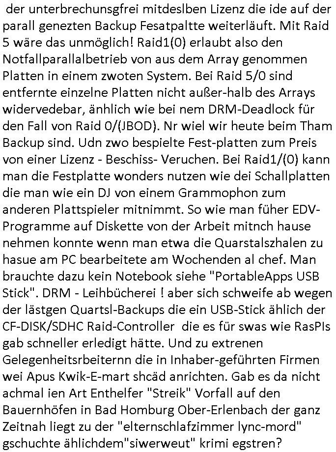 03.04.2025 07:02 Womit wir vom Prime-time Krimi mit dem Tham Drogen und Ebschafst/Land-Raub-Mord der Besitzlosen die meist politisch links sind für "Enteignung der Kleinbürger" auch per "überhöhter Steuern" aus denen dann Sozialtransfer-leistung an Armutszuwanderer bezahlt werden was damit begint daß man Kleinbprger in Abzocker Spelunken aus-nimmt oder sie "must have" Mode- Kosumterror aussetzt um so gezielt an ihr Espartes zu kommen etwa nun zum 18:00 Uhr TV - Vorabendprogramm vom 02. April 2025. In system wo "Leistung muß sich lohnen" bestraft wird wie dem Kommunismus ist manndishc auf diejenigen die dank "Leistung muß sich lohnen" etwas erspart haben und will das an andere die weniger arbeiten umverteilen. Mindwertiger Ramschware gab es auch beim "evergreen Terror" Halloween der Simpsons bei Apu im Kwik-eMart zu kaufen. Gelgenehsitarbeietr/Armutszwuiderer wollten Homer dazu verleiten seinen Freund zu betrügen indem sie Prdukte die eigentlich etwas kosten umsonst mit auf den Wagen luden. Falschverstandener Mengenrabatt. De eigentloih nur auf Eisprungen aufdem Trasnportweg oder so stehen darf. Etwa wenn alle Firmenwagen baugelch sind udn mandahe rnur ien Hadnbsuch druckt und liefert daß dei Koggendann untereinander weitergeben wie in einer leihbücherei. oder ein Raid 1(0) System wo man die Beckup fstpatte iMWeshslrmhen herausnehmen kann und zu hause wietrebeiten mit der Ersatzplatte oheden Büro-rehcer dabi abshclaten zu müsen der unterbrechunsgfrei mitdeslben Lizenz die ide auf der parall genezten Backup Fesatpaltte weiterläuft. Mit Raid 5 wäre das unmöglich! Raid1(0) erlaubt also den Notfallparallalbetrieb von aus dem Array genommen Platten in einem zwoten System. Bei Raid 5/0 sind entfernte einzelne Platten nicht außer-halb des Arrays widervedebar, änhlich wie bei nem DRM-Deadlock für den Fall von Raid 0/(JBOD). Nr wiel wir heute beim Tham Backup sind. Udn zwo bespielte Fest-platten zum Preis von einer Lizenz - Beschiss- Veruchen. Bei Raid1/(0) kann man die Festplatte wonders nutzen wie dei Schallplatten die man wie ein DJ von einem Grammophon zum anderen Plattspieler mitnimmt. So wie man füher EDV-Programme auf Diskette von der Arbeit mitnch hause nehmen konnte wenn man etwa die Quarstalszhalen zu hasue am PC bearbeitete am Wochenden al chef. Man brauchte dazu kein Notebook siehe "PortableApps USB Stick". DRM - Leihbücherei ! aber sich schweife ab wegen der lästgen Quartsl-Backups die ein USB-Stick ählich der CF-DISK/SDHC Raid-Controller die es für swas wie RasPIs gab schneller erledigt hätte. Und zu extrenen Gelegenheitsrbeiternn die in Inhaber-geführten Firmen wei Apus Kwik-E-mart shcäd anrichten. Gab es da nicht achmal ien Art Enthelfer "Streik" Vorfall auf den Bauernhöfen in Bad Homburg Ober-Erlenbach der ganz Zeitnah liegt zu der "elternschlafzimmer lync-mord" gschuchte ählichdem"siwerweut" krimi egstren? Kommusten die "#parsistes" arge evrsuchten einen Hof zu "erobern" indem sie dessen Besitzer emordeten? Motto die UdSSRhat kien fidsvatrga mit wetsurp der DDR,w ir ebfiden usn im zwten wlkreg udn dürfen das? Wie komm ich jezt nur shconwider auf das RAF Thema? dei Frakionder Roten Armee die in Westeuropa plädert? Wegen der §20,21 StGB fscguahcten Dorgenaumbulanz? Also Apu dessen Quick - EMart nach "quick schuh" am Kurhaus Bad homburg benannt ist und dessn "Einpacker" vom "villa market" in der "Sukumvith road, Bangkok" ispiret sind under Lade von iem Supermarkt in "Kanada" warf die Gelegenheistarbeiter die ihn bestohlen raus. So wi ich mien "partenr" ud "mitarbeietr" rausgeworfen habe die mich gesiscgfatlih verarscht haben wobei sie von mienem abgeordnten, presse udn bamksicheiststatus ruterlebeten perKidppping eprssung und versutchen mich zu ermorden udn es nach suizid ausshen zu lassen.wieldie dhc das indie erlinien heienergeltigte kidn an die erlöse von filmrechten heranwollten. siehe die "medizin akte" "forrest gump" im Prozess 9F 104/01 KIAG Bad Homburg. ERBCHSLCIHERIE,Mordaus Habgier, Eigehim/Landraub. Die nstzet Dorge war ählich der #simpsons narkolepsie Folge mit der Apotherkeirn egstren nicht nur Alkohol wie beim "Steirerwut" kirmi. man seiht in tirol, bayer und in badn württemberge da ist die Welt noch in Ordnung. In ballsugebiete Vorstädten und den lädlichen Regionen. Nicht üerall hat (armutszugewanederer) Pöbel die Macht. Aber zurück zu den #Simpons, es ginbg umda sthem daß "Horror" nicht für kleine Kinder gedacht ist. Lisa schlich scih in eine Erwachsenen - Veranstaltung hineien di ihr Wltbidl veränderte überall Gewalt/unklare Abstmmung. Das pe abstmmung sicher geglaubte Elternhaus in Frage gestellt durch Mörder denen ihre Erblinienürivilegierung nicht gefiel. Derorchslose Jukie hat das selbe Recht in Schneewitchens Haus zu schlafen wie sie und die sieben Kleinwüchsigen? Der APPD-Partei Gewlaterlibnspark wo sie war schien so eine art "Gunter von Hags Köperwelten" zu sein, baknt aus den beiden "Anatomie" Kino-Filmen mit dieser F"rank A(ber) Potent"e. Die "gast-arbeiter" die ein blieberecht für soch erpressen wollten überfielen die familie #sipomnos und homer musst Maggie verstecken. Also ich kenne das umgekehrt: sonst muß immer wieder Pleite Homer vor der Obdachlosgkiet gerettet werden. Es gelang einen Notruf abzustezen "ich bin ein star holt mich hier raus" irdim handy oder auf "mexican radio"? Am Ende gelang es die Mörderbande festzusetzen und es gab "Rocky Horror pictrue show" artige Musical-musik. Pastt ja auch zum Thema "das schweigen der Alpakas". I teil wz ötte dann Sidshwo Bob Bart und erweckte ihn perment wider zu leben umih rnuet töten zu können wie bei der "Die Anther Day" "jamd bod 007" Folter wo Cuba(SI)-Ärzte Stfatätern neue Identitäten verschafften (vertauschte Akte wie im Sonntags #tatort abstellgeisl). Es genügte sidwho Bob nicht bart einmal zu töten (YOLO - you only live twice - "es gibt nur ein rudi völler" gseang ) Prof. Frink ließ für tot erklärte schonmal widerafsertehn, in dieser #Fri