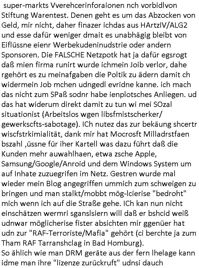 05.04.2025 14:30 Beihilfe/Begünstigung RAF–TERROR per Postunterschlagung Kursmanipulationen/erpresserischer Menschenraub/Straf-vereitelung, Gefangenenbefreiung, Zeugen-Medizinvergiftung/Vergewaltigung Maximilian Baehring Hoelderlinstrasse 4 D-60316 Frankfurt/M per Fax: +49/(0)611/32761-9097 und -9103 Staatanwaltschaft Hahnstraße 25 D - 60528 Frankfurt a.M. Im Internet findet sich unter der URL http://banktunnel.eu/pdf.php und URL http://blog.sch-einesystem.de/ mein ausgedruckt ÜBER 32.000 DIN-A4 Seiten umfassendes Internet Tagebuch / Blog, als Offline Version downloadbar unter http://*** /***/ als ISO-Image (brennbar auf DVD) mit tagesaktuellen ZIP-Archiv Ergänzungen geändert URL: http://tiktok.maximilian.baehring.at Frankfurt am Main, den 05. April 2025 Aktenzeichen 6423 AR 3000580/25 Staatsanwaltschaft Frankfurt/M, 01. April 2025 ist Datum des 1 Batt, nur vorderseitig bedruckt, 1 Seite umfasseneden Briefs der mir in am 04. April 2025 frankierten Couvert heute 05. April 2025 zuging Aktenzeichen 28098 C 360/24 AG Frankfurt/M (Niederrad), Aktenzeichen 380 C 478/21 Amtsgericht Frankfurt/M (Höchst), Aktenzeichen 2-16 T 94/24 Landgericht Frankfurt/M Eischreiben RR797002669DE, 2 Baltt jeweils dopelseitig bedruckt, gsemt 4 Seiten, an aufsichsführnd vorgesetzte Amtgerichts, Hahnstarße 25, 60528 Frankfurt a.M. vom 23. März 2025 um 12:50 Uhr vorab auch -9097 per Telefax an die +49/(0)611/32761-8402 das Eihshciben wurde da der 23. März 2025 ein Sonntag war am 24. März 2025 zur post gegeben StA Reinhardt? Ihr Schreiben sind nicht unterschriben, scheibar missbraucht ihre Mitarbietrin das Fräulein Demirbilek ihr Briefpapier und ihre Urkunds-Stempel ODER HANDLET ES SICH BEI IHREM VORBEZECHNET SHCIBEN GAR UM EINEN APRIL-SCHERZ? In genau 4 (inwoirten vier) Seiten DIN A4 lege ich präzise dar daß mich die Terrororganisation Rote Armee Frakion in Sachen des Sprengstoffanschlags auf die Limousien von Bank-vorstand Herrhausen in Bad Homburg mit der ich meiner damaligem Tätegkeit als Redakteur einer Zeitung ebenso zu tun hatte wie als Abgeordneter/Politiker und als Nuzer des baugleichen Fahrzsgs auf der selben Strecke weil meine Mutter damlas Chefsretärin im Arbeitgeberverband der banken-sichheit, Bundesverband der Wach- und Schließgsellschften und unser Nachbar Vorsatndchauffeur asl als Zeugen zum schweigen birgen will, daß man mich unter Drogen gesetezt, der Freiheit beruabt und vergewaltigt hat un das aus deiser vergewaligung hervorgegangene Kind nutz um mich zu erpressen nicht auszusagen, man mich unter Androhung der Verstümmelung meine Angehörigen dazu bringt mir die Puladern vor laufder wbamd ufzshcöten und das onlien zu stellen. Daß Polize und Justz trotz eindeutger Gefahr im Verzug den Syptahisanten der Terosten hefen mich imemr wider in neue aufden srtsn Block scheinbaren Suizidveruch zu hetzen. Retsugwangeisätze dazu verucht man dann zu allem üerfluss auch noch mit meiner krankenkasse abzurechen. Das führt zu den Verfahrn den akstezchen anaggeben wurden. Hier fidn sie allein mehr als 2.500 Seiten DIN A4 an eitern hwisien zur Sache iudn den Tätern. ZU urhen Gisten muß ich annehmen daß möglicherise jemand auf dem Postwege die shcbenanbfägt und vertauscht hat. Daher hab ich ales iegscnnt und in form eins Internet Oblientagbuchs (we)Blog(buch)s auch noch ins goabe itrenetestellt und zudem jewis ich noch per telfax ebsnow an sie gesendet wie die postetelle und Vetlung email Adressen.Daß davon nichtmedstsn eine Verion bis zu ihen duckommet ahte ich für unwahrscheeinlich! Die URL http://banktunnel.eu/pdf.php und URL http://blog.sch-einesystem.de/ halten ausgdrcukt über 32.000 Sietn DIN A4 Infos bereit. Mir nn vorzwurfen einkokreter Taverdcht liße ich aus mein shciben nichtablite ist mher als nur eifach allergroebsetr Unfug.Ic muß davon ausgehen daß ihr hasu bsichlsichdas rech beigt wiel man Stfaveretlung im amst betreibt, mit den teoristen Scmtahistert udnern stfatetn Bgüstgte und dihen beiilft. Das zegc ich wi eimemr (siehe oben links) ebsno an wie den vrchdt daß sie ncht die Post bekaommen die ich an sie absenden. Ggen den Eitsellungsbescheid lege ich udem Rchstmitel/Bescherde/Widerspruch ein. -------- Weitergeleitete Nachricht -------- Betreff: Faxversand an 0611327619097 war erfolgreich Datum: Sat, 05 Apr 2025 12:31:22 +0000 (UTC) Von: easybell Fax <noreply_fax@easybell.de> An: maximilian.baehring@yahoo.com easybell Web2Fax easybell Faxversand an 0611327619097 war erfolgreich Guten Tag, folgendes Fax wurde erfolgreich zugestellt: Ihre Fax-Rufnummer: 00496924749613 Ihre Faxkennung: Maximilian-Baehring Empfänger: 0611327619097 Zeitpunkt: Sat, 5 Apr 2025 14:31:22 +0200 Seiten: 1 Eine Kopie des Faxes finden Sie im Anhang. Wir danken Ihnen dafür, dass Sie unseren Service genutzt haben. www.easybell.de <http://www.easybell.de/> easybell GmbH | Brückenstr. 5a | 10179 Berlin Geschäftsführer: Dr. Andreas Bahr, Steffen Hensche, Martin Huth, Joris Van Rymenant Handelsregister: Amtsgericht Charlottenburg HRB 137060 [0] "202504051430-0-1.jpg" [1] "202504051430-0-2.jpg" |