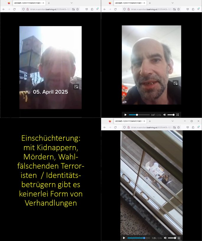 05.04.2025 12:39 http://tiktok.maximilian.baehring.at/20250405-1239-F1153841613138037.mp4 Einschüchterung: mit Kidnappern, Vordern, Wahl-fälschenden Terror-isten / Identitäts-betrügern gibt es keinerlei Form von Verhandlungen [0] "202504051239-0-1.jpg" |