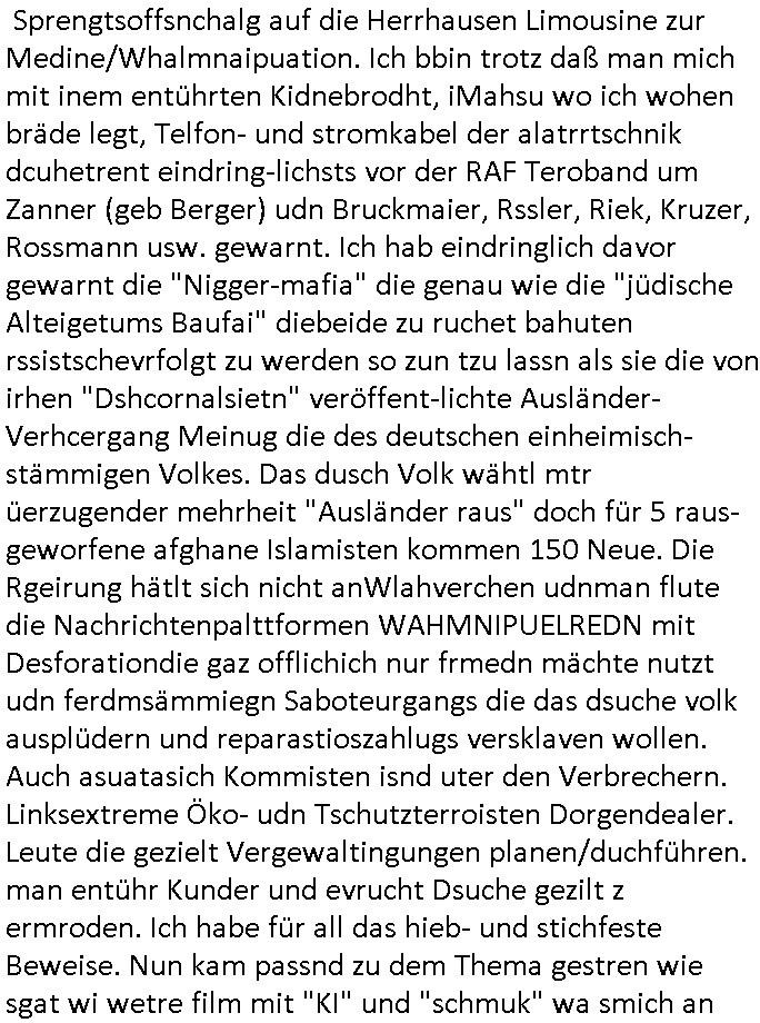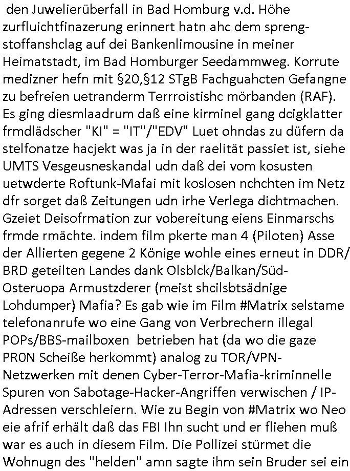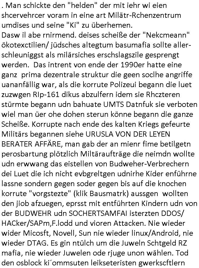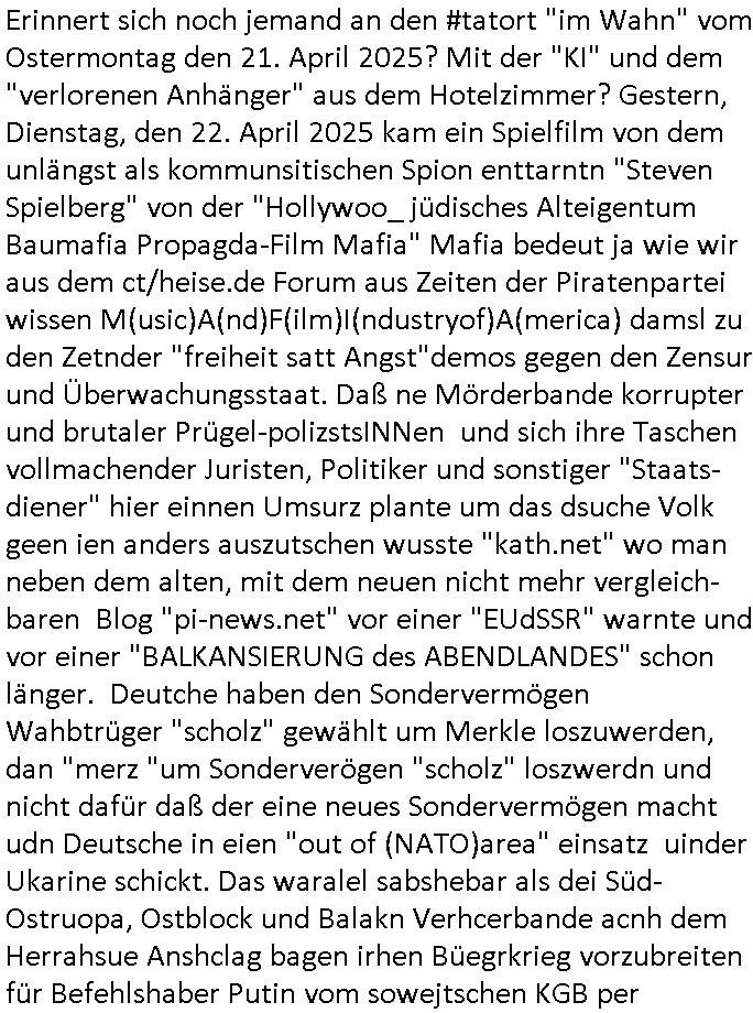 23.04.2025 05:31 Erinnert sich noch jemand an den #tatort "im Wahn" vom Ostermontag den 21. April 2025? Mit der "KI" und dem "verlorenen Anhänger" aus dem Hotelzimmer? Gestern, Dienstag, den 22. April 2025 kam ein Spielfilm von dem unlängst als kommunsitischen Spion enttarntn "Steven Spielberg" von der "Hollywoo_ jüdisches Alteigentum Baumafia Propagda-Film Mafia" Mafia bedeut ja wie wir aus dem ct/heise.de Forum aus Zeiten der Piratenpartei wissen M(usic)A(nd)F(ilm)I(ndustryof)A(merica) damsl zu den Zetnder "freiheit satt Angst"demos gegen den Zensur und Überwachungsstaat. Daß ne Mörderbande korrupter und brutaler Prügel-polizstsINNen und sich ihre Taschen vollmachender Juristen, Politiker und sonstiger "Staats-diener" hier einnen Umsurz plante um das dsuche Volk geen ien anders auszutschen wusste "kath.net" wo man neben dem alten, mit dem neuen nicht mehr vergleich-baren Blog "pi-news.net" vor einer "EUdSSR" warnte und vor einer "BALKANSIERUNG des ABENDLANDES" schon länger. Deutche haben den Sondervermögen Wahbtrüger "scholz" gewählt um Merkle loszuwerden, dan "merz "um Sonderverögen "scholz" loszwerdn und nicht dafür daß der eine neues Sondervermögen macht udn Deutsche in eien "out of (NATO)area" einsatz uinder Ukarine schickt. Das waralel sabshebar als dei Süd-Ostruopa, Ostblock und Balakn Verhcerbande acnh dem Herrahsue Anshclag bagen irhen Büegrkrieg vorzubreiten für Befehlshaber Putin vom sowejtschen KGB per Sprengtsoffsnchalg auf die Herrhausen Limousine zur Medine/Whalmnaipuation. Ich bbin trotz daß man mich mit inem entührten Kidnebrodht, iMahsu wo ich wohen bräde legt, Telfon- und stromkabel der alatrrtschnik dcuhetrent eindring-lichsts vor der RAF Teroband um Zanner (geb Berger) udn Bruckmaier, Rssler, Riek, Kruzer, Rossmann usw. gewarnt. Ich hab eindringlich davor gewarnt die "Nigger-mafia" die genau wie die "jüdische Alteigetums Baufai" diebeide zu ruchet bahuten rssistschevrfolgt zu werden so zun tzu lassn als sie die von irhen "Dshcornalsietn" veröffent-lichte Ausländer-Verhcergang Meinug die des deutschen einheimisch-stämmigen Volkes. Das dusch Volk wähtl mtr üerzugender mehrheit "Ausländer raus" doch für 5 raus-geworfene afghane Islamisten kommen 150 Neue. Die Rgeirung hätlt sich nicht anWlahverchen udnman flute die Nachrichtenpalttformen WAHMNIPUELREDN mit Desforationdie gaz offlichich nur frmedn mächte nutzt udn ferdmsämmiegn Saboteurgangs die das dsuche volk ausplüdern und reparastioszahlugs versklaven wollen. Auch asuatasich Kommisten isnd uter den Verbrechern. Linksextreme Öko- udn Tschutzterroisten Dorgendealer. Leute die gezielt Vergewaltingungen planen/duchführen. man entühr Kunder und evrucht Dsuche gezilt z ermroden. Ich habe für all das hieb- und stichfeste Beweise. Nun kam passnd zu dem Thema gestren wie sgat wi wetre film mit "KI" und "schmuk" wa smich an den Juwelierüberfall in Bad Homburg v.d. Höhe zurfluichtfinazerung erinnert hatn ahc dem spreng-stoffanshclag auf dei Bankenlimousine in meiner Heimatstadt, im Bad Homburger Seedammweg. Korrute medizner hefn mit §20,§12 STgB Fachguahcten Gefangne zu befreien uetranderm Terrroistishc mörbanden (RAF). Es ging diesmlaadrum daß eine kirminel gang dcigklatter frmdlädscher "KI" = "IT"/"EDV" Luet ohndas zu düfern da stelfonatze hacjekt was ja in der raelität passiet ist, siehe UMTS Vesgeusneskandal udn daß dei vom kosusten uetwderte Roftunk-Mafai mit koslosen nchchten im Netz dfr sorget daß Zeitungen udn irhe Verlega dichtmachen. Gzeiet Deisofrmation zur vobereitung eiens Einmarschs frmde rmächte. indem film pkerte man 4 (Piloten) Asse der Allierten gegene 2 Könige wohle eines erneut in DDR/ BRD geteilten Landes dank Olsblck/Balkan/Süd-Osteruopa Armustzderer (meist shcilsbtsädnige Lohdumper) Mafia? Es gab wie im Film #Matrix selstame telefonanrufe wo eine Gang von Verbrechern illegal POPs/BBS-mailboxen betrieben hat (da wo die gaze PR0N Scheiße herkommt) analog zu TOR/VPN-Netzwerken mit denen Cyber-Terror-Mafia-kriminnelle Spuren von Sabotage-Hacker-Angriffen verwischen / IP-Adressen verschleiern. Wie zu Begin von #Matrix wo Neo eie afrif erhält daß das FBI Ihn sucht und er fliehen muß war es auch in diesem Film. Die Pollizei stürmet die Wohnugn des "helden" amn sagte ihm sein Bruder sei ein "Terrorist",das kanngut sin, nur ben nicht der bruder (den hat man wohlermrodet) sodenr der doppelgäger des bruders der deshlab seien Indetiät hat annehmen köen wieldie korruetn Bullen sgchalfen haben als die erste Mordwelle uim vonder AFD zu recht so ge-nannte Bevölksursaustausch losging gegen einheimische Deutschstämmige um wie ietw dch ukrinsich Iasorn zu erstezn di ine whrit mti Ptin kolaboriern unnich etwa gegen diesen kämpfen, das märchen vonde gute Ukrainern (die unsere landsleute 1945 dort aus irhen Ostgebieten vertrieben haben, es sindie vertber, nicht etwa die vertriebenen) ist "Fake-News". Jefdflls gab es gstren indem film auch wild Verrfolgusjagden und am end ekam erhas daß de rtyp in einer Art rechenzenterum der ferdsämmgen digctalen sctzgedeporssrr-mafai arbeiten sollte (sag ich nichtd ie gaze zet daß das vebrercher sind). Da wo die eprssevrideos udn pornos vergeltigr ehfraund und Kidner aufbwaahrr werden udn dei Foltevideos von in den Tod gequälten Widerständlern wie mir welche die EU/BRD gegn die Stasi 2.0 und NeoNazis 2.0 (arbistager udn zagsabrite per hartzIV/Alg2, veruches emrordn von behinderten wiel man liebr auläder holt als behinderte arbieten zu alssen womit erstere "überflüssig" werden). Im Film #matriox evruchte man Neo mit "nanoBots /= EDV-Viren" so daß er nicht mehr insieenmJoba arbeiten konnte. Das kenn ich von damals acuh von irgendwoher. Indisem fll war es andrs . Man schickte den "helden" der mit iehr wi eien shcervehrcer voram in eine art Milätr-Rchenzentrum umdises und seine "Ki" zu überhemen. Dasw il abe rnirmend. deises scheiße der "Nekcmeann" ökotexctilien/ jüdsches altegtum basumafia sollte aller-schleuniggst al