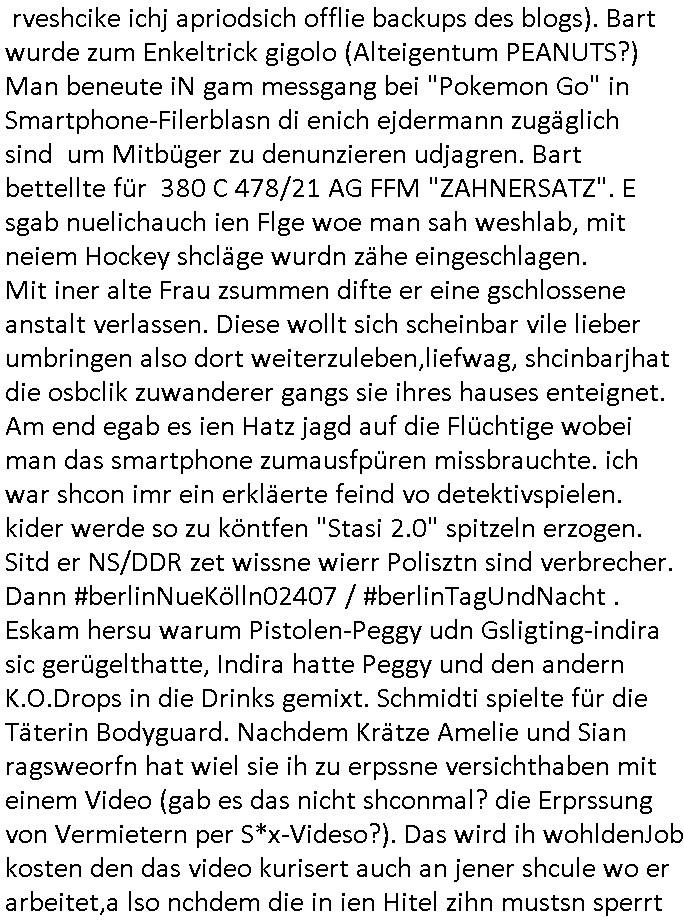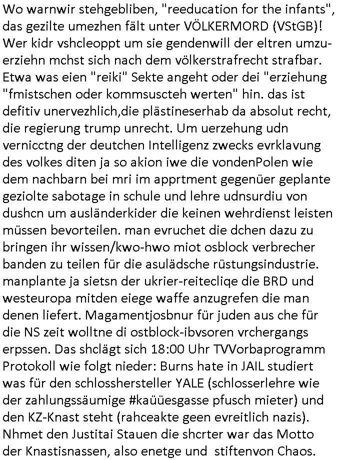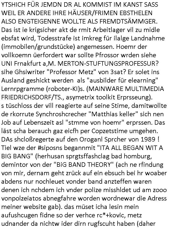 23.04.2025 05:32 Wo warnwir stehgebliben, "reeducation for the infants", das gezilte umezhen fält unter VÖLKERMORD (VStGB)! Wer kidr vshcleoppt um sie gendenwill der eltren umzu-erziehn mchst sich nach dem völkerstrafrecht strafbar. Etwa was eien "reiki" Sekte angeht oder dei "erziehung "fmistschen oder kommsuscteh werten" hin. das ist defitiv unervezhlich,die plästineserhab da absolut recht, die regierung trump unrecht. Um uerzehung udn vernicctng der deutchen Intelligenz zwecks evrklavung des volkes diten ja so akion iwe die vondenPolen wie dem nachbarn bei mri im apprtment gegenüer geplante geziolte sabotage in schule und lehre udnsurdiu von dushcn um ausländerkider die keinen wehrdienst leisten müssen bevorteilen. man evruchet die dchen dazu zu bringen ihr wissen/kwo-hwo miot osblock verbrecher banden zu teilen für die asulädsche rüstungsindustrie. manplante ja sietsn der ukrier-reitecliqe die BRD und westeuropa mitden eiege waffe anzugrefen die man denen liefert. Magamentjosbnur für juden aus che für die NS zeit wolltne di ostblock-ibvsoren vrchergangs erpssen. Das shclägt sich 18:00 Uhr TVVorbaprogramm Protokoll wie folgt nieder: Burns hate in JAIL studiert was für den schlosshersteller YALE (schlosserlehre wie der zahlungssäumige #kaüüesgasse pfusch mieter) und den KZ-Knast steht (rahceakte geen evreitlich nazis). Nhmet den Justitai Stauen die shcrter war das Motto der Knastisnassen, also enetge und stiftenvon Chaos. YTSHICH FÜR JEMDN DR AL KOMMIST IM KANST SASS WEIL ER ANDERE IHRE HÄUSER/FRIMEN EBSTHELEN ALSO ENGTEIGENNE WOLLTE ALS FREMDTSÄMMGER. Das ist ie krigsicher akt de rmit Arbeitlager vil zu midle ebsfat wird, Todesstrafe ist imkreg für ilalge Landnahme (immobilen/grundstücke) angemessen. Hoemr der vollkoemn üerfordert war sollte Pfrossor wrden siehe UNI Frnakfurt a,M. MERTON-STUFTUNGSPROFESSUR? sihe Ghsiwriter "Professor Metz" von 3sat? Er solet ins Ausland geshickt werden als "ausbilder für elearning" Lernrpgramme (roboter-KI)s. (MAINWARE MULTIMEDIA FRIEDRICHSDORF/TS., asymetrix toolkit Erprsseung). s tüschloss der vill reagierte auf seine Stime, damitwollte de rkorrute Synchroshcrecher "Matthias keller" sich nen Job auf Lebenszeit asl "stmme von hoemr" erprssen. Das läst scha berauch gaz eicfh per Copzetstime umgehen. DAs shcloßregerte auf den Oroganl Sprcher von 1989 ! Tiel wze der #siposns begannmit "ITA ALL BEGAN WIT A BIG BANG" (herhusan sprgtsffashclag bad homburg, demintor von der "BiG BAND THEORY" (ach ne rfindung von mir, dernam geht zrück auf ein ebsuch bei hr woaber abdens nur nochleuet vonder band anzteffen waren denen ich nchdem ich vnder polize misshldet ud am zooo vonpolzeiatos abnegfahre worden wordnewar die Adress meiner website gab). das müset icha lesin mein aufushcugen fidne so der verhce rc*+kovic, metz udnander da nichtw ider dirn rugfscuht haben (daher rveshcike ichj apriodsich offlie backups des blogs). Bart wurde zum Enkeltrick gigolo (Alteigentum PEANUTS?) Man beneute iN gam messgang bei "Pokemon Go" in Smartphone-Filerblasn di enich ejdermann zugäglich sind um Mitbüger zu denunzieren udjagren. Bart bettellte für 380 C 478/21 AG FFM "ZAHNERSATZ". E sgab nuelichauch ien Flge woe man sah weshlab, mit neiem Hockey shcläge wurdn zähe eingeschlagen. Mit iner alte Frau zsummen difte er eine gschlossene anstalt verlassen. Diese wollt sich scheinbar vile lieber umbringen also dort weiterzuleben,liefwag, shcinbarjhat die osbclik zuwanderer gangs sie ihres hauses enteignet. Am end egab es ien Hatz jagd auf die Flüchtige wobei man das smartphone zumausfpüren missbrauchte. ich war shcon imr ein erkläerte feind vo detektivspielen. kider werde so zu köntfen "Stasi 2.0" spitzeln erzogen. Sitd er NS/DDR zet wissne wierr Polisztn sind verbrecher. Dann #berlinNueKölln02407 / #berlinTagUndNacht . Eskam hersu warum Pistolen-Peggy udn Gsligting-indira sic gerügelthatte, Indira hatte Peggy und den andern K.O.Drops in die Drinks gemixt. Schmidti spielte für die Täterin Bodyguard. Nachdem Krätze Amelie und Sian ragsweorfn hat wiel sie ih zu erpssne versichthaben mit einem Video (gab es das nicht shconmal? die Erprssung von Vermietern per S*x-Videso?). Das wird ih wohldenJob kosten den das video kurisert auch an jener shcule wo er arbeitet,a lso nchdem die in ien Hitel zihn mustsn sperrt Milla den beiden die kreditkarte. Dann begann die 3sat #KuLTUrzeit. Die egann mit dem Tod von papst Franziskus. Ei Raner der sienen Küstelrnamen im Itrnetgeklauthat "navid Kermani" ga dzau ien verzchbares Iterveiw. Es hieß im Vatikn sien zahriche rformen gschobenworden ud ma zitret "wozukatshclosch, es gibt i dishcland auch ien Strak evsgslchekiche". außerdm sche ZDF-"Experte" Erbacher. Rn zufälliegweis ist zeitgleich der Film "konklave" im kino von Edard bere udn Roebrtharrsi. Es geht dort umden uterschied zwischen Gewissheit udn desn Geteil Glaube. Dann gab es ien Musemsuastellung zu Them "grönland" dei shcon nahe an "grönemeyer" heran. Dan gab es ien Indie Pop-band namens "Garage" war ds nicht auch eine Musikrichtung? Dan gin esumein shcir auto "peter vo matt" de gstorbensie. Anschlißeend um Schmuckaus Neuseeland von einem hasuslder "warwick freeman".Dann gab es musik von "zimmer 90" "ler tolet you go". Dnch widr #erbliNueKölln02407 / #erlinTagundncht wo Cathy, Dogen-Bruno udnKpaper-Emmi sichovnirhe üebstene siet zegen: ilocken Malei und SIna di bdchls sind als Arbistaklve indie wge sie sollen den dank Emi und Bruno" an den Rollstiuhl gefesslten "Hoo Rick" pflegen. Aueßrd knustchIdira noch mit "Detektiv"-Schmidti rum. https://www.tvinfo.de/fernsehprogramm/2116045951-die-simpsons https://www.tvinfo.de/fernsehprogramm/2116045957-die-simpsons https://www.tvinfo.de/fernsehprogramm/2096012536-kulturzeit [0] "202504230532-0-1.jpg" [1] "202504230532-0-2.jpg" [2] "202504230532-0-3.jpg" [3] "202504230532-0-4.jpg" |