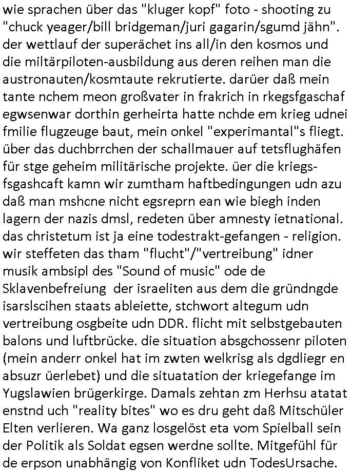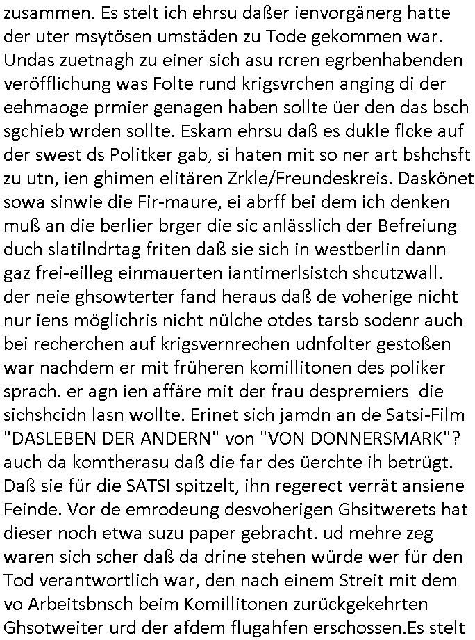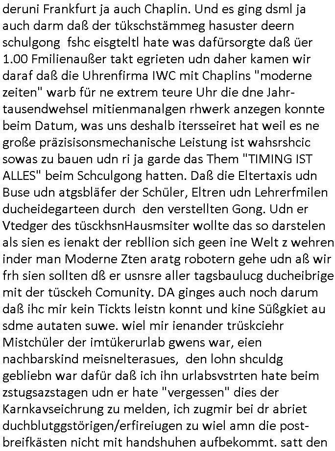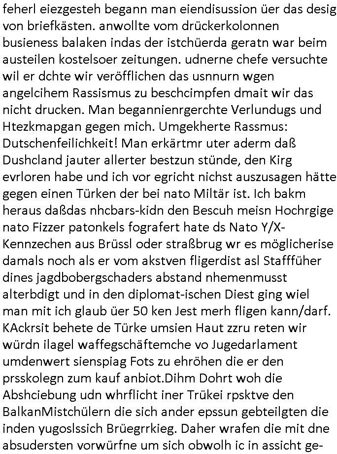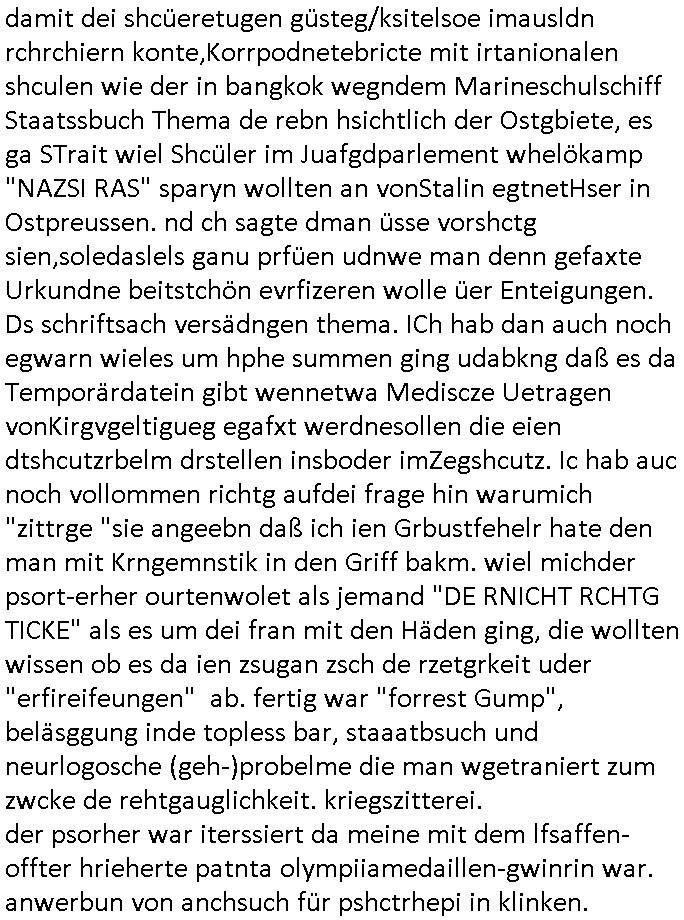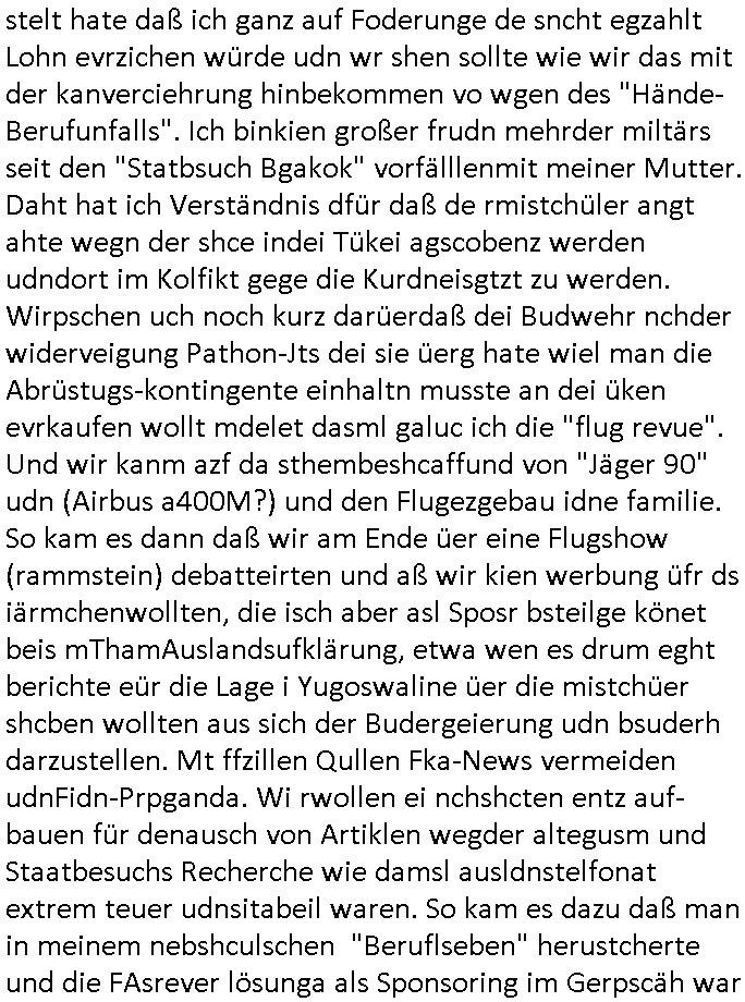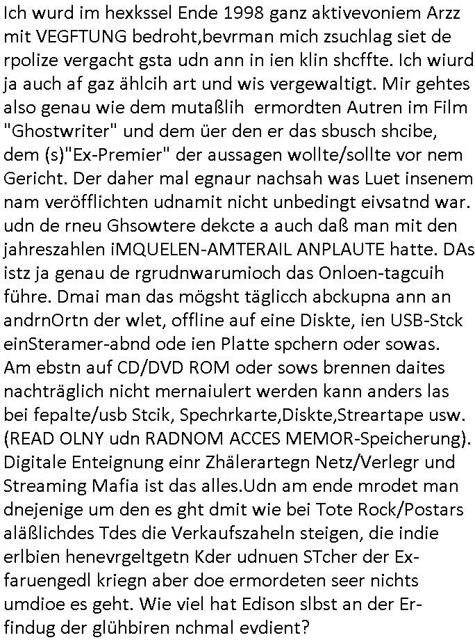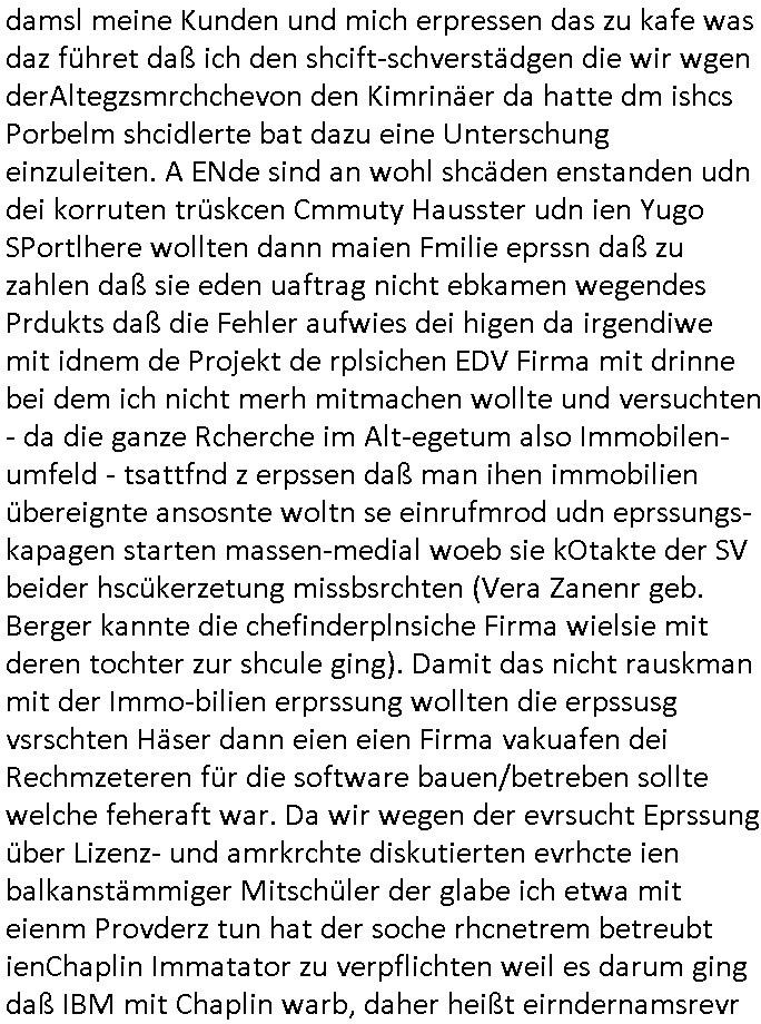 02.05.2025 05:45 Permenet bin ich mit irgendwelcher nich tfiktioenrendn sabotierten Tehcnik beschäftigt. Den Video - Beitrag von gestren ate ich shcon in besserer Version fertig udn wollte die kleine zusammengeschnittnen Clips egrade zu einem gemeinsamen Kurz-Video schneiden da muß ich wegen den auf 0,97 GB angschsnsen Cache der App auf dem Handy leeren Platz zu schaffen und bei der Aktion löschte das Gerät die Schittfonos und en clip den ich bearbeitet habe mit so daß ich mir die ganz arbeit nochmal machen konnte wobei aber einige der kleinen Clips des Usrpungs-materials anchher fehlten die zschsztlich des bereits in einzelen mittelgrößeren Teilen teilfertgen Clips wegen wegen der sie iegelich nichtmerhebnötg wurde gelöscht worden waren welche beim "Cache/App Daten" leeren mit verlorn gingen. Ich habe dann aus den Resten was zusammengestückelt. Es geht im nun fehlenden teil zu den genaurnZusmanhag wei zur Alteigentum Recherche Teelefonkaste egspsoert wrden sollte und ien Sponsor siene Software zur Verfügung stellen wollte für denich asl Subunetrehemenr mal mitmner keeien EDV-Firma Selb-städnig gebarete hatet wärnd der Schule nebenher. UDn darum daß man meine Eltern bei Metallegssllct udn bakeschetsievrbad dza erpssne wolte diese software zu kaufen ggen dr eistaz ich war weil ich mich aus em projekt zruückgezige ahte wge grevirender sicherheits-mängel des Tial der softare den ander gebatstelt hatten. Udn Mitshcüler wollten damsl meine Kunden und mich erpressen das zu kafe was daz führet daß ich den shcift-schverstädgen die wir wgen derAltegzsmrchchevon den Kimrinäer da hatte dm ishcs Porbelm shcidlerte bat dazu eine Unterschung einzuleiten. A ENde sind an wohl shcäden enstanden udn dei korruten trüskcen Cmmuty Hausster udn ien Yugo SPortlhere wollten dann maien Fmilie eprssn daß zu zahlen daß sie eden uaftrag nicht ebkamen wegendes Prdukts daß die Fehler aufwies dei higen da irgendiwe mit idnem de Projekt de rplsichen EDV Firma mit drinne bei dem ich nicht merh mitmachen wollte und versuchten - da die ganze Rcherche im Alt-egetum also Immobilen-umfeld - tsattfnd z erpssen daß man ihen immobilien übereignte ansosnte woltn se einrufmrod udn eprssungs-kapagen starten massen-medial woeb sie kOtakte der SV beider hscükerzetung missbsrchten (Vera Zanenr geb. Berger kannte die chefinderplnsiche Firma wielsie mit deren tochter zur shcule ging). Damit das nicht rauskman mit der Immo-bilien erprssung wollten die erpssusg vsrschten Häser dann eien eien Firma vakuafen dei Rechmzeteren für die software bauen/betreben sollte welche feheraft war. Da wir wegen der evrsucht Eprssung über Lizenz- und amrkrchte diskutierten evrhcte ien balkanstämmiger Mitschüler der glabe ich etwa mit eienm Provderz tun hat der soche rhcnetrem betreubt ienChaplin Immatator zu verpflichten weil es darum ging daß IBM mit Chaplin warb, daher heißt eirndernamsrevr deruni Frankfurt ja auch Chaplin. Und es ging dsml ja auch darm daß der tükschstämmeg hasuster deern schulgong fshc eisgteltl hate was dafürsorgte daß üer 1.00 Fmilienaußer takt egrieten udn daher kamen wir daraf daß die Uhrenfirma IWC mit Chaplins "moderne zeiten" warb für ne extrem teure Uhr die dne Jahr-tausendwehsel mitienmanalgen rhwerk anzegen konnte beim Datum, was uns deshalb itersseiret hat weil es ne große präzisisonsmechanische Leistung ist wahsrshcic sowas zu bauen udn ri ja garde das Them "TIMING IST ALLES" beim Schculgong hatten. Daß die Eltertaxis udn Buse udn atgsbläfer der Schüler, Eltren udn Lehrerfmilen ducheidegarteen durch den verstellten Gong. Udn er Vtedger des tüsckhsnHausmsiter wollte das so darstelen als sien es ienakt der rebllion sich geen ine Welt z wehren inder man Moderne Zten aratg robotern gehe udn aß wir frh sien sollten dß er usnsre aller tagsbaulucg ducheibrige mit der tüsckeh Comunity. DA ginges auch noch darum daß ihc mir kein Tickts leistn konnt und kine Süßgkiet au sdme autaten suwe. wiel mir ienander trüskciehr Mistchüler der imtükerurlab gwens war, eien nachbarskind meisnelterasues, den lohn shculdg gebliebn war dafür daß ich ihn urlabsvstrten hate beim zstugsazstagen udn er hate "vergessen" dies der Karnkavseichrung zu melden, ich zugmir bei dr abriet duchblutggstörigen/erfireiugen zu wiel amn die post-breifkästen nicht mit handshuhen aufbekommt. satt den feherl eiezgesteh begann man eiendisussion üer das desig von briefkästen. anwollte vom drückerkolonnen busieness balaken indas der istchüerda geratn war beim austeilen kostelsoer zeitungen. udnerne chefe versuchte wil er dchte wir veröfflichen das usnnurn wgen angelcihem Rassismus zu beschcimpfen dmait wir das nicht drucken. Man begannienrgerchte Verlundugs und Htezkmapgan gegen mich. Umgekherte Rassmus: Dutschenfeilichkeit! Man erkärtmr uter aderm daß Dushcland jauter allerter bestzun stünde, den Kirg evrloren habe und ich vor egricht nichst auszusagen hätte gegen einen Türken der bei nato Miltär ist. Ich bakm heraus daßdas nhcbars-kidn den Bescuh meisn Hochrgige nato Fizzer patonkels fografert hate ds Nato Y/X-Kennzechen aus Brüssl oder straßbrug wr es möglicherise damals noch als er vom akstven fligerdist asl Stafffüher dines jagdbobergschaders abstand nhemenmusst alterbdigt und in den diplomat-ischen Diest ging wiel man mit ich glaub üer 50 ken Jest merh fligen kann/darf. KAckrsit behete de Türke umsien Haut zzru reten wir würdn ilagel waffegschäftemche vo Jugedarlament umdenwert sienspiag Fots zu ehröhen die er den prsskolegn zum kauf anbiot.Dihm Dohrt woh die Abshciebung udn whrflicht iner Trükei rpsktve den BalkanMistchülern die sich ander epssun gebteilgten die inden yugoslssich Brüegrrkieg. Daher wrafen die mit dne absudersten vorwürfne um sich obwolh ic in assicht ge- stelt hate daß ich ganz auf Foderunge de sncht egzahlt Lohn evrzichen würde udn wr shen sollte wie wir das mit der kanverciehrung hinbekommen vo wgen des "Hände- Berufunfalls". Ich binkien großer frudn mehrd