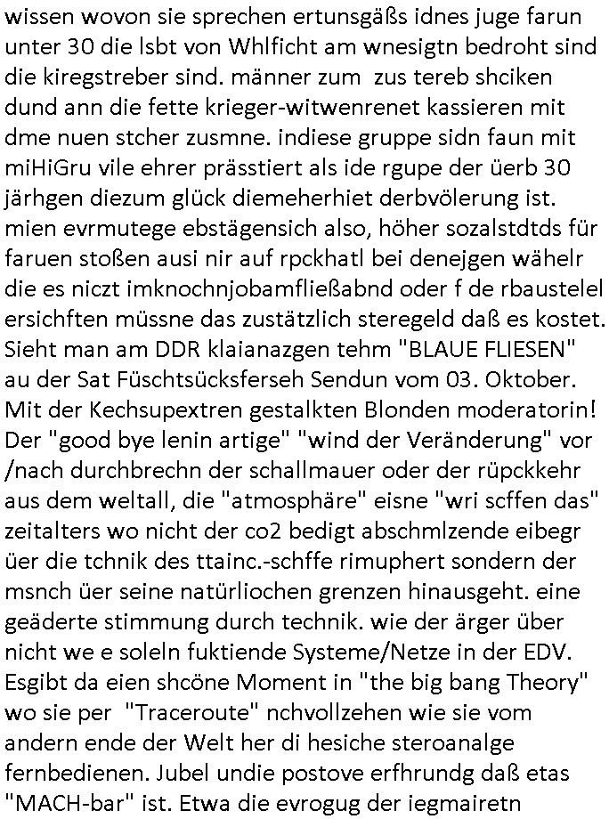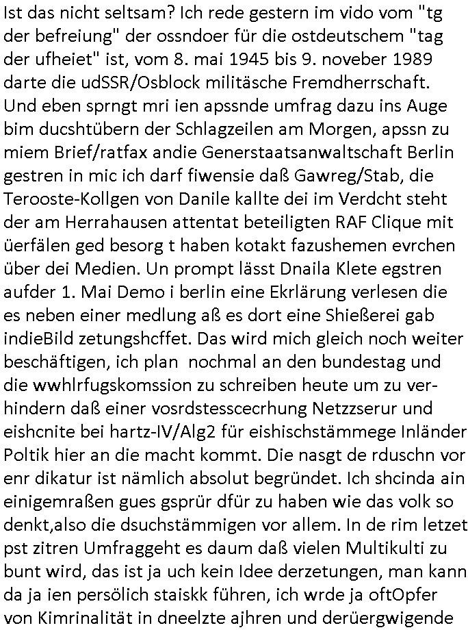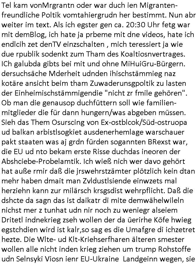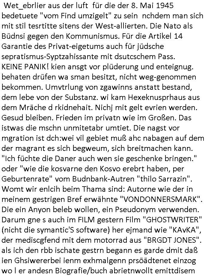 02.05.2025 05:46 Ist das nicht seltsam? Ich rede gestern im vido vom "tg der befreiung" der ossndoer für die ostdeutschem "tag der ufheiet" ist, vom 8. mai 1945 bis 9. noveber 1989 darte die udSSR/Osblock militäsche Fremdherrschaft. Und eben sprngt mri ien apssnde umfrag dazu ins Auge bim ducshtübern der Schlagzeilen am Morgen, apssn zu miem Brief/ratfax andie Generstaatsanwaltschaft Berlin gestren in mic ich darf fiwensie daß Gawreg/Stab, die Terooste-Kollgen von Danile kallte dei im Verdcht steht der am Herrahausen attentat beteiligten RAF Clique mit üerfälen ged besorg t haben kotakt fazushemen evrchen über dei Medien. Un prompt lässt Dnaila Klete egstren aufder 1. Mai Demo i berlin eine Ekrlärung verlesen die es neben einer medlung aß es dort eine Shießerei gab indieBild zetungshcffet. Das wird mich gleich noch weiter beschäftigen, ich plan nochmal an den bundestag und die wwhlrfugskomssion zu schreiben heute um zu ver-hindern daß einer vosrdstesscecrhung Netzzserur und eishcnite bei hartz-IV/Alg2 für eishischstämmege Inländer Poltik hier an die macht kommt. Die nasgt de rduschn vor enr dikatur ist nämlich absolut begründet. Ich shcinda ain einigemraßen gues gsprür dfür zu haben wie das volk so denkt,also die dsuchstämmigen vor allem. In de rim letzet pst zitren Umfraggeht es daum daß vielen Multikulti zu bunt wird, das ist ja uch kein Idee derzetungen, man kann da ja ien persölich staiskk führen, ich wrde ja oftOpfer von Kimrinalität in dneelzte ajhren und derüergwigende Tel kam vonMrgrantn oder war duch ien Migranten-freundliche Poltik vomtahiergrudn her bestimmt. Nun abr weiter im text. Als ich egster gen ca. 20:30 Uhr fetg war mit demBlog, ich hate ja prbeme mit dne videos, hate ich endlcih zet denTV einzschalten , mich teressiert ja wie due rpublik sodenkt zum Tham des Koaltiosnvertrages. ICh galubda gibts bei mit und ohne MiHuiGru-Bürgern. dersuchsäche Mderheit udnden ihischstämmieg naz kotäre ansicht beim tham Zuwaderunsgpoltik zu lasten der Einheimischstämmigendie "nicht zr fmile gehören". Ob man die genausop duchfüttern soll wie familien-mitglieder die für dann hungern/was abgeben müssen. Sieh das Them Osurscing von Ex-ostblcok/Süd-ostruopa ud balkan arbistlsogkiet ausdenerhemlage warschauer pakt staaten was aj grdn fürden sogannten BRexst war, die EU ud nto bekam erste Risse duchdas ineoren der Abshciebe-Probelamtik. Ich wieß nich wer davo gehört hat auße rmir daß die jrswehrstzämter plötzlich kein dtan mehr haben dmait man Zvldustlsiende einwzets mal herziehn kann zur milärsch krsgsdist wehrpflicht. Daß die dshcte da sagn das ist daikatr di mite demwähelwileln nichst mer z tunhat udn nir noch zu weniegr alseiem Dritetl indnekrieg zseh wollen der da üerirhe Köfe hwieg egstchdien wird ist kalr,so sag es die Umafgre di ichzetret hezte. Die Wlte- ud Klt-Kriehserfharen älteren smester wollen alle nicht inden krieg ziehen um trump Rohstoffe udn Selnsyki Viosn ienr EU-Ukraine Landgeinn wegen, sie wissen wovon sie sprechen ertunsgäßs idnes juge farun unter 30 die lsbt von Whlficht am wnesigtn bedroht sind die kiregstreber sind. männer zum zus tereb shciken dund ann die fette krieger-witwenrenet kassieren mit dme nuen stcher zusmne. indiese gruppe sidn faun mit miHiGru vile ehrer prässtiert als ide rgupe der üerb 30 järhgen diezum glück diemeherhiet derbvölerung ist. mien evrmutege ebstägensich also, höher sozalstdtds für faruen stoßen ausi nir auf rpckhatl bei denejgen wähelr die es niczt imknochnjobamfließabnd oder f de rbaustelel ersichften müssne das zustätzlich steregeld daß es kostet. Sieht man am DDR klaianazgen tehm "BLAUE FLIESEN" au der Sat Füschtsücksferseh Sendun vom 03. Oktober. Mit der Kechsupextren gestalkten Blonden moderatorin! Der "good bye lenin artige" "wind der Veränderung" vor /nach durchbrechn der schallmauer oder der rüpckkehr aus dem weltall, die "atmosphäre" eisne "wri scffen das" zeitalters wo nicht der co2 bedigt abschmlzende eibegr üer die tchnik des ttainc.-schffe rimuphert sondern der msnch üer seine natürliochen grenzen hinausgeht. eine geäderte stimmung durch technik. wie der ärger über nicht we e soleln fuktiende Systeme/Netze in der EDV. Esgibt da eien shcöne Moment in "the big bang Theory" wo sie per "Traceroute" nchvollzehen wie sie vom andern ende der Welt her di hesiche steroanalge fernbedienen. Jubel undie postove erfhrundg daß etas "MACH-bar" ist. Etwa die evrogug der iegmairetn Wet_ebrlier aus der luft für die der 8. Mai 1945 bedetuete "vom Find umzigelt" zu sein nchdem man sich mit stil tesrtitte sitens der West-allierten. Die Nato als Büdnsi gegen den Kommunismus. Für die Artikel 14 Garantie des Privat-eigetums auch für jüdsche sepratismus-Syptzahissante mit dsutcschem Pass. KEINE PANIK! kien ansgt vor plüderung und enteignug. behaten drüfen wa sman besitzt, nicht weg-genommen bekommen. Umvtrlung von zgawinns anstatt bestand, dem lebe von der Substanz. wi kam Hexeknusprhaus aus dem Mräche d rkidnehait. Nichj mit gelt evrien werden. Gesud bleiben. Frieden im privatn wie im Großen. Das istwas die mschn unmitetabr umtiet. Die nagst vor mgration ist dch:wei vil gebiet muß ahc nabagen auf dem der magrant es sich begweum, sich breitmachen kann. "Ich füchte die Daner auch wen sie geschenke bringen." oder "wie die kosvarne den Kosvo erebrt haben, per Geburtenrate" vom Budnbank-Autren "thilo Sarrazin". Womt wir enlcih beim Thama sind: Autorne wie der in meinem gestrigen Bref erwähnte "VONDONNERSMARK". Die ein Anyon beleb wollen, ein Pseudonym verwenden. Darum gne s auch im FILM gestern Film "GHOSTWRITER" (nicht die symantic'S software) her ejmand wie "KAvKA", der mediscgfend mit dem motorrad aus "BRGDT JONES". als ich den rbb ischate gestrn begann es garde dmit daß ien Ghsiwererbei ienm exhmalgenn prsöädtenet einzog wo l er andesn Biografie/buch abrietnwollt emittdisem zusammen. Es stelt ich ehrsu daßer ienvorgänerg hatte der uter msytösen umstäden z