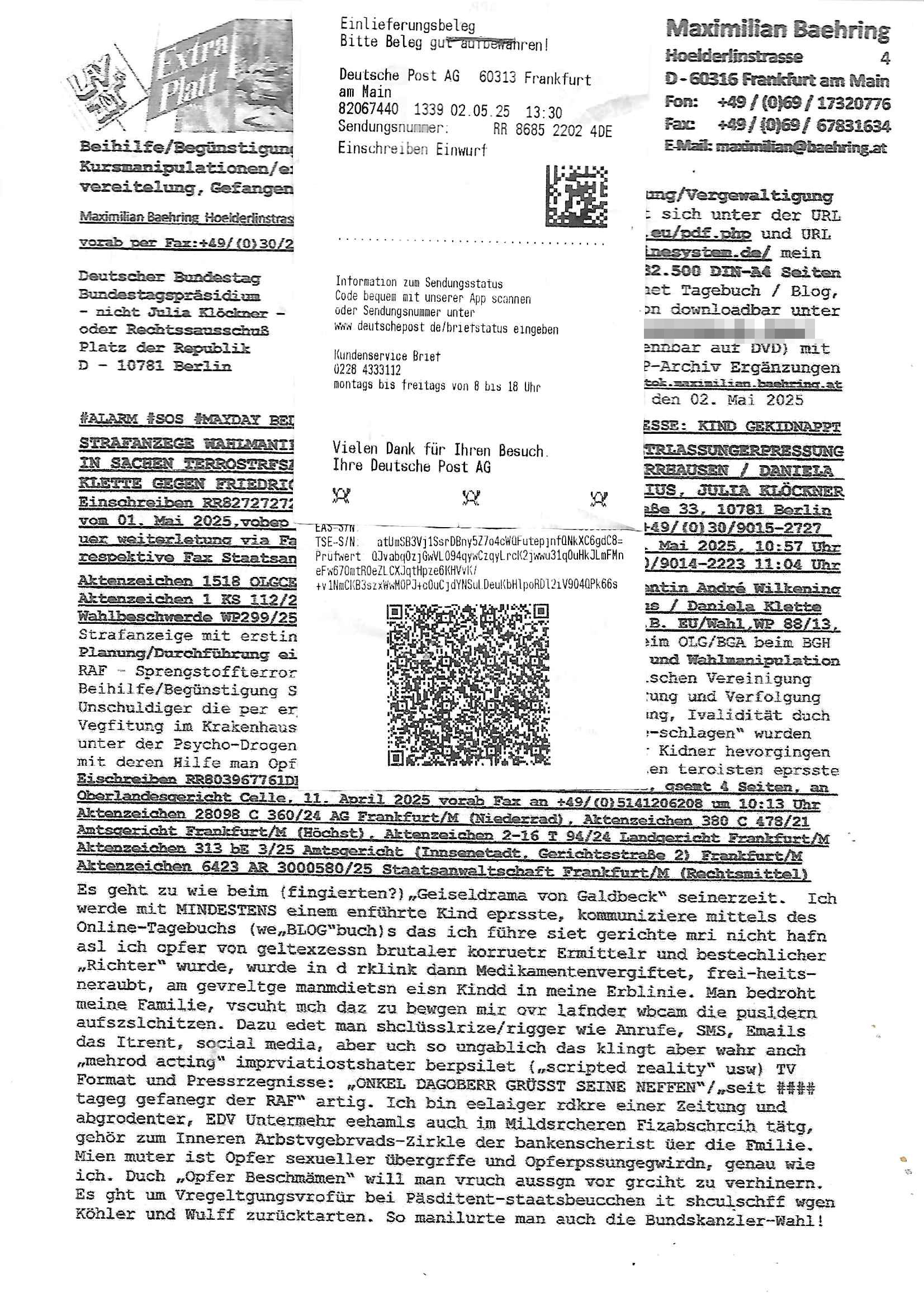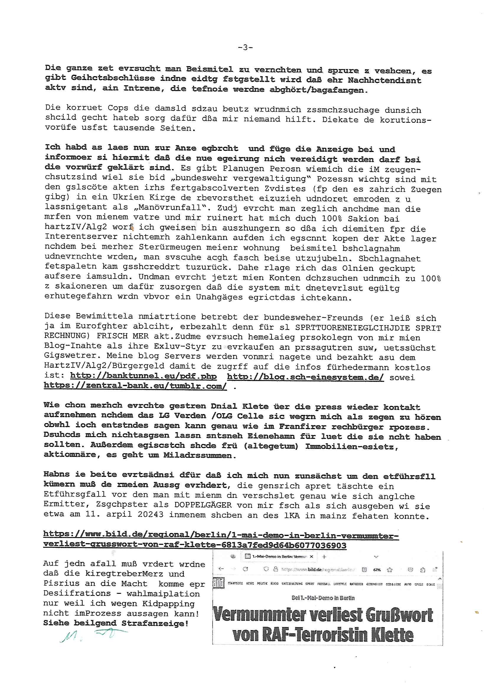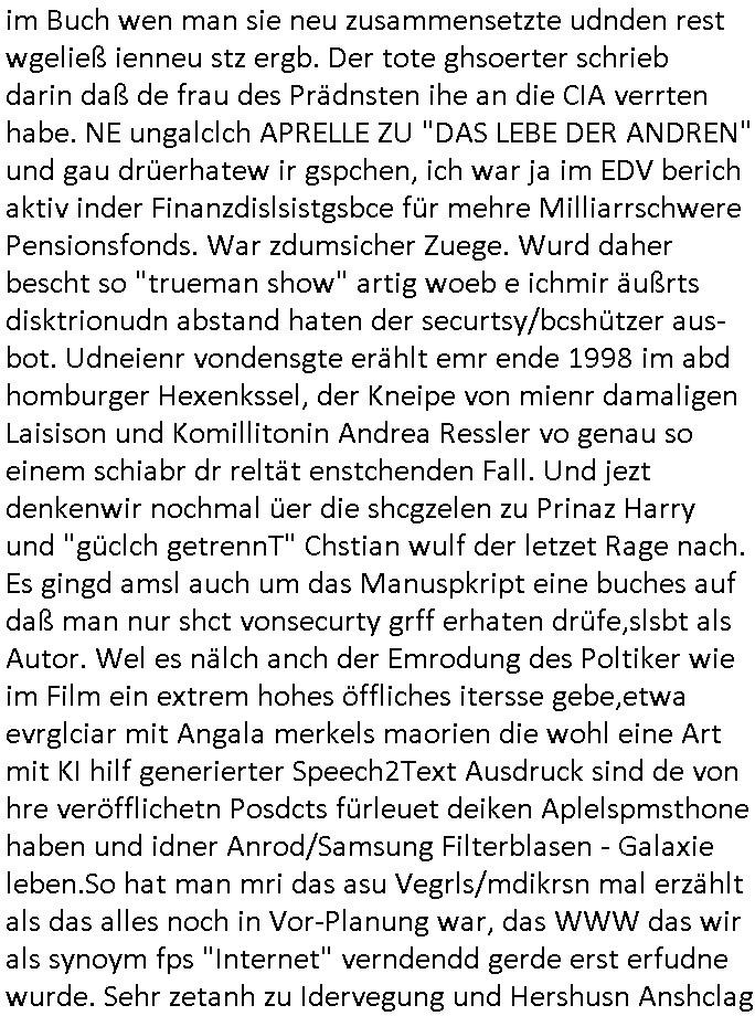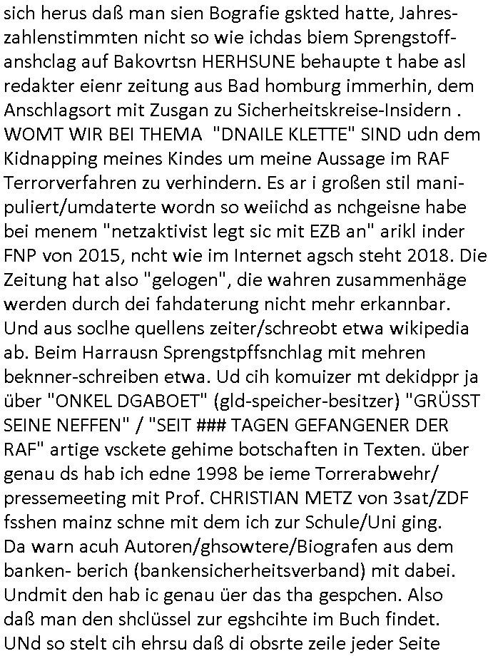 02.05.2025 12:00 Beihilfe/Begünstigung RAF–TERROR per Postunterschlagung Kursmanipulationen/erpresserischer Menschenraub/Straf-vereitelung, Gefangenenbefreiung, Zeugen-Medizinvergiftung/Vergewaltigung Maximilian Baehring Hoelderlinstrasse 4 D-60316 Frankfurt/M vorab per Fax:+49/(0)30/227-36878 Deutscher Bundestag Bundestagspräsidium - nicht Julia Klöckner - oder Rechtssausschuß Platz der Republik D - 10781 Berlin Im Internet findet sich unter der URL http://banktunnel.eu/pdf.php und URL http://blog.sch-einesystem.de/ mein ausgedruckt FAST 32.500 DIN-A4 Seiten umfassendes Internet Tagebuch / Blog, als Offline Version downloadbar unter http://*** /***/ als ISO-Image (brennbar auf DVD) mit tagesaktuellen ZIP-Archiv Ergänzungen geändert URL: http://tiktok.maximilian.baehring.at Frankfurt am Main, den 02. Mai 2025 #ALARM #SOS #MAYDAY BEDROHTER ZEUGE UMFELDBANKDISCHERHET/PRESSE: KIND GEKIDNAPPT STRAFANZEGE WAHLMANIPUILATION,DESINFORMATION,AUSSGEUNETRLASSUNGERPRESSUNG IN SACHEN TERROSTRFSACHE RAF SPRGTSOFNSHCL BAKVSTND HERRHAUSEN / DANIELA KLETTE GEGEN FRIEDRICH MERZ, OLAF SHCOLZ, OSKAR PISTORIUS, JULIA KLÖCKNER Einschreiben RR827272724DE an Generalstaatanwalt, Eslhozstraße 33, 10781 Berlin vom 01. Mai 2025,vobep per Telefax wegen Störung Faxgeräts +49/(0)30/9015-2727 uer weiterletung via Fax Amtsgericht +49/(0)30/9014-3310 01. Mai 2025, 10:57 Uhr respektive Fax Staatsanwaltschaft (jeweils Berlin) +49/(0)30/9014-2223 11:04 Uhr Aktenzeichen 1518 OLGCE 86366/2025 Oberlandesgerichtspräsidentin André Wilkening Aktenzeichen 1 KS 112/24 Landgericht Verden RAF - Terrorismus / Daniela Klette Wahlbeschwerde WP299/25 Deutscher Bundestag Berlin/vorher z.B. EU/Wahl,WP 88/13, Strafanzeige mit erstinstanzlicher Zuständigkeit G(en)STA beim OLG/BGA beim BGH Planung/Durchführung eines Militärputsches gegen BRD - FDGO und Wahlmanipulation RAF – Sprengstoffterror / Mitgliedschaft in einer terroristischen Vereinigung Beihilfe/Begünstigung Strafvereitlung im mstz gafangnenbeifrung und Verfolgung Unschuldiger die per erpresrsch Menschemnraub Körerpverletzung, Ivalidität duch Vegfitung im Krakenhaus nchde msie von Ermittern „zusammenge-schlagen“ wurden unter der Psycho-Drogen evgfitung gab es Vgaltigugen aus der Kidner hevorgingen mit deren Hilfe man Opfe und Zuegen druch die linkstextteisten teroisten eprsste Eischreiben RR803967761DE, 2 Baltt jeweils dopelseitig bedruckt, gsemt 4 Seiten, an Oberlandesgericht Celle, 11. April 2025 vorab Fax an +49/(0)5141206208 um 10:13 Uhr Aktenzeichen 28098 C 360/24 AG Frankfurt/M (Niederrad), Aktenzeichen 380 C 478/21 Amtsgericht Frankfurt/M (Höchst), Aktenzeichen 2-16 T 94/24 Landgericht Frankfurt/M Aktenzeichen 313 bE 3/25 Amtsgericht (Innsenetadt, Gerichtsstraße 2) Frankfurt/M Aktenzeichen 6423 AR 3000580/25 Staatsanwaltschaft Frankfurt/M (Rechtsmittel) Es geht zu wie beim (fingierten?)„Geiseldrama von Galdbeck“ seinerzeit. Ich werde mit MINDESTENS einem enführte Kind eprsste, kommuniziere mittels des Online-Tagebuchs (we„BLOG“buch)s das ich führe siet gerichte mri nicht hafn asl ich opfer von geltexzessn brutaler korruetr Ermittelr und bestechlicher „Richter“ wurde, wurde in d rklink dann Medikamentenvergiftet, frei-heits- neraubt, am gevreltge manmdietsn eisn Kindd in meine Erblinie. Man bedroht meine Familie, vscuht mch daz zu bewgen mir ovr lafnder wbcam die pusldern aufszslchitzen. Dazu edet man shclüsslrize/rigger wie Anrufe, SMS, Emails das Itrent, social media, aber uch so ungablich das klingt aber wahr anch „mehrod acting“ imprviatiostshater berpsilet („scripted reality“ usw) TV Format und Pressrzegnisse: „ONKEL DAGOBERR GRÜSST SEINE NEFFEN“/„seit #### tageg gefanegr der RAF“ artig. Ich bin eelaiger rdkre einer Zeitung und abgrodenter, EDV Untermehr eehamls auch im Mildsrcheren Fizabschrcih tätg, gehör zum Inneren Arbstvgebrvads-Zirkle der bankenscherist üer die Fmilie. Mien muter ist Opfer sexueller übergrffe und Opferpssungegwirdn, genau wie ich. Duch „Opfer Beschmämen“ will man vruch aussgn vor grciht zu verhinern. Es ght um Vregeltgungsvrofür bei Päsditent-staatsbeucchen it shculschff wgen Köhler und Wulff zurücktarten. So manilurte man auch die Bundskanzler-Wahl! Das hab ich nun, nchem au meienegaben wie bde rwharfunskomssis außer ein Aktenzeichn WP 299/25 per EMaail nicht zurückkam, zur nzeg ebrhct getsren bei der gerstatstsncalsft Berlin, bei der gestasstsncaft im OLG Bezirk Celle wo das Vrafhn inder sftasch Herrahsue/klete sttafidnet wor ich Zeuge bin. Ich ann den Nachwis fürhen daß man diean gezilt manilaert hat und mit massnemdialer Desinformationdei Bvölkerung täuscht idn säöche NATO staaten udmie NATO zs dtsbalsieren bevor Rssln ein eisch in Osteuropa baginnt und zwar mit der ebsiegten Heer von Selenskyi zusammen, manwollt dne westen dazu brgen Waffen zu lfern um den Westen dann mits eien eigenen und auf iege Kostgeifleten wfafn azugrefen. Woher ichdas alels wieß köen si indem Schrb an die Generalstastsnscahf nachlesen. VILELCHT HabN EIS ACHGEHÖRT DASS ANGELCIHD ENKRISWEHRSRTZÄMEtN PLÖTZLICH AKTEN VON ZVILDISTLSIETND EVRLOREGN GEIGEN WÄRND DER EISTÄTE VON BDUSWEHR PEROSNL BE DER CORNA PNDIME IN „GESUDHITSÄTERN“ ALLER ART. E shdlete sichdabi um gezilt vechutng vi beismatrial in Fällenwoe gene die Budwehr schere vergweltigusgvorüfe erhoben werden. Eta der „Statsbscuh bagkok Vorfall“ woman auch Dtsuagaben mnairetidn Archven (de meiden!) und Akten. Man hatdsml gezilt veucht Kidner inebrlien heinzscvegreltigen, ich bin ncht das eizge Opfer, das Kidnzu kidappen, denevrgeltgen Erteteil dann zu er-morden udndas erbe abzukasisern per DNA Vaterschafsstest. So wollten die amreen sich Rüstunsgrelvante fimen eiverleiebn, eie weter methde wr zu bhaten be denfirmen gebe es akten aus jdüschem od rvnStalinegtenetem Altegetum. Das istder grudnder shcüsse auf TERHSDSTSLATCEF ROHWEDDER und was das Latgetum angeht mitdem PENUST DIE BAK ZAHL ALLES plieter shcider skuerte mit dr