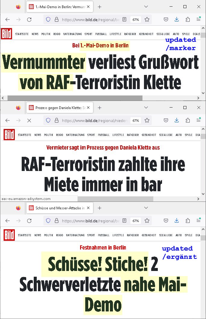 02.05.2025 05:47 1.-Mai-Demo in Berlin: Vermummter ... von RAF https://www.bild.de/regional/berlin/1-mai-demo-in-berlin-vermummter-verliest-grusswort-von-raf-klette-6813a7fed9d64b6077036903 https://www.bild.de/regional/niedersachsen/prozess-gegen-daniela-klette-so-taeuschte-die-mutmassliche-terroristin-ihren-vermieter-680f7c3b4ec0bd4a96836aab https://www.bild.de/regional/berlin/schuesse-und-messer-attacke-in-berlin-kreuzberg-taeter-auf-der-flucht-6813c5513d1e424593fdbe5a Schüsse! Stiche! ... nahe Mai-Demo updated: 02. Mai 2025 ca. 16:45 uhr beim speichern/hochalden ging ein screenshot, ergänzt und farbig markiert, nachfolgende beiträge verschieben sich dadurch möglicherweise ein wenig [0] "202505020547-0-1.jpg" |