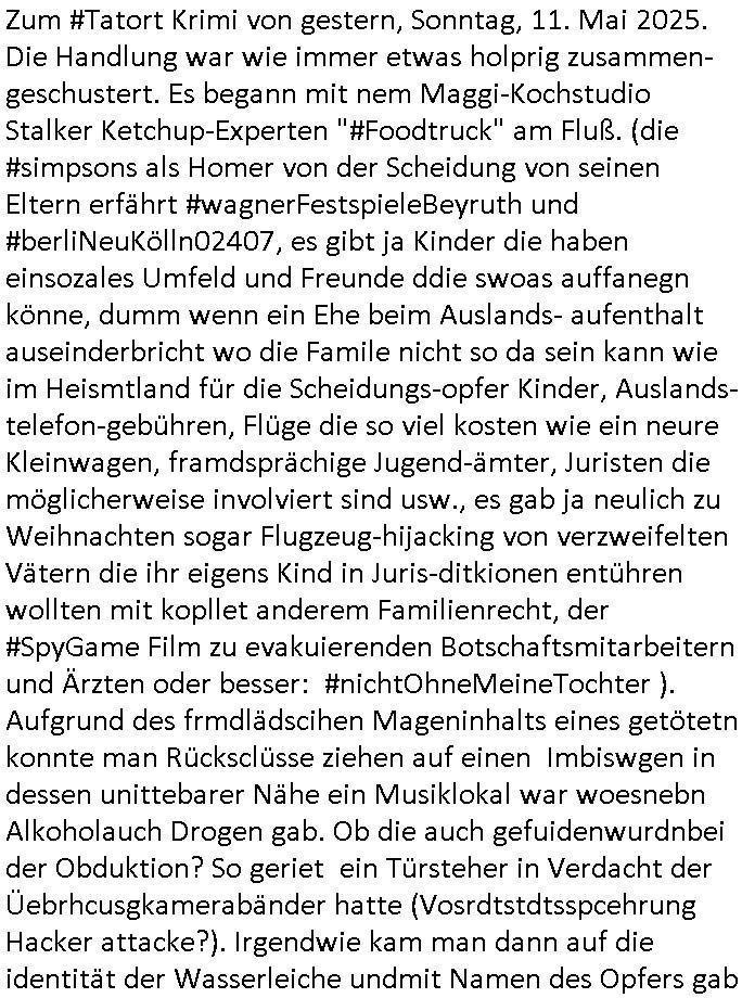 Zum #Tatort Krimi von gestern, Sonntag, 11. Mai 2025. Die Handlung war wie immer etwas holprig zusammen-geschustert. Es begann mit nem Maggi-Kochstudio Stalker Ketchup-Experten "#Foodtruck" am Fluß. (die #simpsons als Homer von der Scheidung von seinen Eltern erfährt #wagnerFestspieleBeyruth und #berliNeuKölln02407, es gibt ja Kinder die haben einsozales Umfeld und Freunde ddie swoas auffanegn könne, dumm wenn ein Ehe beim Auslands- aufenthalt auseinderbricht wo die Famile nicht so da sein kann wie im Heismtland für die Scheidungs-opfer Kinder, Auslands-telefon-gebühren, Flüge die so viel kosten wie ein neure Kleinwagen, framdsprächige Jugend-ämter, Juristen die möglicherweise involviert sind usw., es gab ja neulich zu Weihnachten sogar Flugzeug-hijacking von verzweifelten Vätern die ihr eigens Kind in Juris-ditkionen entühren wollten mit kopllet anderem Familienrecht, der #SpyGame Film zu evakuierenden Botschaftsmitarbeitern und Ärzten oder besser: #nichtOhneMeineTochter ). Aufgrund des frmdlädscihen Mageninhalts eines getötetn konnte man Rücksclüsse ziehen auf einen Imbiswgen in dessen unittebarer Nähe ein Musiklokal war woesnebn Alkoholauch Drogen gab. Ob die auch gefuidenwurdnbei der Obduktion? So geriet ein Türsteher in Verdacht der Üebrhcusgkamerabänder hatte (Vosrdtstdtsspcehrung Hacker attacke?). Irgendwie kam man dann auf die identität der Wasserleiche undmit Namen des Opfers gab