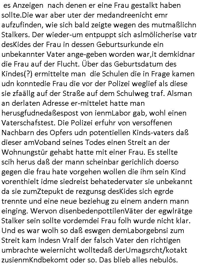 es Anzeigen nach denen er eine Frau gestalkt haben sollte.Die war aber uter der medandreenicht emr aufzufinden, wie sich bald zeigte wegen des mutmaßlichn Stalkers. Der wieder-um entpuppt sich aslmölicherise vatr desKides der Frau in dessen Geburtsurkunde ein unbekannter Vater ange-geben worden war,it demkidnar die Frau auf der Flucht. Über das Geburtsdatum des Kindes(?) ermittelte man die Schulen die in Frage kamen udn konntedie Frau die vor der Polizei weglief als diese sie zfaällg auf der Straße auf dem Schulweg traf. Alsman an derlaten Adresse er-mittelet hatte man herusgfudnedaßespost von ienmLabor gab, wohl einen Vaterschafstest. Die Polizei erfuhr von versoffenen Nachbarn des Opfers udn potentiellen Kinds-vaters daß dieser amVoband seines Todes einen Streit an der Wohnungstür gehabt hatte mit einer Frau. Es stellte scih herus daß der mann scheinbar gerichlich doerso gegen die frau hate vorgehen wollen die ihm sein Kind vorenthielt idme siedreist behatedervater sie unbekannt da sie zumZtepukt de rezgunsg desKides sich egrde trennte und eine neue beziehug zu einem andern mann einging. Wervon disenbedenpottilenVäter der egwlrätge Stalker sein sollte vordemdei Frau folh wurde nicht klar. Und es war wolh so daß eswgen demLaborgebnsi zum Streit kam indesn Vralf der falsch Vater den richtigen umbrachte weiernicht wolltedaß derUmagsrcht/kotakt zusienmKndbekomt oder so. Das blieb alles nebulös.