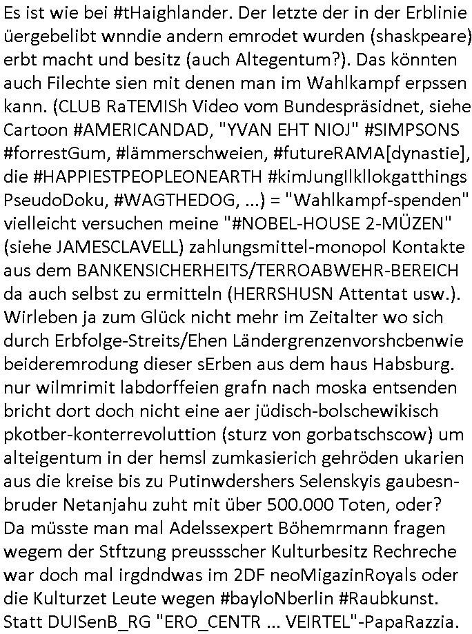 Es ist wie bei #tHaighlander. Der letzte der in der Erblinie üergebelibt wnndie andern emrodet wurden (shaskpeare) erbt macht und besitz (auch Altegentum?). Das könnten auch Filechte sien mit denen man im Wahlkampf erpssen kann. (CLUB RaTEMISh Video vom Bundespräsidnet, siehe Cartoon #AMERICANDAD, "YVAN EHT NIOJ" #SIMPSONS #forrestGum, #lämmerschweien, #futureRAMA[dynastie], die #HAPPIESTPEOPLEONEARTH #kimJungIlkllokgatthings PseudoDoku, #WAGTHEDOG, ...) = "Wahlkampf-spenden" vielleicht versuchen meine "#NOBEL-HOUSE 2-MÜZEN" (siehe JAMESCLAVELL) zahlungsmittel-monopol Kontakte aus dem BANKENSICHERHEITS/TERROABWEHR-BEREICH da auch selbst zu ermitteln (HERRSHUSN Attentat usw.). Wirleben ja zum Glück nicht mehr im Zeitalter wo sich durch Erbfolge-Streits/Ehen Ländergrenzenvorshcbenwie beideremrodung dieser sErben aus dem haus Habsburg. nur wilmrimit labdorffeien grafn nach moska entsenden bricht dort doch nicht eine aer jüdisch-bolschewikisch pkotber-konterrevoluttion (sturz von gorbatschscow) um alteigentum in der hemsl zumkasierich gehröden ukarien aus die kreise bis zu Putinwdershers Selenskyis gaubesn-bruder Netanjahu zuht mit über 500.000 Toten, oder? Da müsste man mal Adelssexpert Böhemrmann fragen wegem der Stftzung preussscher Kulturbesitz Rechreche war doch mal irgdndwas im 2DF neoMigazinRoyals oder die Kulturzet Leute wegen #bayloNberlin #Raubkunst. Statt DUISenB_RG "ERO_CENTR ... VEIRTEL"-PapaRazzia.