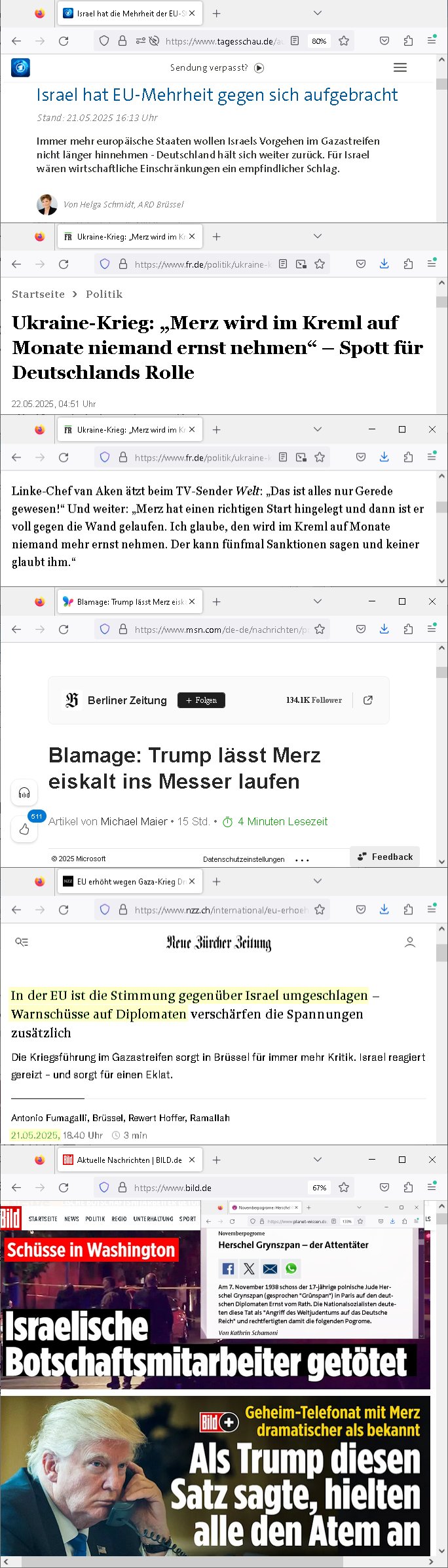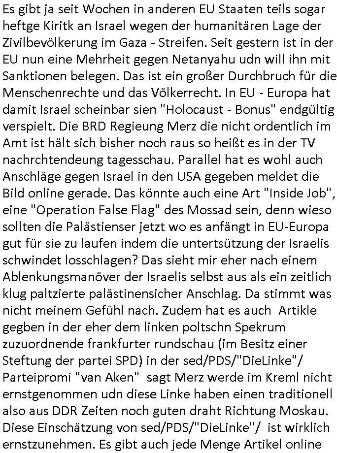 Es gibt ja seit Wochen in anderen EU Staaten teils sogar heftge Kiritk an Israel wegen der humanitären Lage der Zivilbevölkerung im Gaza - Streifen. Seit gestern ist in der EU nun eine Mehrheit gegen Netanyahu udn will ihn mit Sanktionen belegen. Das ist ein großer Durchbruch für die Menschenrechte und das Völkerrecht. In EU - Europa hat damit Israel scheinbar sien "Holocaust - Bonus" endgültig verspielt. Die BRD Regieung Merz die nicht ordentlich im Amt ist hält sich bisher noch raus so heißt es in der TV nachrchtendeung tagesschau. Parallel hat es wohl auch Anschläge gegen Israel in den USA gegeben meldet die Bild online gerade. Das könnte auch eine Art "Inside Job", eine "Operation False Flag" des Mossad sein, denn wieso sollten die Palästienser jetzt wo es anfängt in EU-Europa gut für sie zu laufen indem die untertsützung der Israelis schwindet losschlagen? Das sieht mir eher nach einem Ablenkungsmanöver der Israelis selbst aus als ein zeitlich klug paltzierte palästinensicher Anschlag. Da stimmt was nicht meinem Gefühl nach. Zudem hat es auch Artikle gegben in der eher dem linken poltschn Spekrum zuzuordnende frankfurter rundschau (im Besitz einer Steftung der partei SPD) in der sed/PDS/"DieLinke"/ Parteipromi "van Aken" sagt Merz werde im Kreml nicht ernstgenommen udn diese Linke haben einen traditionell also aus DDR Zeiten noch guten draht Richtung Moskau. Diese Einschätzung von sed/PDS/"DieLinke"/ ist wirklich ernstzunehmen. Es gibt auch jede Menge Artikel online