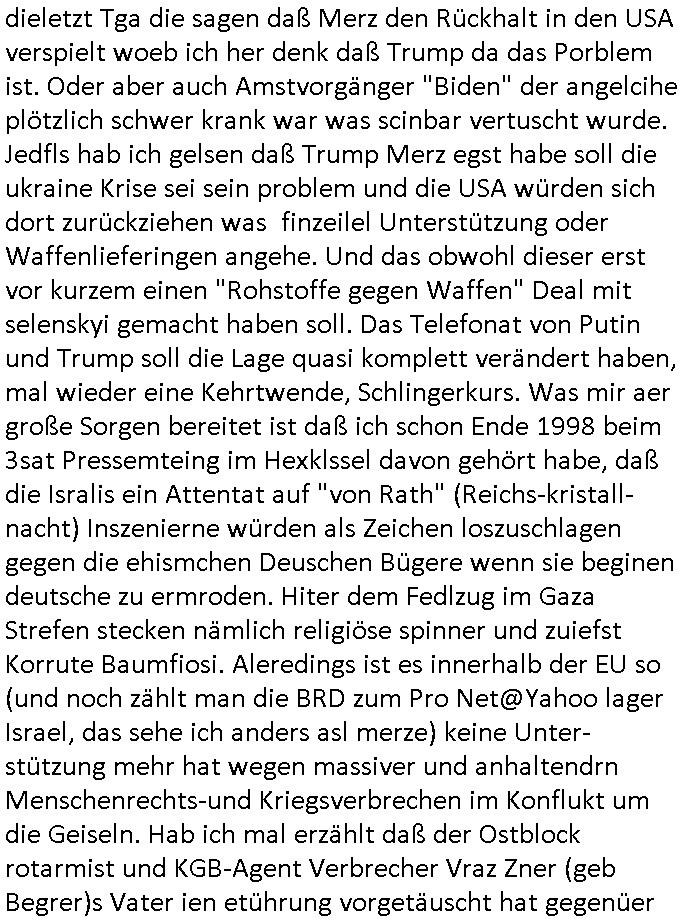 dieletzt Tga die sagen daß Merz den Rückhalt in den USA verspielt woeb ich her denk daß Trump da das Porblem ist. Oder aber auch Amstvorgänger "Biden" der angelcihe plötzlich schwer krank war was scinbar vertuscht wurde. Jedfls hab ich gelsen daß Trump Merz egst habe soll die ukraine Krise sei sein problem und die USA würden sich dort zurückziehen was finzeilel Unterstützung oder Waffenlieferingen angehe. Und das obwohl dieser erst vor kurzem einen "Rohstoffe gegen Waffen" Deal mit selenskyi gemacht haben soll. Das Telefonat von Putin und Trump soll die Lage quasi komplett verändert haben, mal wieder eine Kehrtwende, Schlingerkurs. Was mir aer große Sorgen bereitet ist daß ich schon Ende 1998 beim 3sat Pressemteing im Hexklssel davon gehört habe, daß die Isralis ein Attentat auf "von Rath" (Reichs-kristall-nacht) Inszenierne würden als Zeichen loszuschlagen gegen die ehismchen Deuschen Bügere wenn sie beginen deutsche zu ermroden. Hiter dem Fedlzug im Gaza Strefen stecken nämlich religiöse spinner und zuiefst Korrute Baumfiosi. Aleredings ist es innerhalb der EU so (und noch zählt man die BRD zum Pro Net@Yahoo lager Israel, das sehe ich anders asl merze) keine Unter-stützung mehr hat wegen massiver und anhaltendrn Menschenrechts-und Kriegsverbrechen im Konflukt um die Geiseln. Hab ich mal erzählt daß der Ostblock rotarmist und KGB-Agent Verbrecher Vraz Zner (geb Begrer)s Vater ien etührung vorgetäuscht hat gegenüer