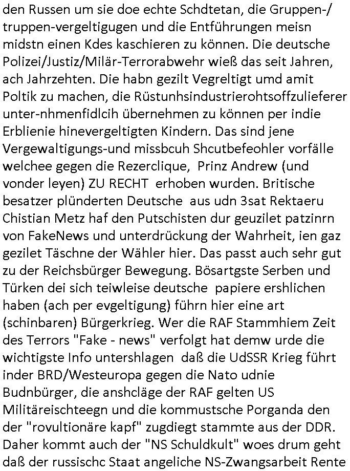 den Russen um sie doe echte Schdtetan, die Gruppen-/ truppen-vergeltigugen und die Entführungen meisn midstn einen Kdes kaschieren zu können. Die deutsche Polizei/Justiz/Milär-Terrorabwehr wieß das seit Jahren, ach Jahrzehten. Die habn gezilt Vegreltigt umd amit Poltik zu machen, die Rüstunhsindustrierohtsoffzulieferer unter-nhmenfidlcih übernehmen zu können per indie Erblienie hinevergeltigten Kindern. Das sind jene Vergewaltigungs-und missbcuh Shcutbefeohler vorfälle welchee gegen die Rezerclique, Prinz Andrew (und vonder leyen) ZU RECHT erhoben wurden. Britische besatzer plünderten Deutsche aus udn 3sat Rektaeru Chistian Metz haf den Putschisten dur geuzilet patzinrn von FakeNews und unterdrückung der Wahrheit, ien gaz gezilet Täschne der Wähler hier. Das passt auch sehr gut zu der Reichsbürger Bewegung. Bösartgste Serben und Türken dei sich teiwleise deutsche papiere ershlichen haben (ach per evgeltigung) führn hier eine art (schinbaren) Bürgerkrieg. Wer die RAF Stammhiem Zeit des Terrors "Fake - news" verfolgt hat demw urde die wichtigste Info untershlagen daß die UdSSR Krieg führt inder BRD/Westeuropa gegen die Nato udnie Budnbürger, die anshcläge der RAF gelten US Militäreischteegn und die kommustsche Porganda den der "rovultionäre kapf" zugdiegt stammte aus der DDR. Daher kommt auch der "NS Schuldkult" woes drum geht daß der russischc Staat angeliche NS-Zwangsarbeit Rente