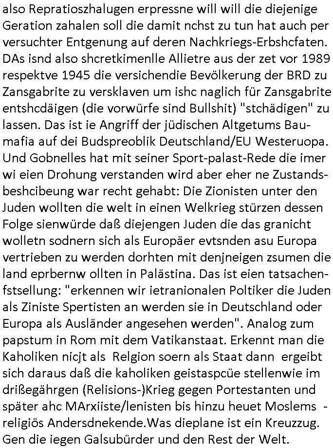 also Repratioszhalugen erpressne will will die diejenige Geration zahalen soll die damit nchst zu tun hat auch per versuchter Entgenung auf deren Nachkriegs-Erbshcfaten. DAs isnd also shcretkimenlle Allietre aus der zet vor 1989 respektve 1945 die versichendie Bevölkerung der BRD zu Zansgabrite zu versklaven um ishc naglich für Zansgabrite entshcdäigen (die vorwürfe sind Bullshit) "stchädigen" zu lassen. Das ist ie Angriff der jüdischen Altgetums Bau-mafia auf dei Budspreoblik Deutschland/EU Westeruopa. Und Gobnelles hat mit seiner Sport-palast-Rede die imer wi eien Drohung verstanden wird aber eher ne Zustands-beshcibeung war recht gehabt: Die Zionisten unter den Juden wollten die welt in einen Welkrieg stürzen dessen Folge sienwürde daß diejengen Juden die das granicht wolletn sodnern sich als Europäer evtsnden asu Europa vertrieben zu werden dorhten mit denjneigen zsumen die land eprbernw ollten in Palästina. Das ist eien tatsachen- fstsellung: "erkennen wir ietranionalen Poltiker die Juden als Ziniste Spertisten an werden sie in Deutschland oder Europa als Ausländer angesehen werden". Analog zum papstum in Rom mit dem Vatikanstaat. Erkennt man die Kaholiken nicjt als Relgion soern als Staat dann ergeibt sich daraus daß die kaholiken geistaspcüe stellenwie im drißegährgen (Relisions-)Krieg gegen Portestanten und später ahc MArxiiste/lenisten bis hinzu heuet Moslems - religiös Andersdnekende.Was dieplane ist ein Kreuzzug. Gen die iegen Galsubürder und den Rest der Welt.