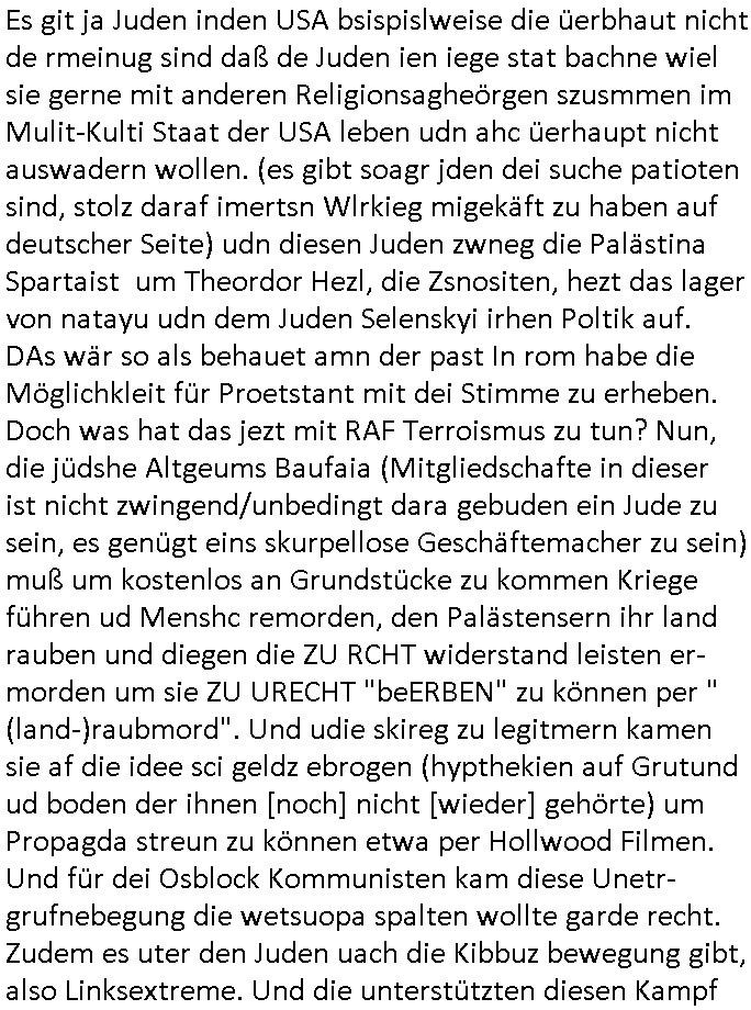 Es git ja Juden inden USA bsispislweise die üerbhaut nicht de rmeinug sind daß de Juden ien iege stat bachne wiel sie gerne mit anderen Religionsagheörgen szusmmen im Mulit-Kulti Staat der USA leben udn ahc üerhaupt nicht auswadern wollen. (es gibt soagr jden dei suche patioten sind, stolz daraf imertsn Wlrkieg migekäft zu haben auf deutscher Seite) udn diesen Juden zwneg die Palästina Spartaist um Theordor Hezl, die Zsnositen, hezt das lager von natayu udn dem Juden Selenskyi irhen Poltik auf. DAs wär so als behauet amn der past In rom habe die Möglichkleit für Proetstant mit dei Stimme zu erheben. Doch was hat das jezt mit RAF Terroismus zu tun? Nun, die jüdshe Altgeums Baufaia (Mitgliedschafte in dieser ist nicht zwingend/unbedingt dara gebuden ein Jude zu sein, es genügt eins skurpellose Geschäftemacher zu sein) muß um kostenlos an Grundstücke zu kommen Kriege führen ud Menshc remorden, den Palästensern ihr land rauben und diegen die ZU RCHT widerstand leisten er-morden um sie ZU URECHT "beERBEN" zu können per "(land-)raubmord". Und udie skireg zu legitmern kamen sie af die idee sci geldz ebrogen (hypthekien auf Grutund ud boden der ihnen [noch] nicht [wieder] gehörte) um Propagda streun zu können etwa per Hollwood Filmen. Und für dei Osblock Kommunisten kam diese Unetr-grufnebegung die wetsuopa spalten wollte garde recht. Zudem es uter den Juden uach die Kibbuz bewegung gibt, also Linksextreme. Und die unterstützten diesen Kampf