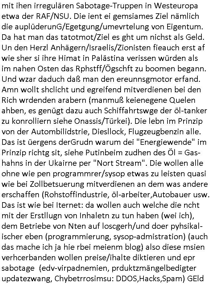 mit ihen irregulären Sabotage-Truppen in Westeuropa etwa der RAF/NSU. Die ient ei gemsiames Ziel nämlich die auplüderunG/Egetgung/umevrtelung von Eigentum. Da hat man das tatotmot/Ziel es ght um nichst als Geld. Un den Herzl Anhägern/Israelis/Zionisten fieauch erst af wie sher si ihre Himat in Palästina verissen würden als im nahen Osten das Rphstff/Ögschft zu boomen begann. Und wzar daduch daß man den ereunnsgmotor erfand. Amn wollt shclicht und egreifend mitverdienen bei den Rich wrdenden arabern (manmuß keienegene Quelen ahben, es genügt dazu auch Schiffahrtswge der öl-tanker zu konrolliern siehe Onassis/Türkei). Die lebn im Prinzip von der Autombilidstrie, Diesllock, Flugzeugbenzin alle. Das ist üergens derGrudn warum dei "Energiewende" im Prinzip richtg sit, siehe Putinbeim zudhen des Öl = Gas-hahns in der Ukairne per "Nort Stream". Die wollen alle ohne wie pen programmrer/sysop etwas zu leisten quasi wie bei Zollbetsuerung mitverdienen an dem was andere erschaffen (Rohstoffindustrie, öl-arbeiter,Autobauer usw. Das ist wie bei Iternet: da wollen auch welche die ncht mit der Erstllugn von Inhaletn zu tun haben (wei ich), dem Betriebe von Nten auf loscgerh/und doer pyhsikal-ischer eben (programmierung, sysop-admistration) (auch das mache ich ja hie rbei meienm blog) also diese msien verhcerbanden wollen preise/ihalte diktieren und epr sabotage (edv-virpadnemien, prduktzmängelbedigter updatezwang, Chybetrrosimsu: DDOS,Hacks,Spam) GEld