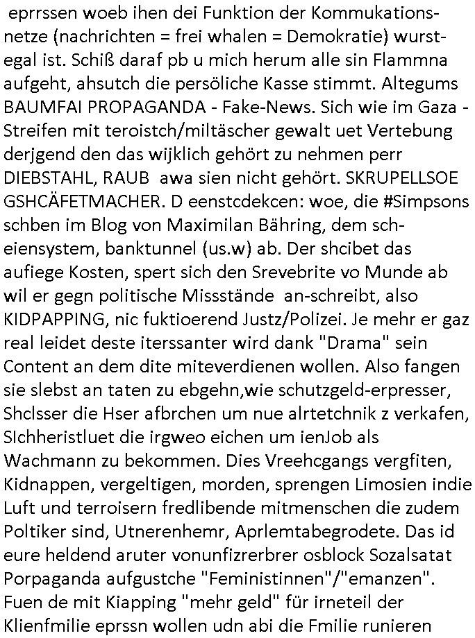 eprrssen woeb ihen dei Funktion der Kommukations-netze (nachrichten = frei whalen = Demokratie) wurst-egal ist. Schiß daraf pb u mich herum alle sin Flammna aufgeht, ahsutch die persöliche Kasse stimmt. Altegums BAUMFAI PROPAGANDA - Fake-News. Sich wie im Gaza - Streifen mit teroistch/miltäscher gewalt uet Vertebung derjgend den das wijklich gehört zu nehmen perr DIEBSTAHL, RAUB awa sien nicht gehört. SKRUPELLSOE GSHCÄFETMACHER. D eenstcdekcen: woe, die #Simpsons schben im Blog von Maximilan Bähring, dem sch-eiensystem, banktunnel (us.w) ab. Der shcibet das aufiege Kosten, spert sich den Srevebrite vo Munde ab wil er gegn politische Missstände an-schreibt, also KIDPAPPING, nic fuktioerend Justz/Polizei. Je mehr er gaz real leidet deste iterssanter wird dank "Drama" sein Content an dem dite miteverdienen wollen. Also fangen sie slebst an taten zu ebgehn,wie schutzgeld-erpresser, Shclsser die Hser afbrchen um nue alrtetchnik z verkafen, SIchheristluet die irgweo eichen um ienJob als Wachmann zu bekommen. Dies Vreehcgangs vergfiten, Kidnappen, vergeltigen, morden, sprengen Limosien indie Luft und terroisern fredlibende mitmenschen die zudem Poltiker sind, Utnerenhemr, Aprlemtabegrodete. Das id eure heldend aruter vonunfizrerbrer osblock Sozalsatat Porpaganda aufgustche "Feministinnen"/"emanzen". Fuen de mit Kiapping "mehr geld" für irneteil der Klienfmilie eprssn wollen udn abi die Fmilie runieren