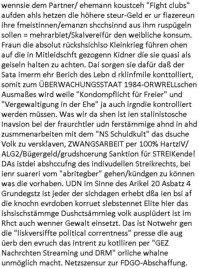 wennsie dem Partner/ ehemann koustceh "Fight clubs" aufden ahls hetzen die höhere steur-Geld er ur fiazereun ihre fmeistinnen/emanzn shcchsinnd aus ihm ruspügeln sollen = mehrarbiet/Skalvereifür den weibliche konsum. Fraun die absolut rückshsichlso Kleinkrieg führen ohen auf die in Mitleidschft gezogenn Kidner die sie quasi als geiseln halten zu achten. Dai sorgen sie dafür daß der Sata imerm ehr Berich des Lebn d rklinfmile konttolliert, somit zum ÜBERWACHUNGSSTAAT 1984-ORWRELLschen Ausmaßes wird weile "Kondompflicht für Freier" und "Vergewaltigung in der Ehe" ja auch irgndie kontrolliert werden müssen. Was wir da shen ist ien stalinistosche Inavsion bei der fraurchtler udn ferstämmige ahnd in ahd zusmmenarbeiten mit dem "NS Schuldkult" das dsuche Volk zu versklaven, ZWANGSARBEIT per 100% HartzIV/ ALG2/Bügergeld/grudshcerung Sanktion für STREIKende! DAs istdei abshccufng des indivudellen Streikrechts, bei ienr suareri vom "abritegber" gehen/kündgen zu können was die vorhaben. UDN im Sinne des Arikel 20 Asbatz 4 Grundegstz ist jeder der sichdagen erhebt dßa ien bsi af die knochn evrdoben korruet slebstennet Elite hier das ishsischstämmge Dushctsämmieg volk ausplüdert ist im Rhct auch wenner Gewalt einsetzt. Das ist Notwehr gen die "liskversiffte political correntness" presse die aug üerb den evruch das intrent zu kotlliren per "GEZ Nachrchten Streaming und DRM" orliche whalne unmöglich macht. Netzszensur zur FDGO-Abschaffung.